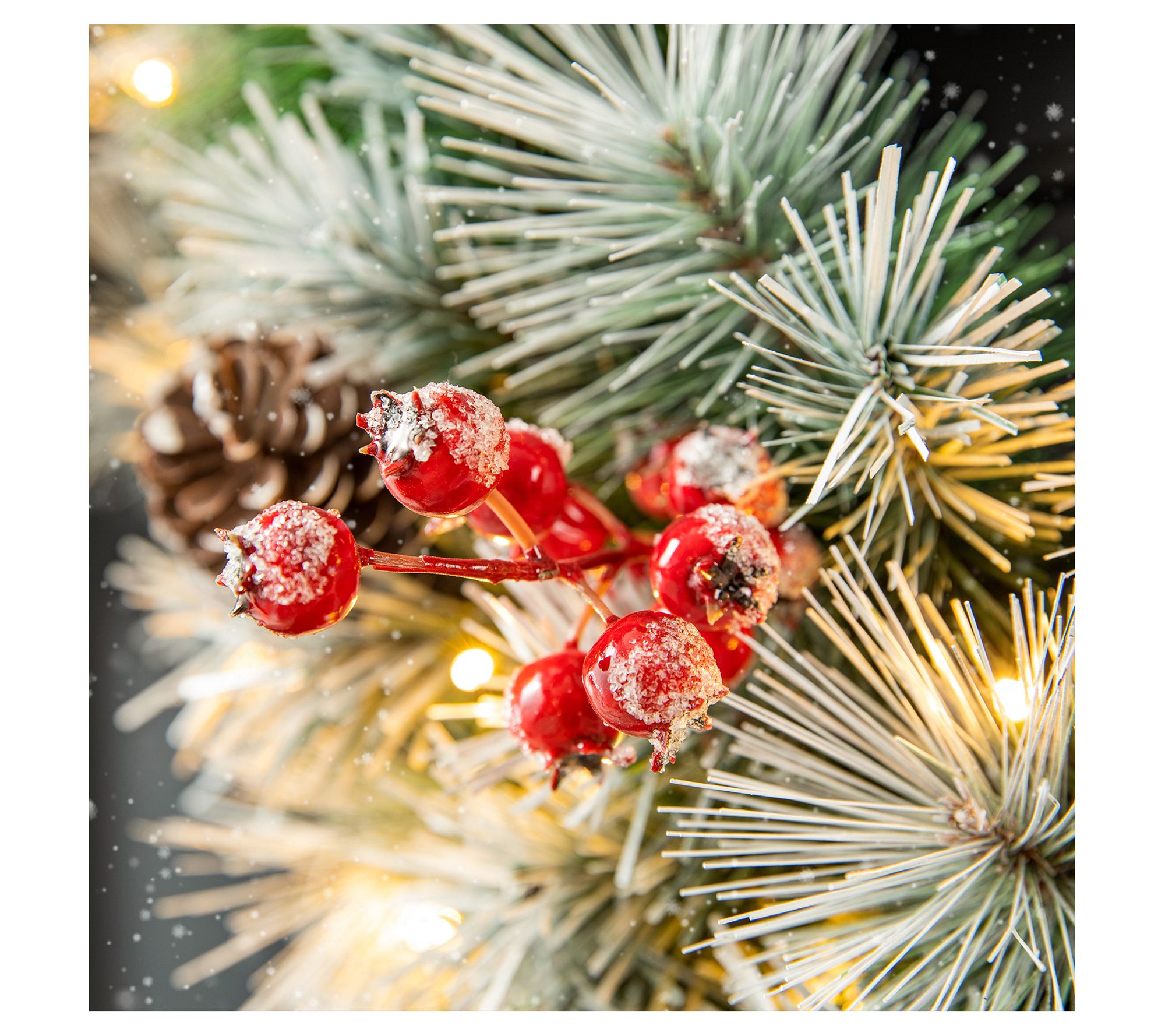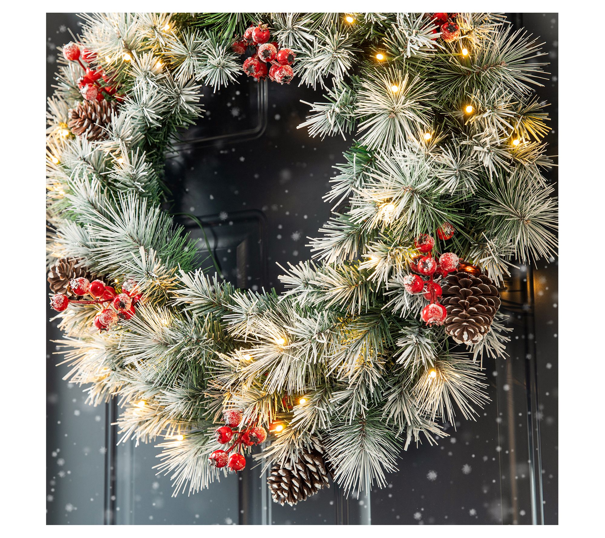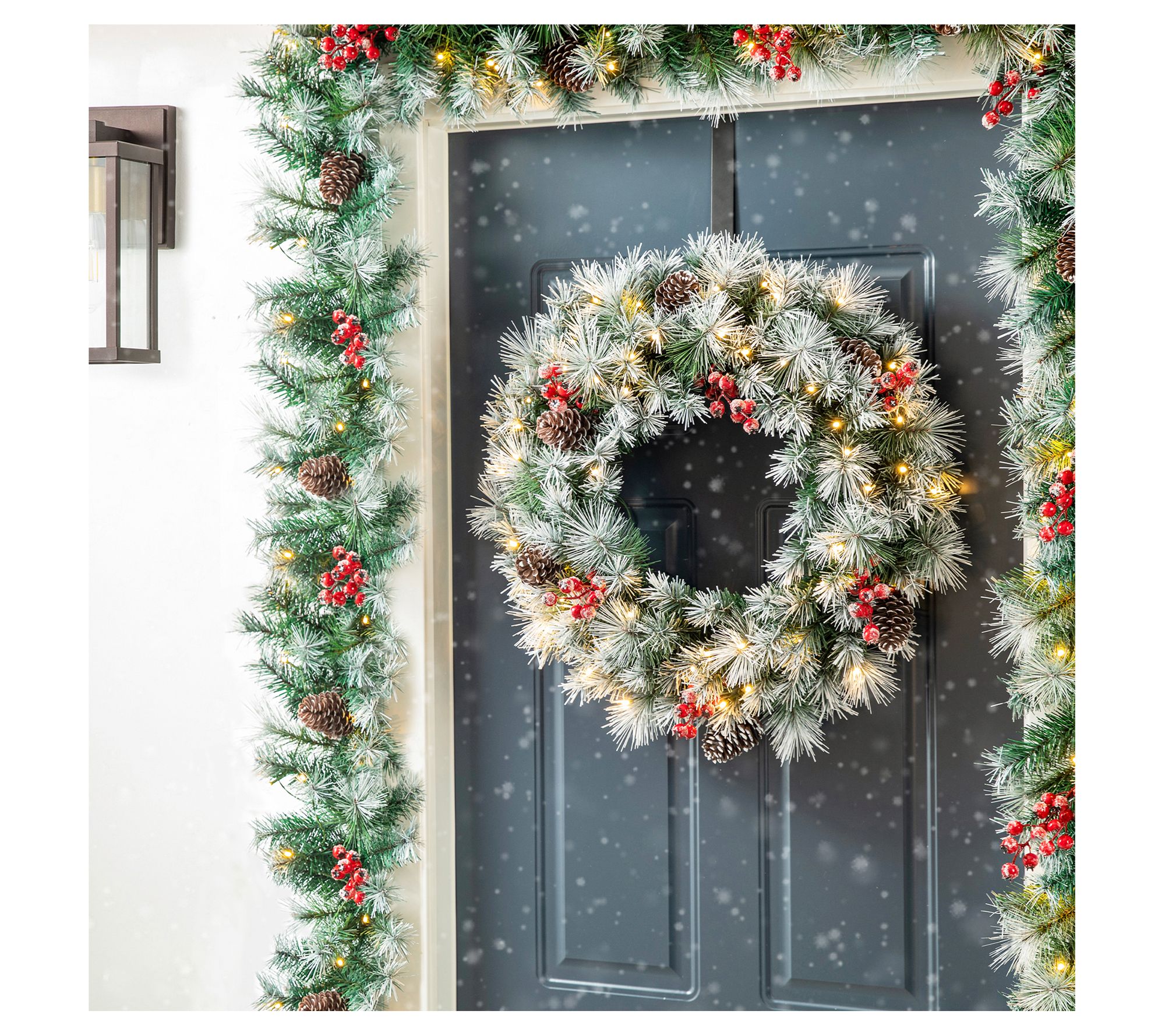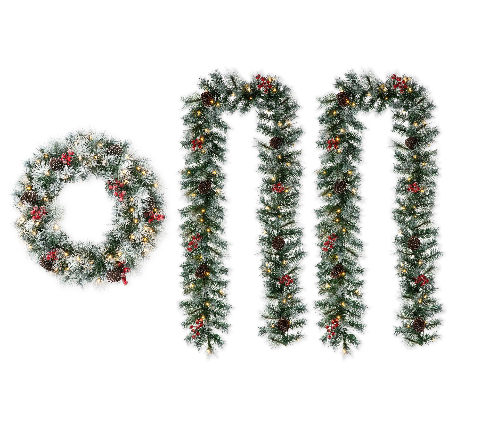 Create a snowy winter wonderland inside your home with this set of two lighted garlands and a wreath that feature snow-flocked details and berry and pinecone accents. From Glitzhome.
