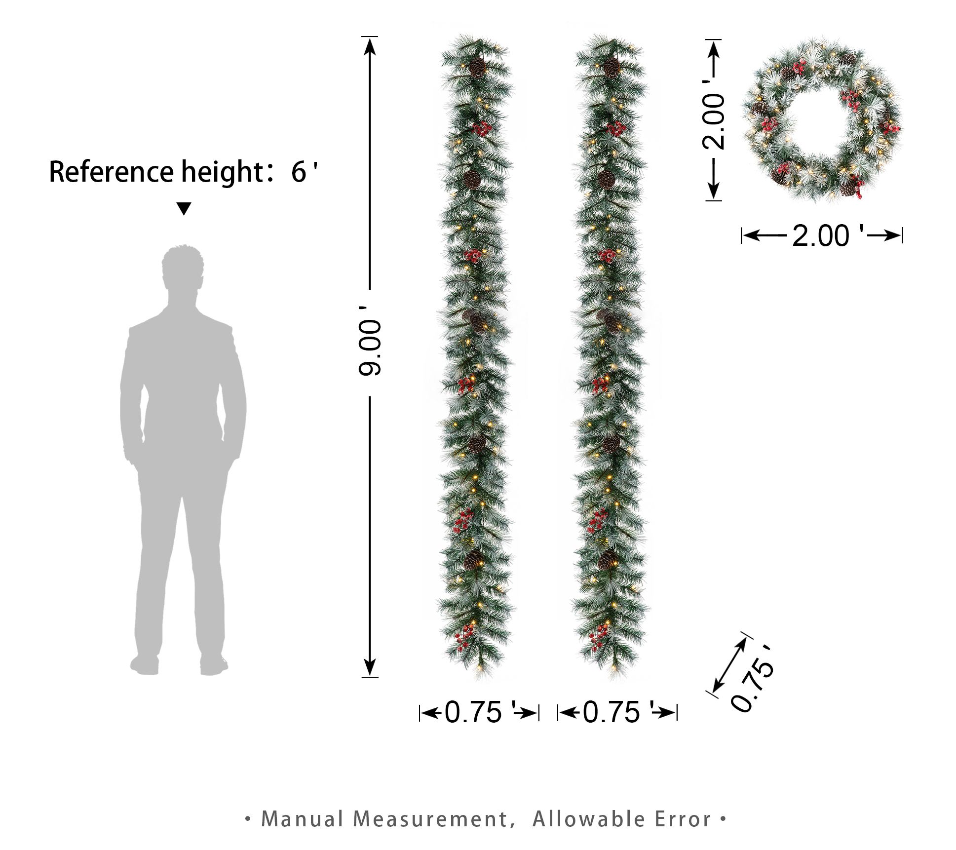 • Measures approximately: Garland 108"L x 9.75"W x 9.75"H; Wreath 4"L x 24"W x 24"H
