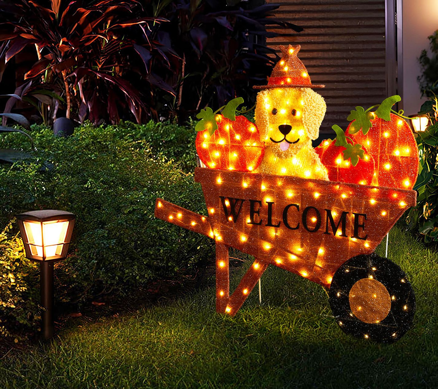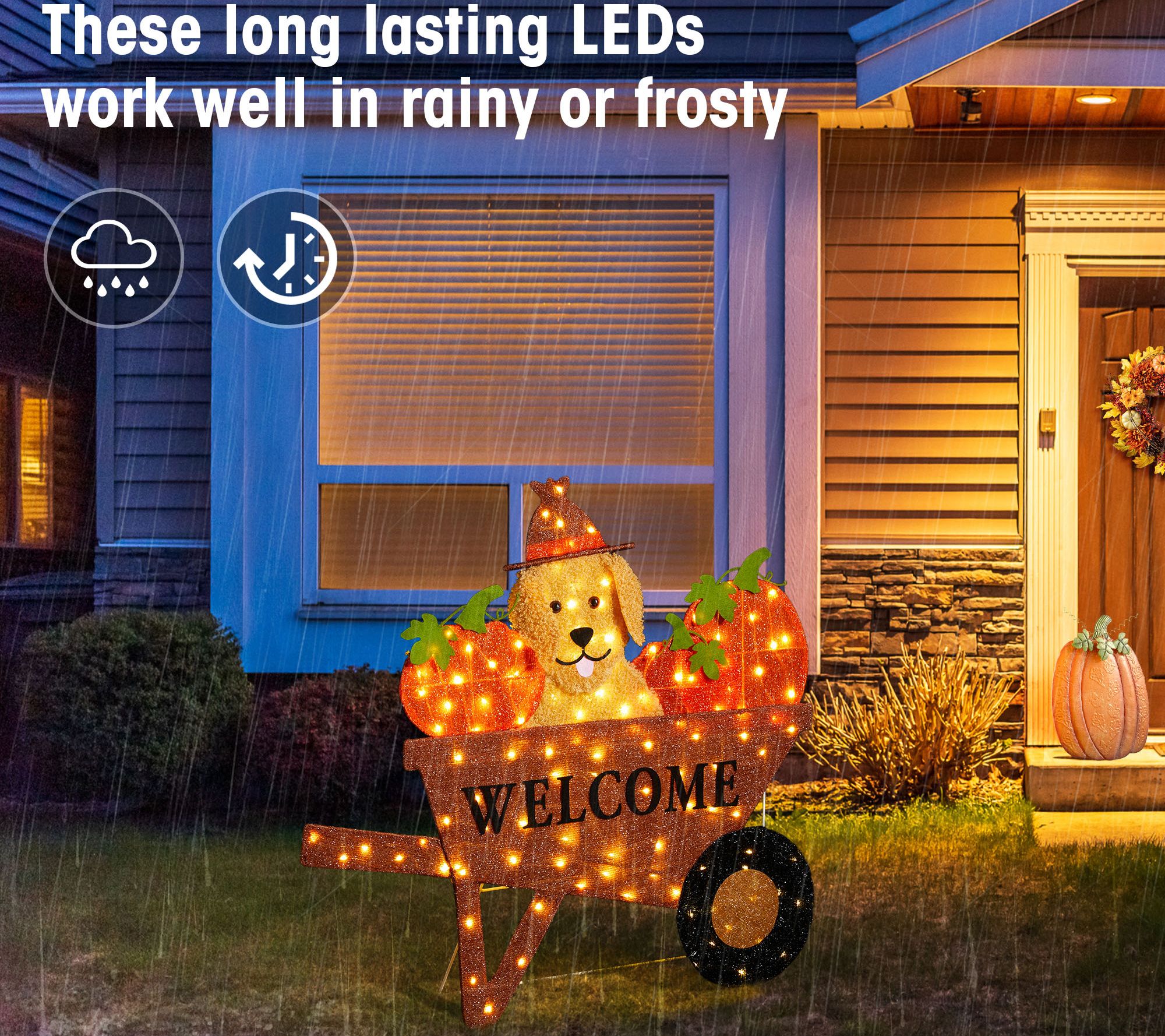 Brighten up autumn evenings as soft white lights glow from a cheerful Labrador perched in a wheelbarrow full of pumpkins. This playful scene brings warmth to porches, gardens, or along your walkway, sparking smiles for all who pass by. Timer function keeps things simple -- just set it and return to a cozy homecoming each night. From Glitzhome.