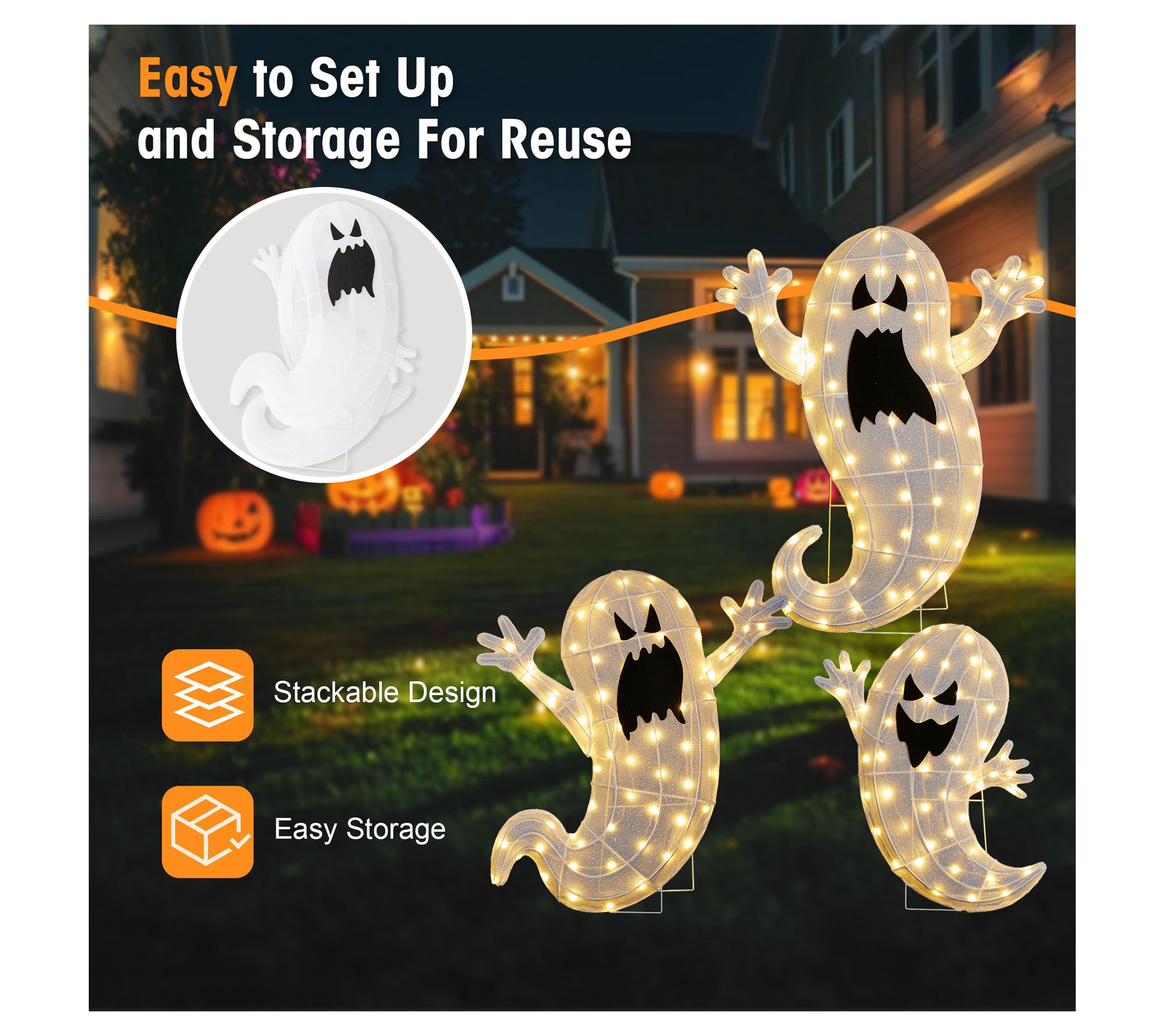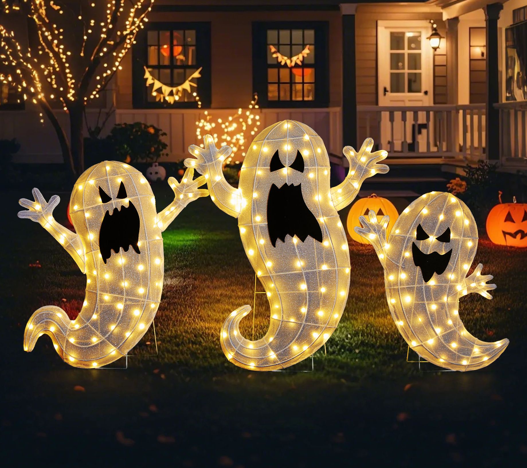 Create a scene on your lawn that welcomes trick-or-treaters and delights neighbors with a glowing trio of friendly spirits. Dressed in soft, warm white LED light, this ghost family brings a cheerful Halloween vibe -- ideal for flanking pathways or adding charm near your porch. Sturdy and stable with ground spikes, setup is a breeze so you can enjoy the enchanting display all season long. From Glitzhome.