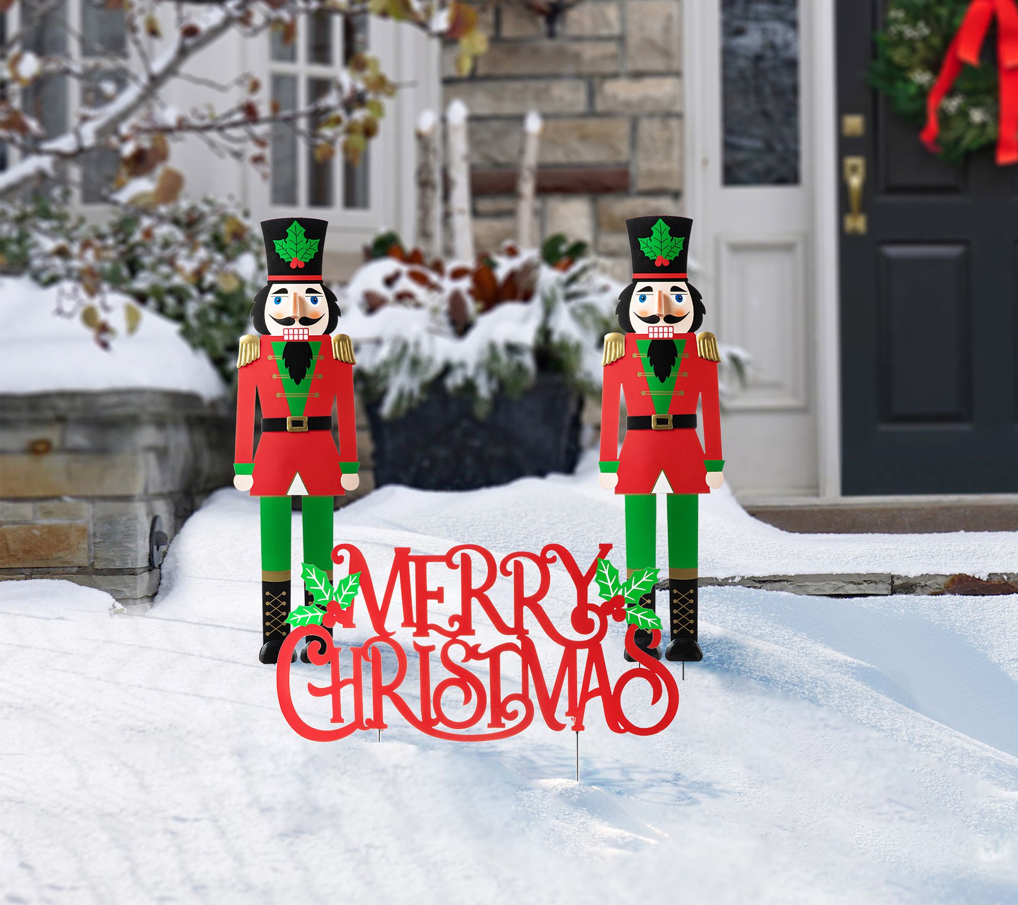 • Approximate measurements: "Merry Christmas" stake 20.75"L x 0.75"W x 23.5"H; Nutcracker stake 6.75"L x 0.75"W x 32"H