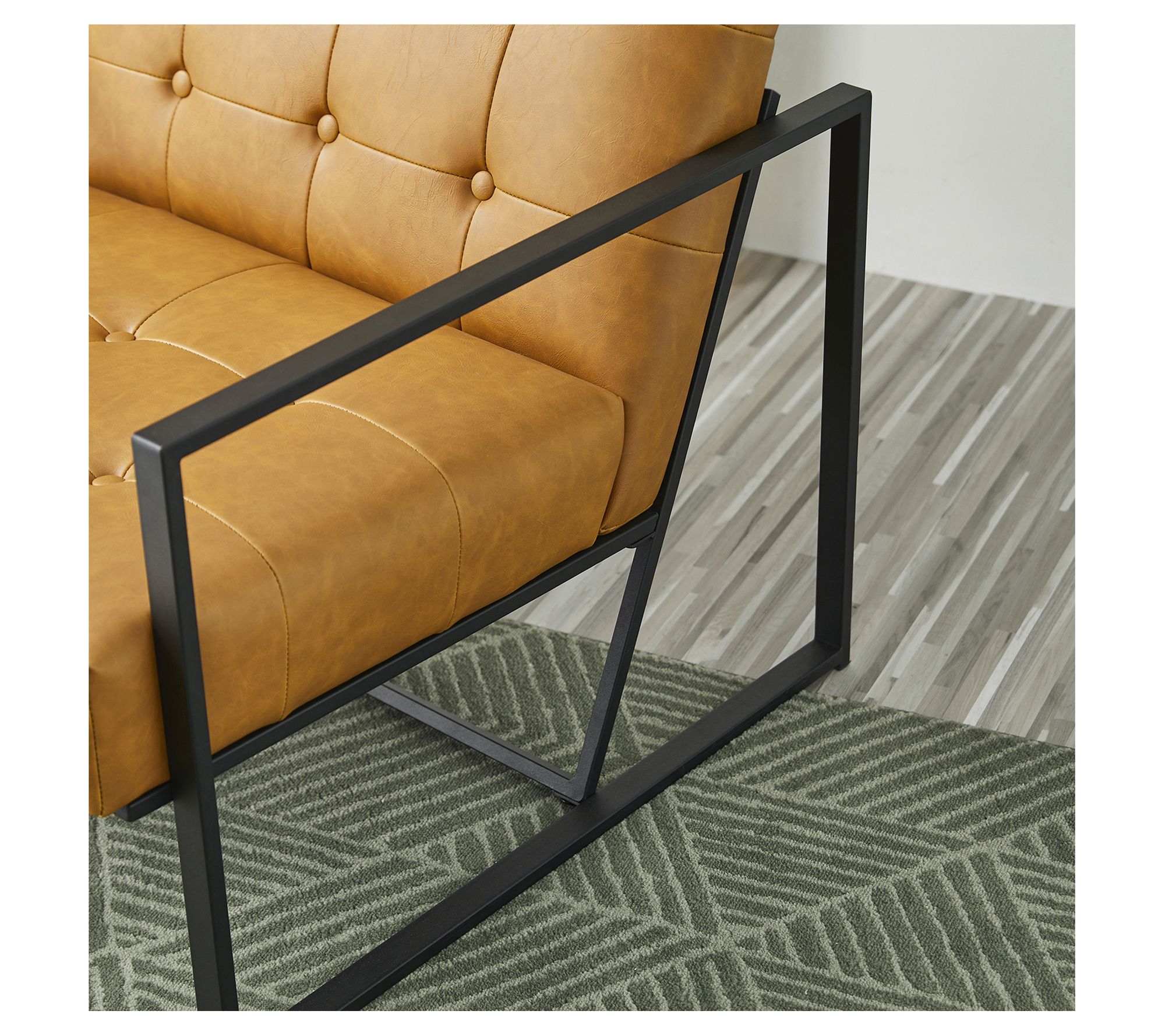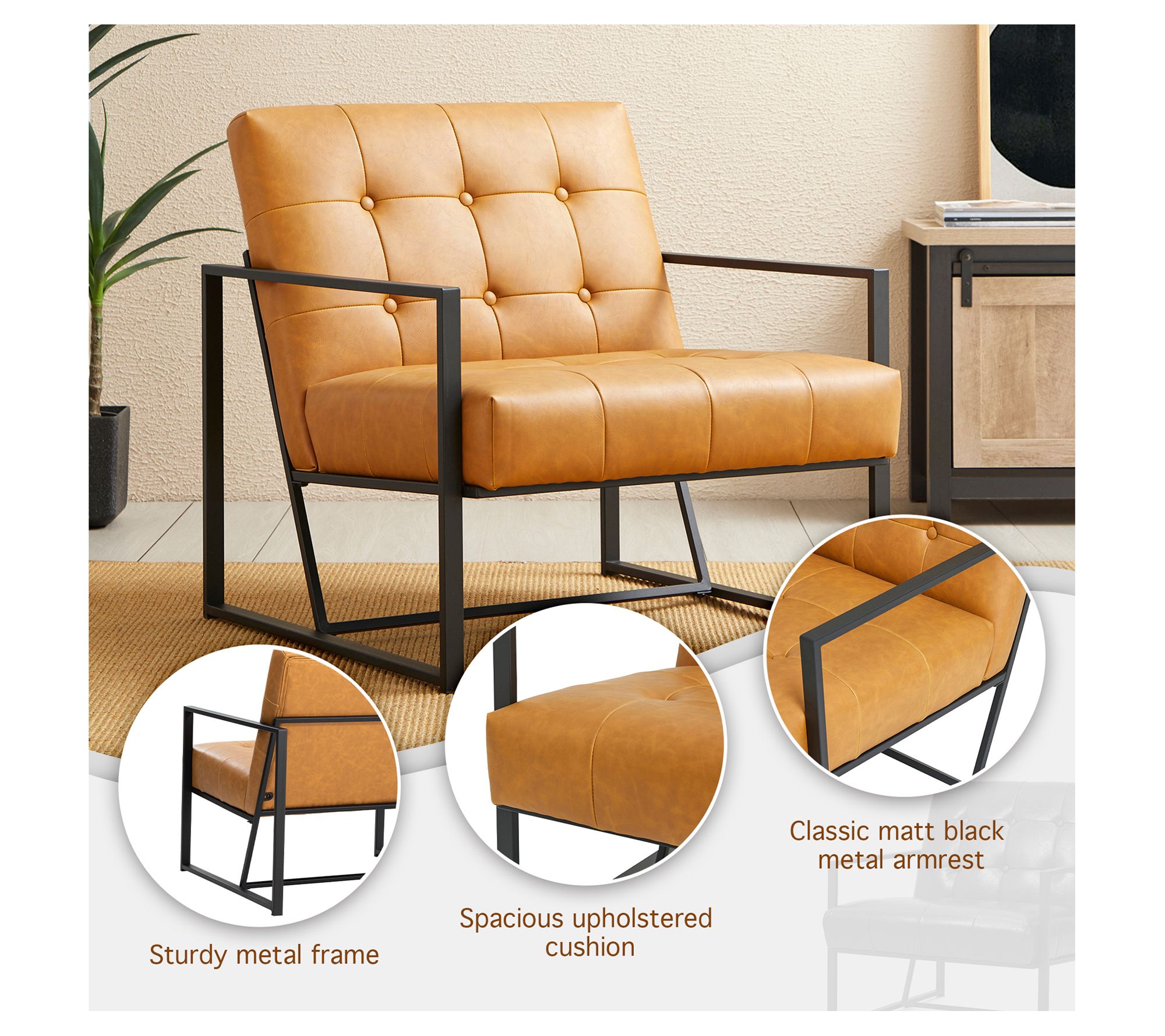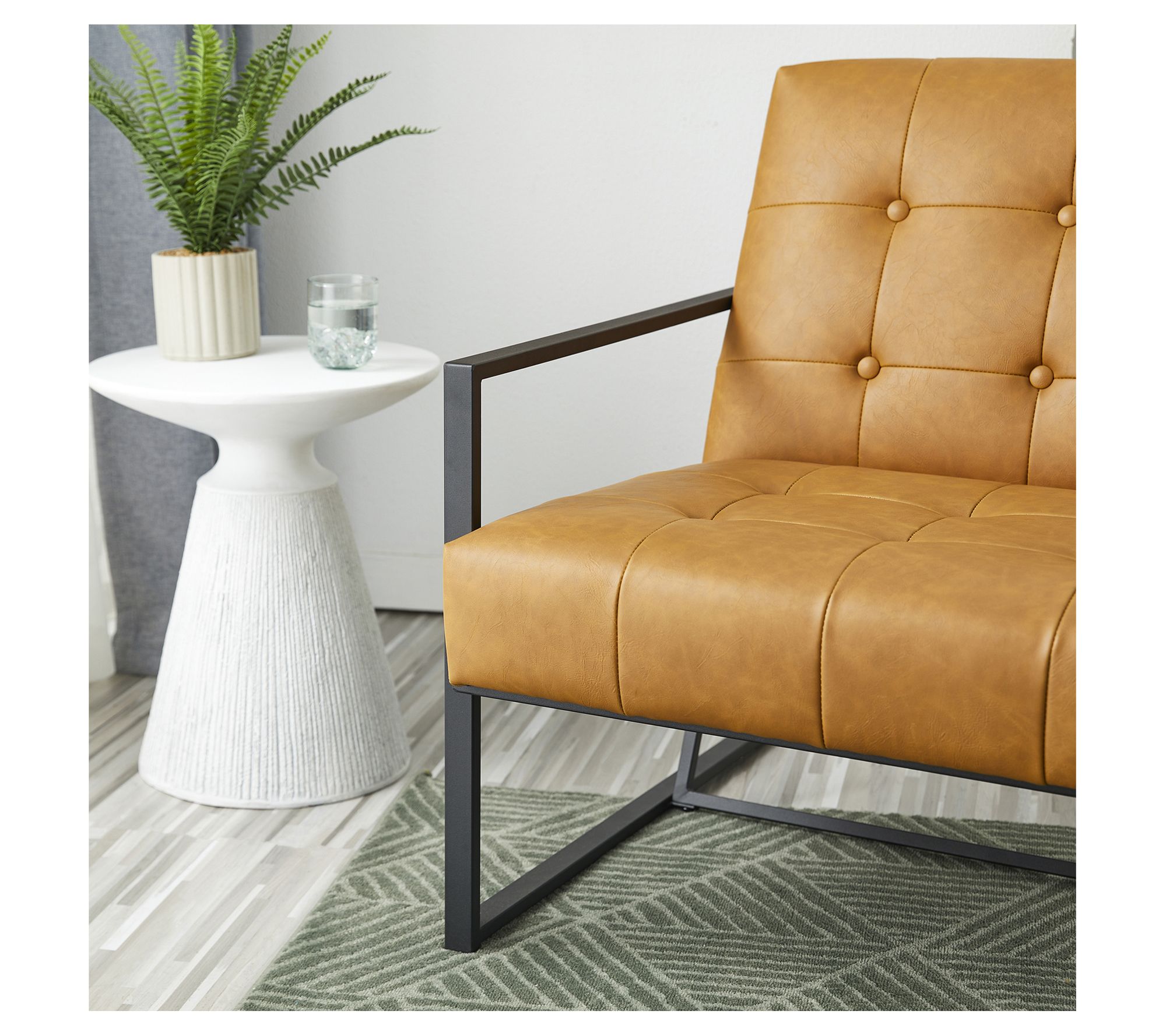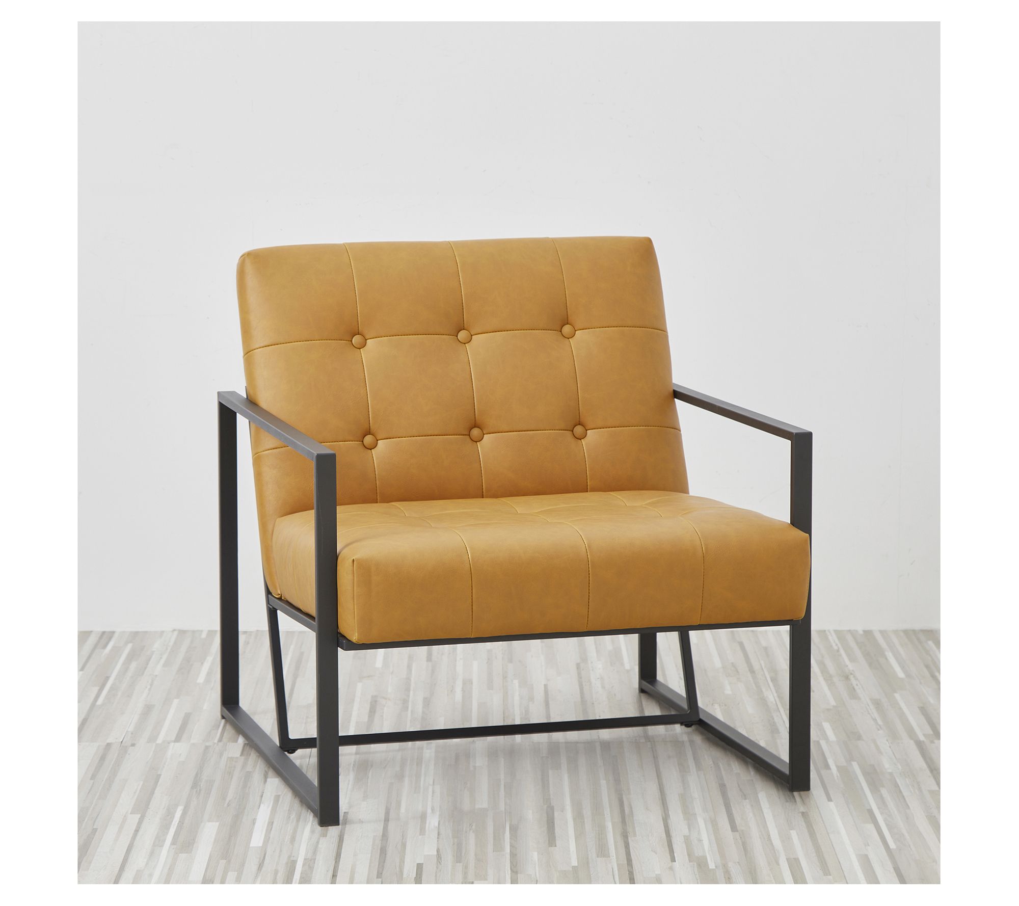 Add a touch of mid-century charm to your living space with the Glitzhome Mid-Century Leatherette Button Tufted Accent Chair. This stylish piece features a padded seat and back with high-density foam for comfort, all set on a sturdy powder-coated metal base. The slight distressing on the faux leather upholstery and button-tufted design add a sophisticated finish to any room. From Glitzhome.