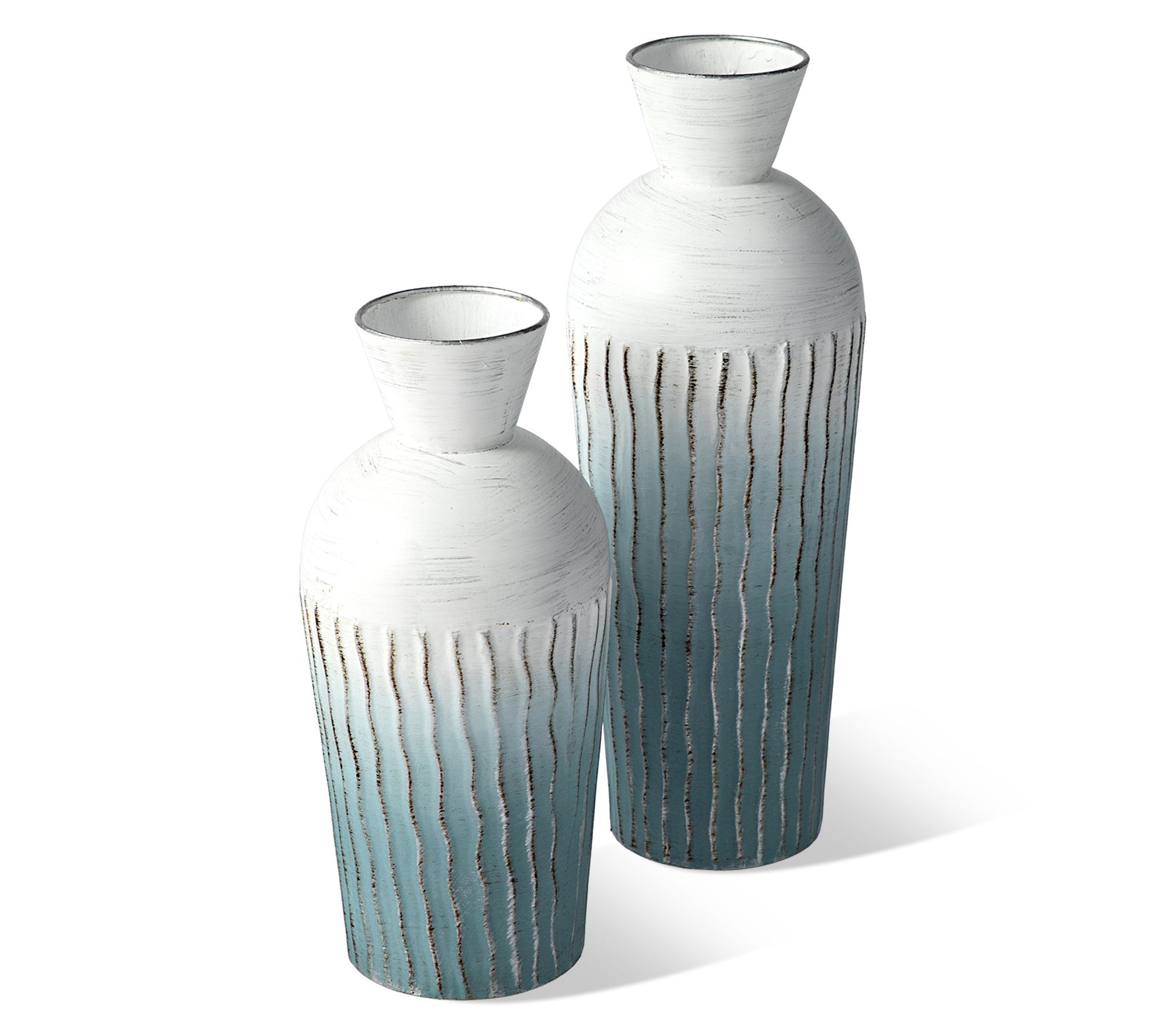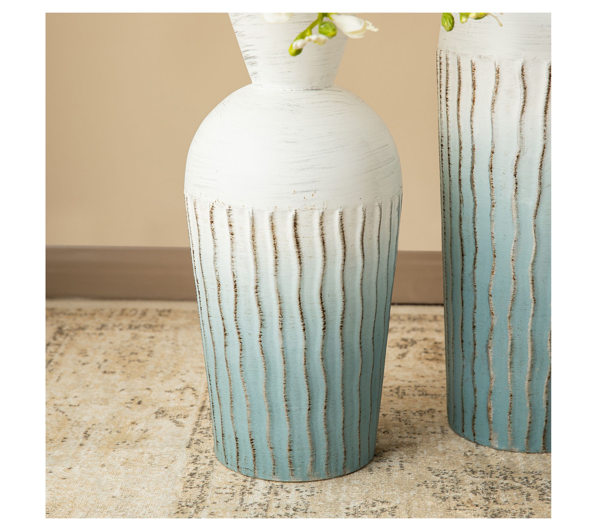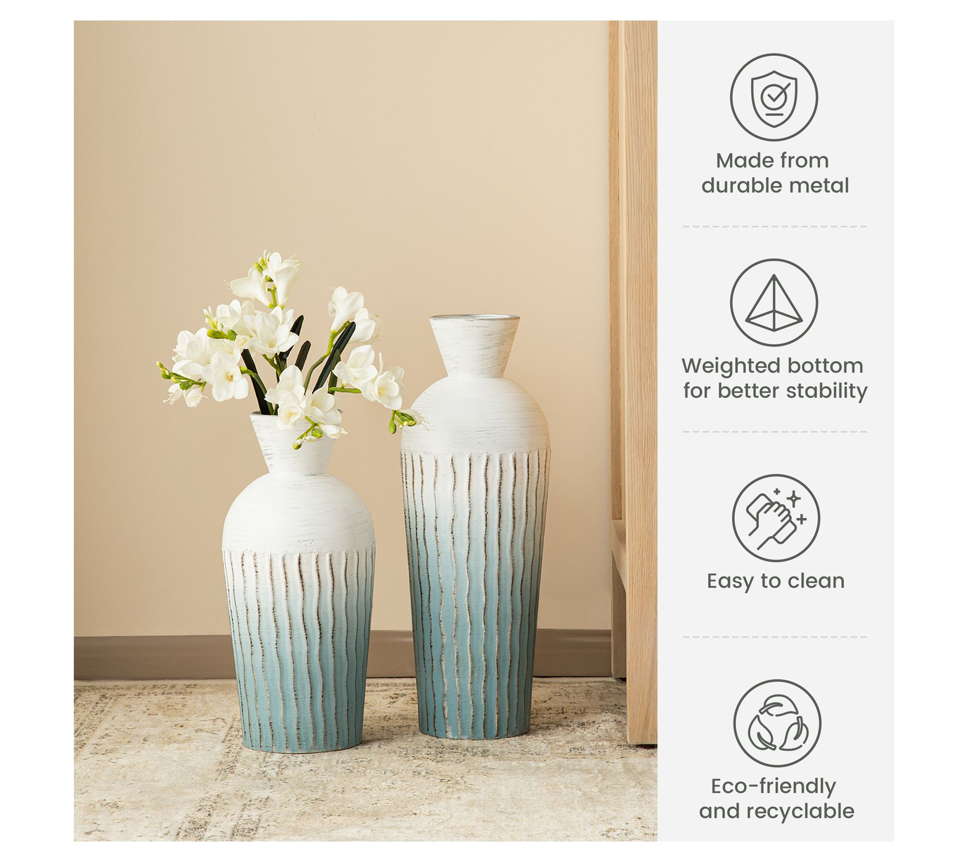 Imagine transforming any room into a modern masterpiece with these striking metal vases. Their ombre design of distressed blue, white, and silvery accents creates an eye-catching display. Picture them as the perfect centerpiece on your dining table, filled with vibrant blooms, or gracing your office reception with minimalist elegance. Crafted for both beauty and function, these vases offer a stable and durable home for any decorative accent. Their unique water ripple texture adds a touch of sophistication to any space. From Glitzhome.