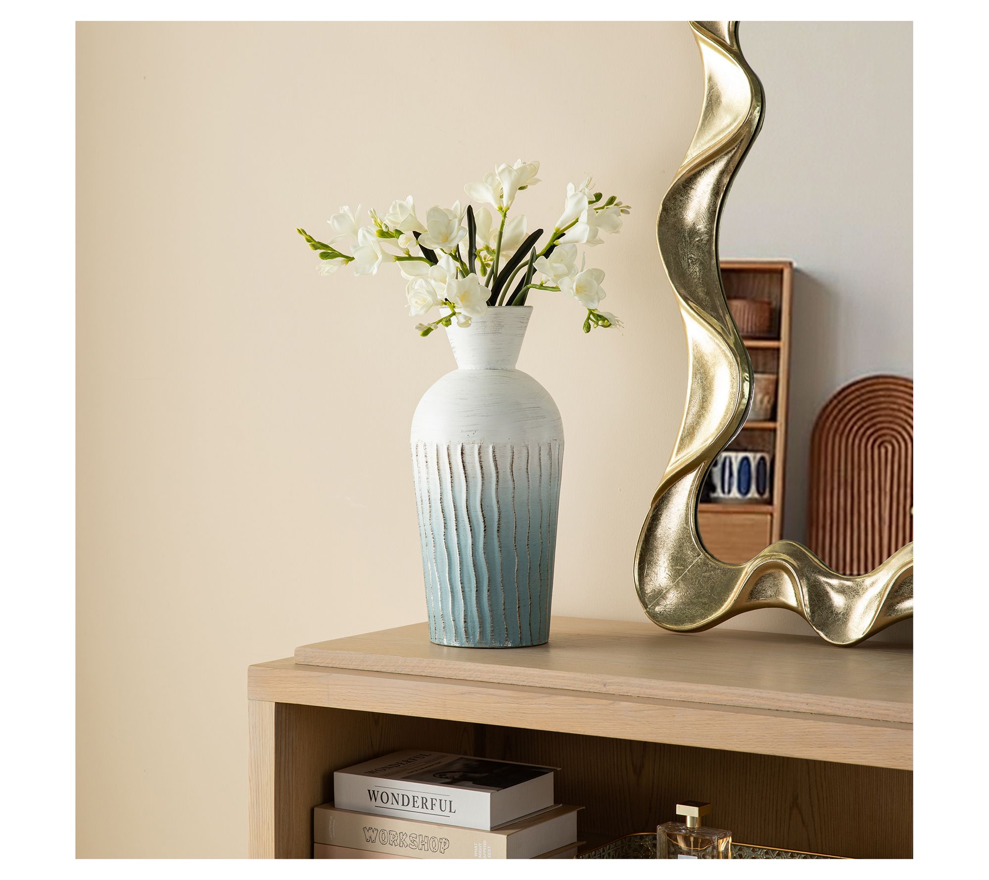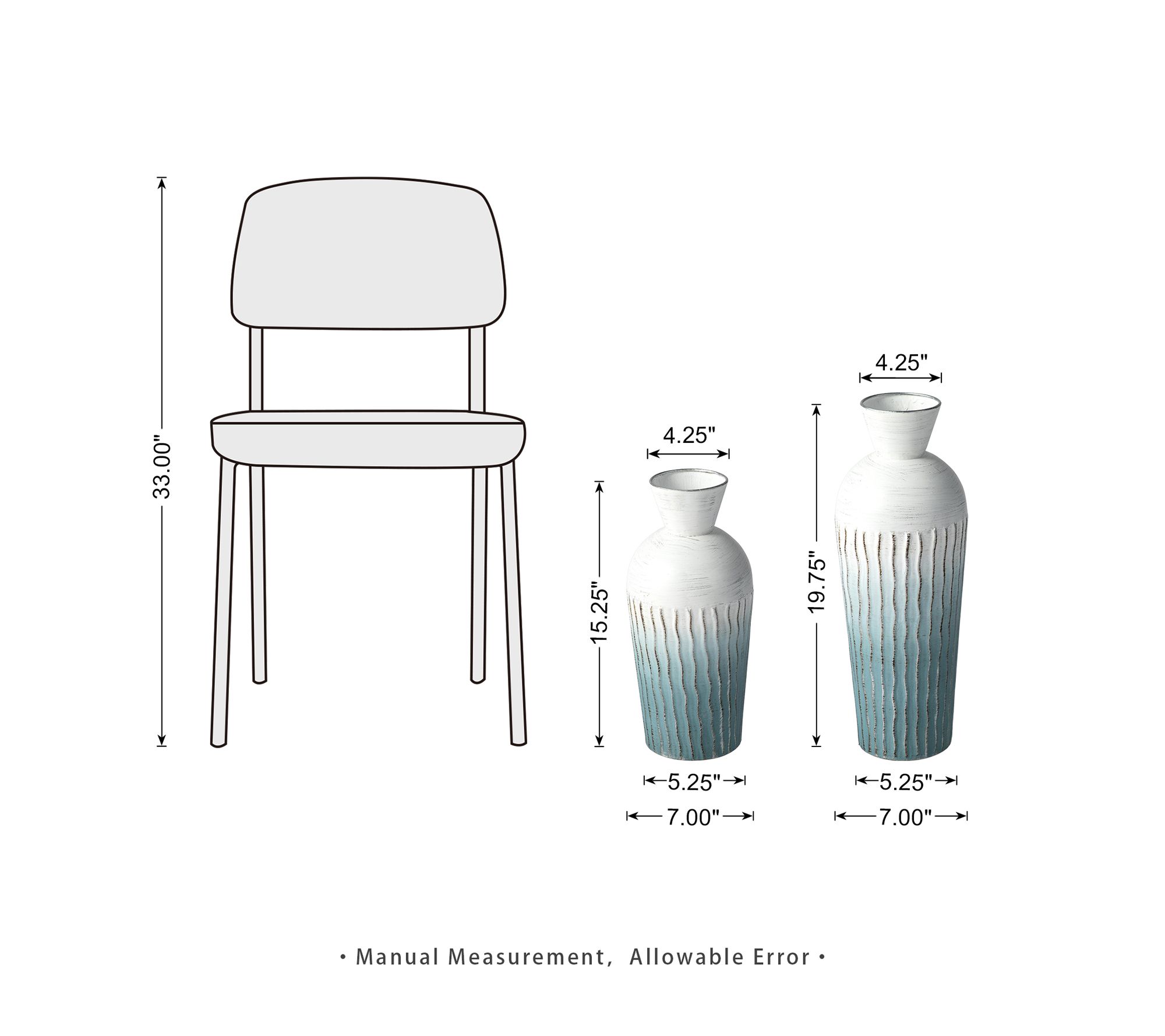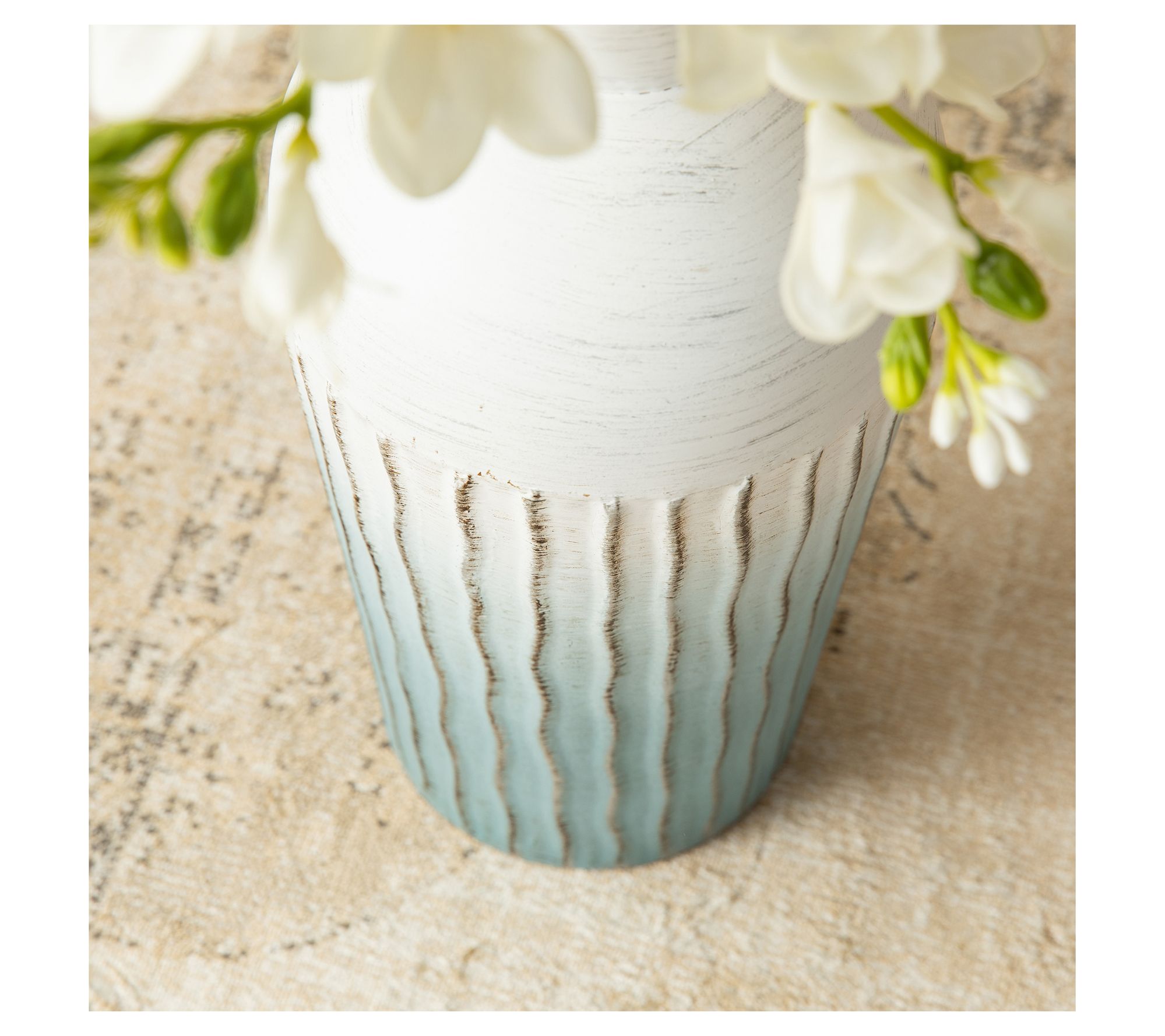 Imagine transforming any room into a modern masterpiece with these striking metal vases. Their ombre design of distressed blue, white, and silvery accents creates an eye-catching display. Picture them as the perfect centerpiece on your dining table, filled with vibrant blooms, or gracing your office reception with minimalist elegance. Crafted for both beauty and function, these vases offer a stable and durable home for any decorative accent. Their unique water ripple texture adds a touch of sophistication to any space. From Glitzhome.