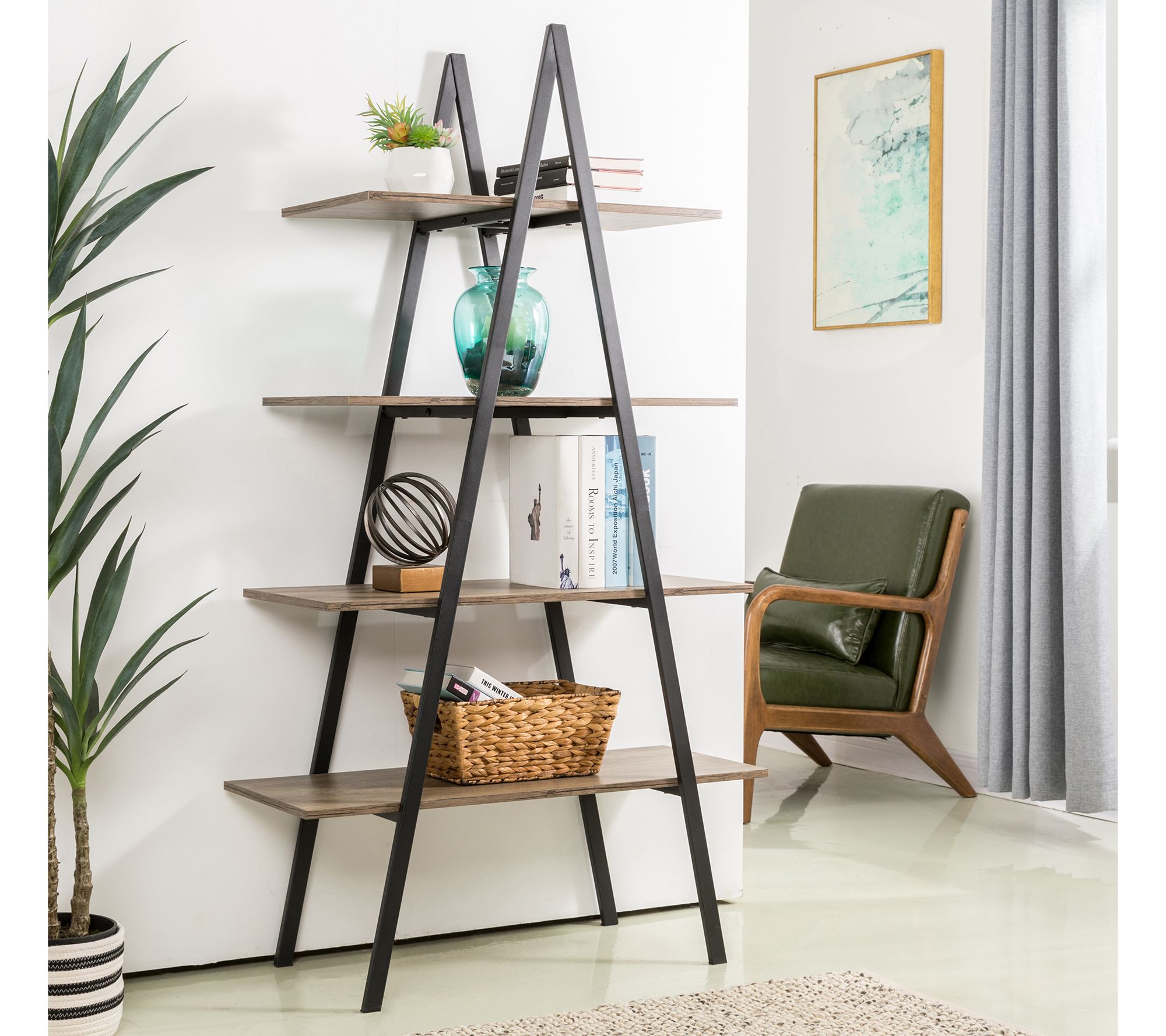 If you love that trendy industrial look than you'll be all over this metal A-frame ladder shelf sporting four sleek tiers to showcase books and sentimental treasures. From Glitzhome.