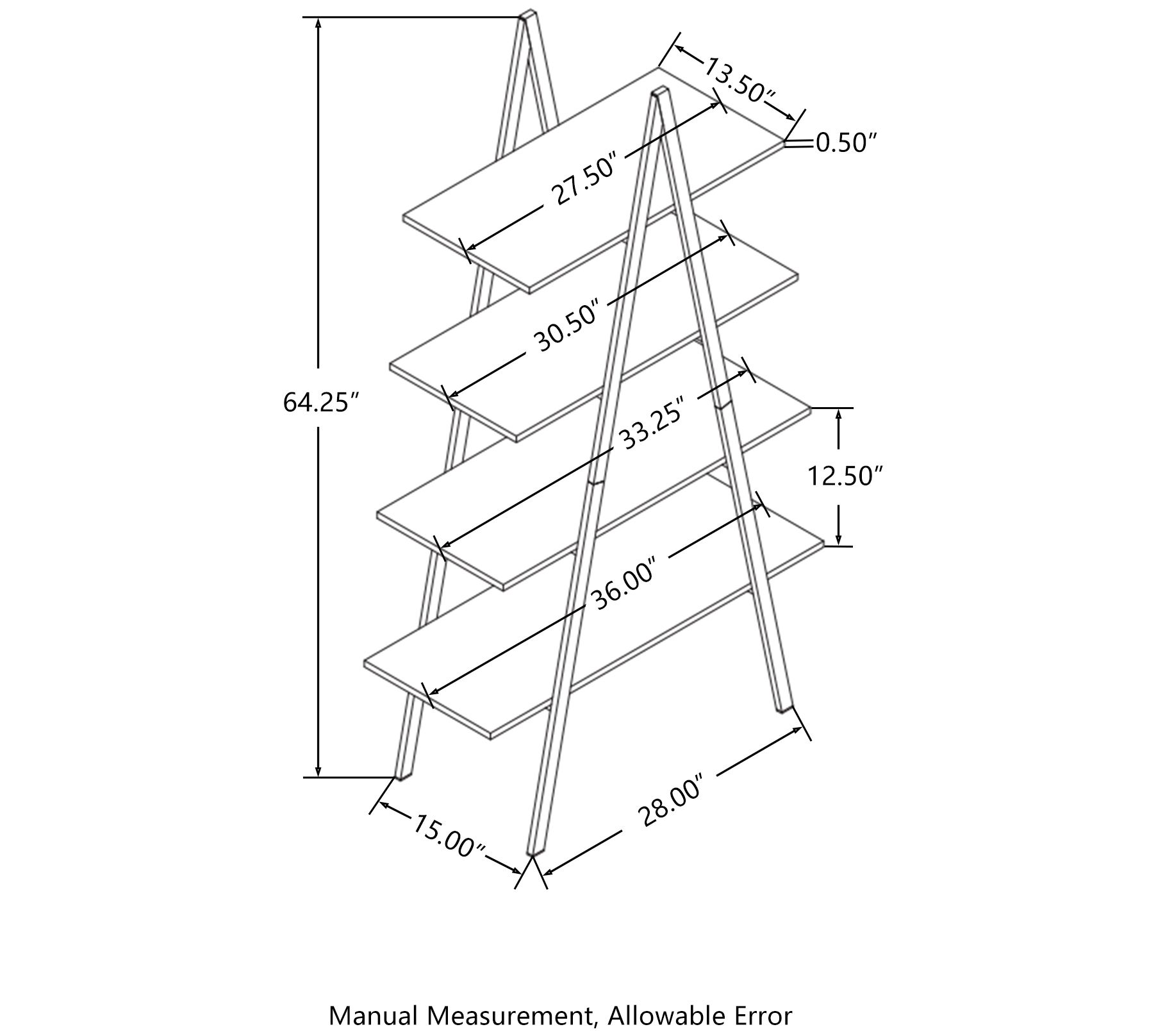 • Measures 36"L X 15"W X 64.5"H; each shelf supports up to 30lbs