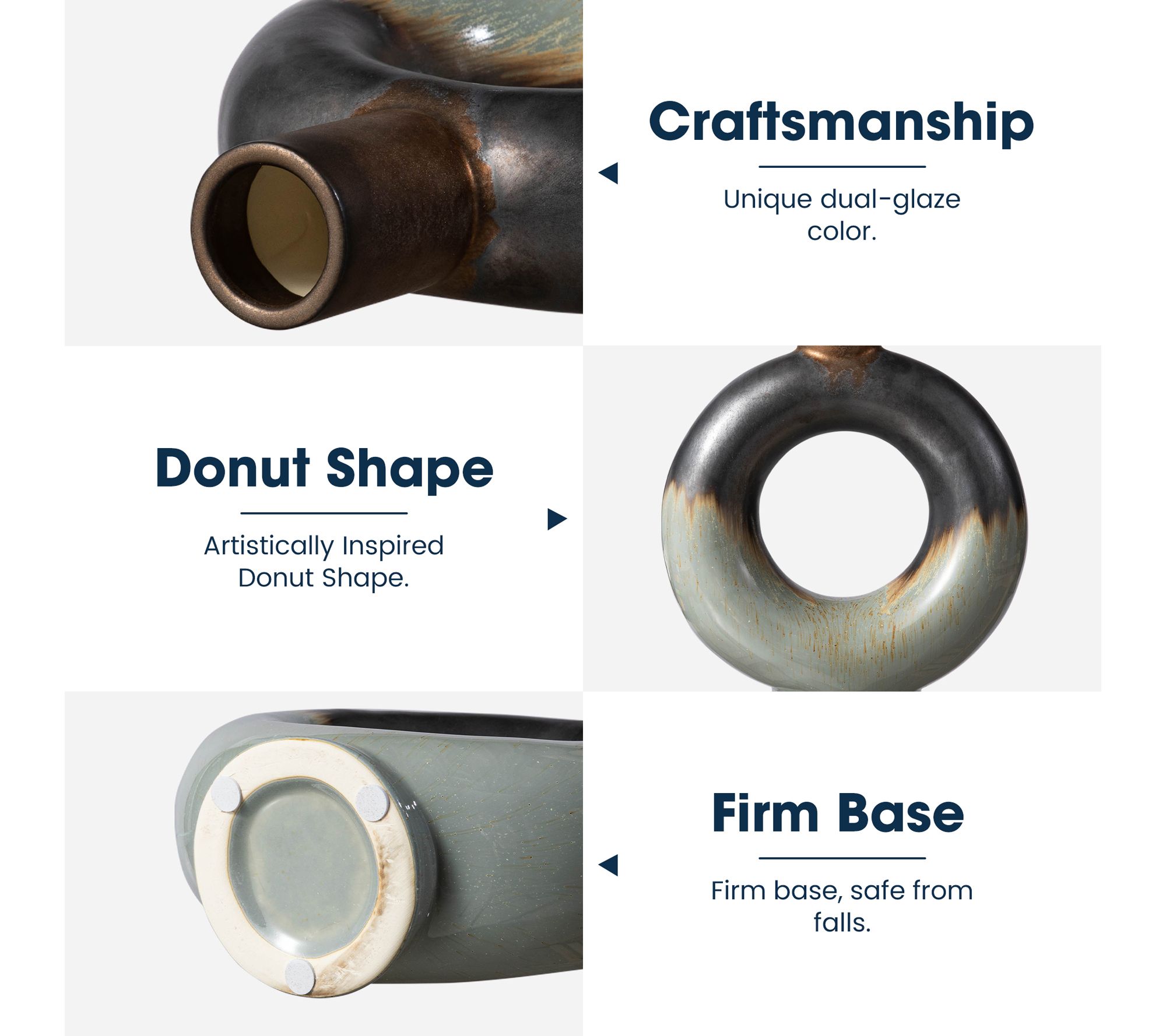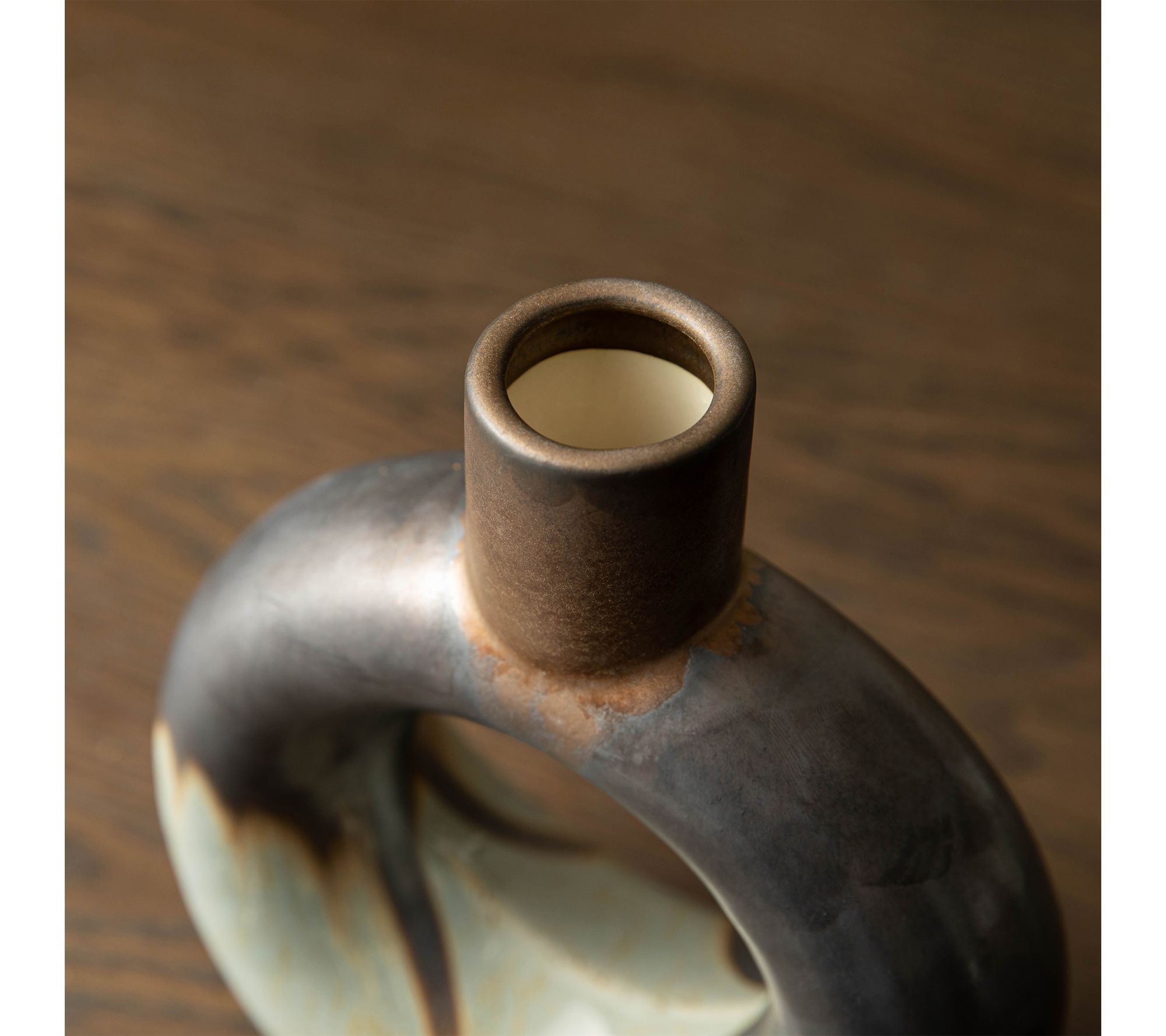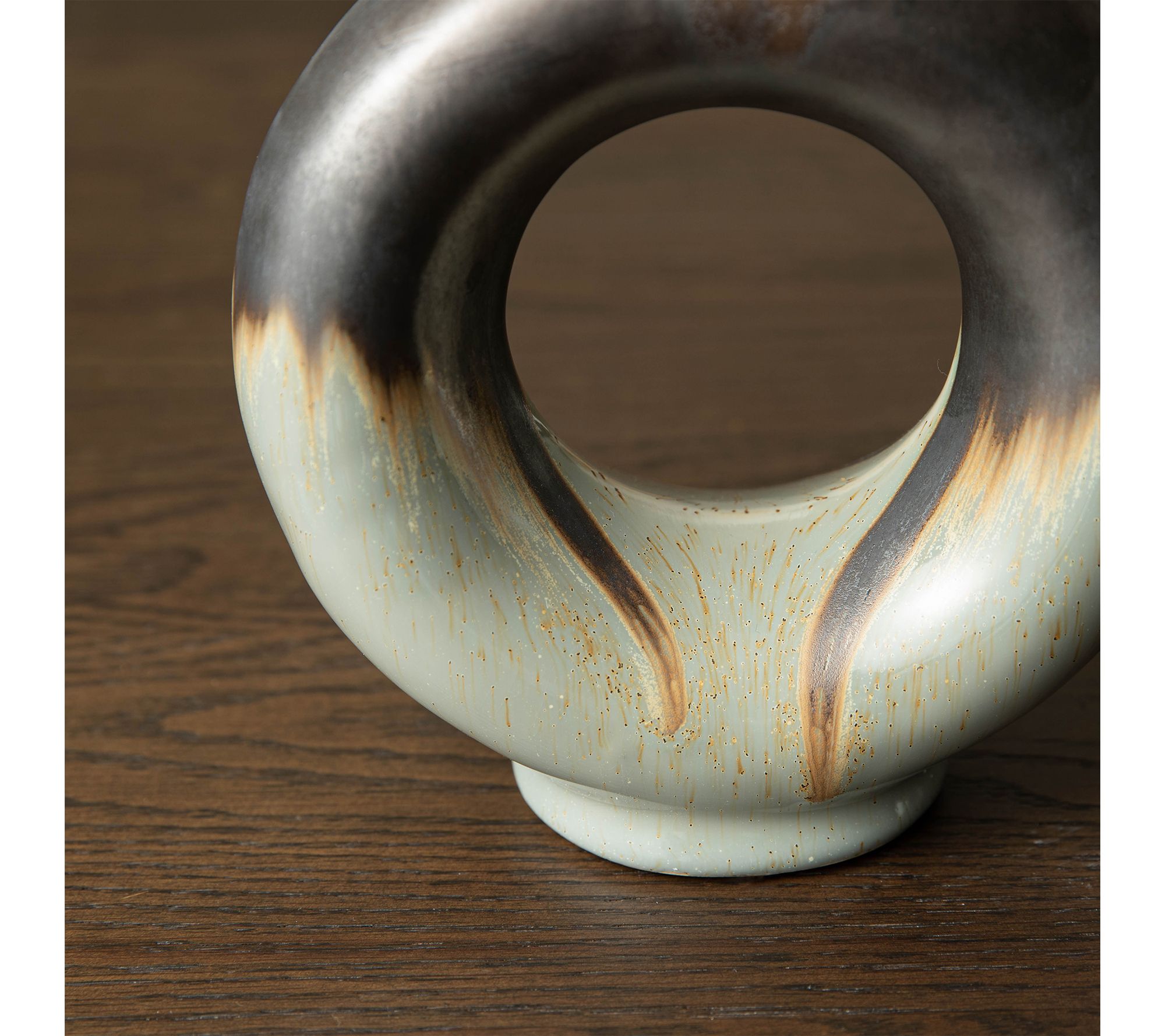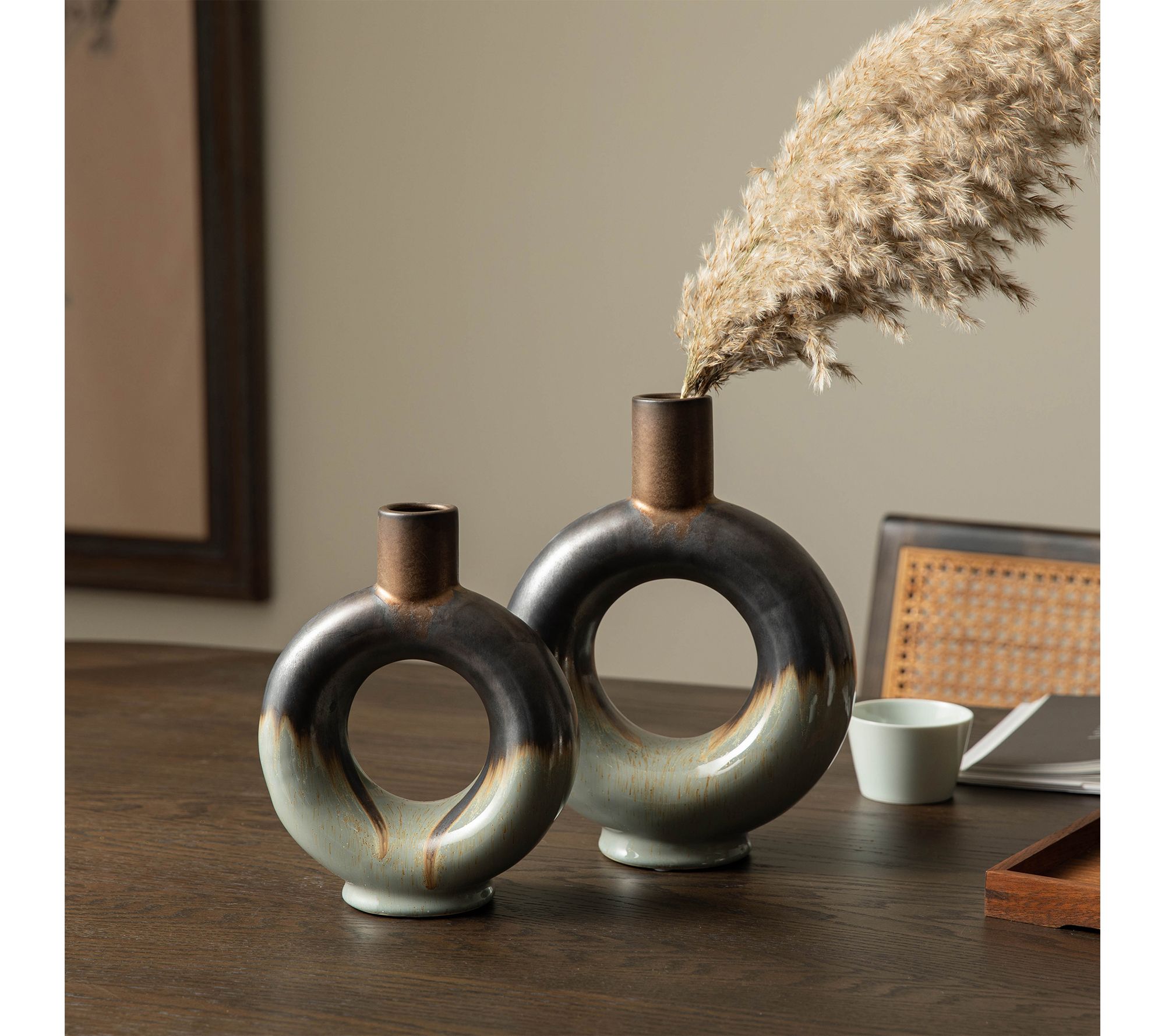Enhance your living space with the striking presence of these modern open circle ceramic vases. With a design that captures attention, their two-toned tricolor glaze highlights any room's contemporary flair. Imagine these table vases accentuating your favorite floral arrangements, providing a touch of artistic elegance, whether placed in your home, office, or hotel lounge. From Glitzhome.