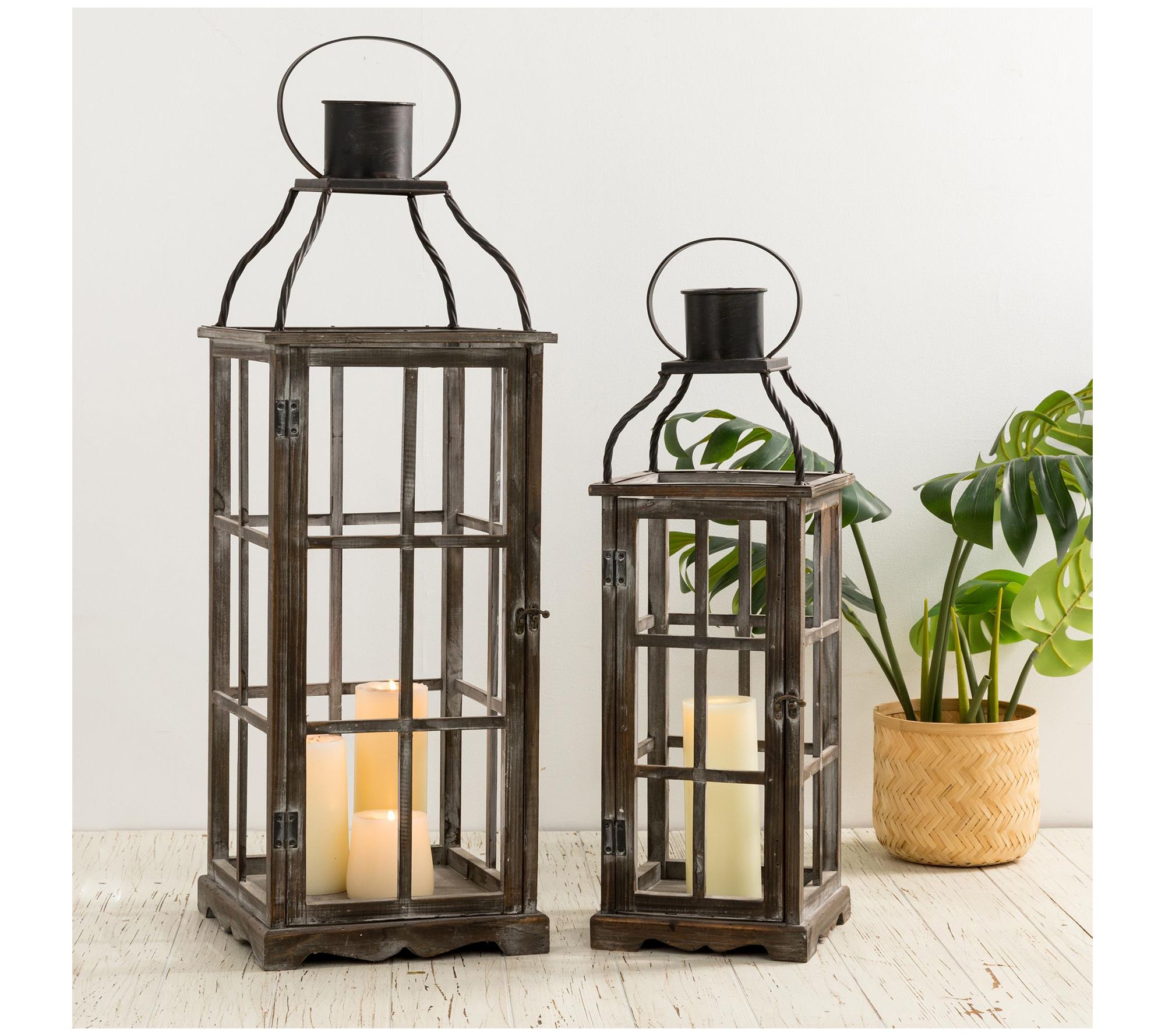 • Approximate measurements: Large lantern 11.42"L x 11.42"W x 35.62"H; Small lantern 8.66"L x 8.66"W x 27.16"H