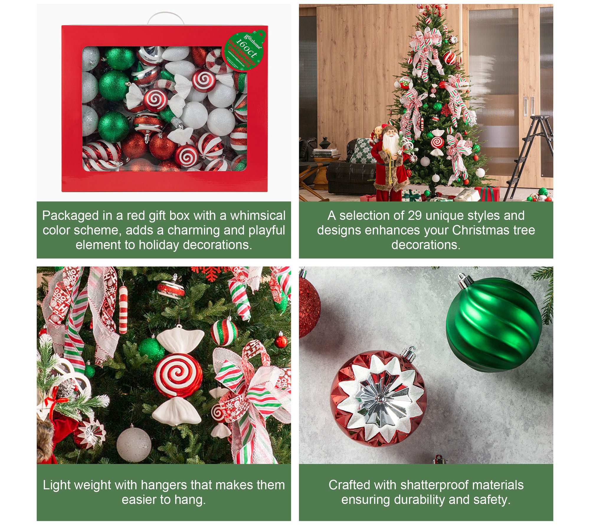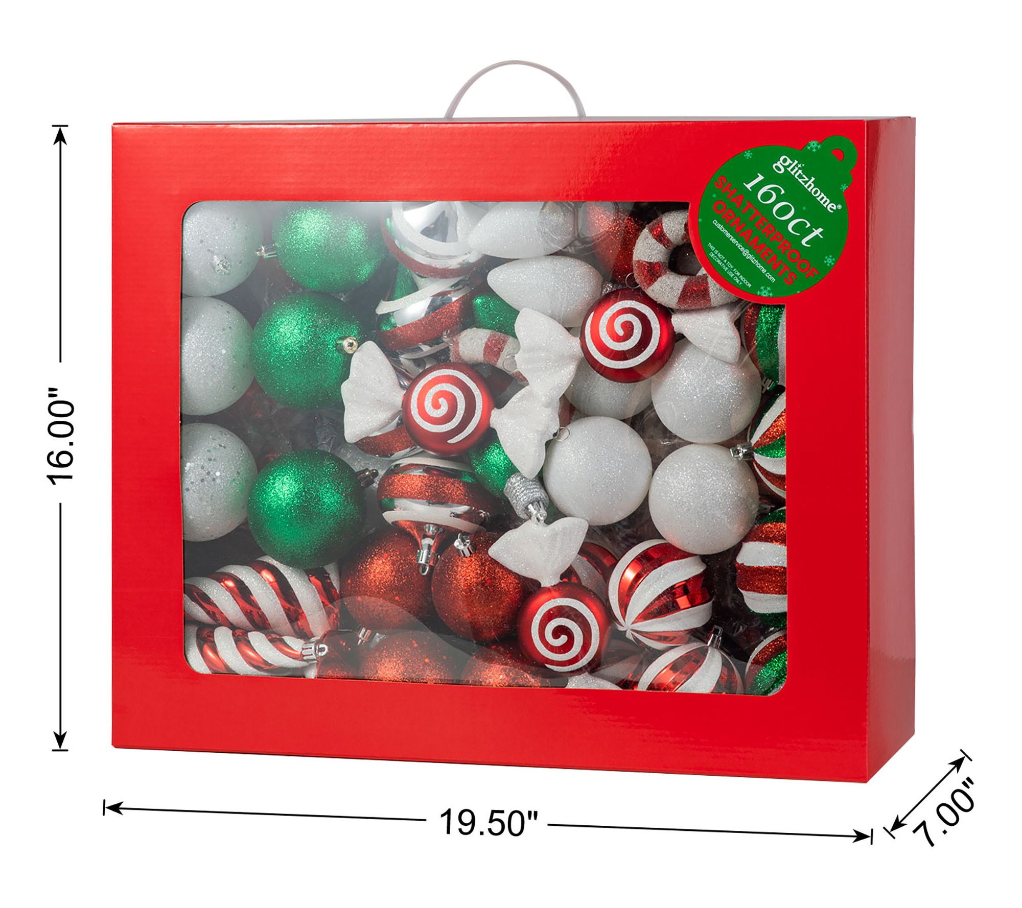 Elevate your holiday decor with the Glitzhome red and green deluxe boxed Christmas ornament set. This 160-piece collection features a variety of sizes and designs, packaged in a whimsical red gift box that adds a playful touch to your festive decorations. Effortlessly adorn your tree with these lightweight ornaments, all equipped with S hooks for easy hanging. From Glitzhome.
