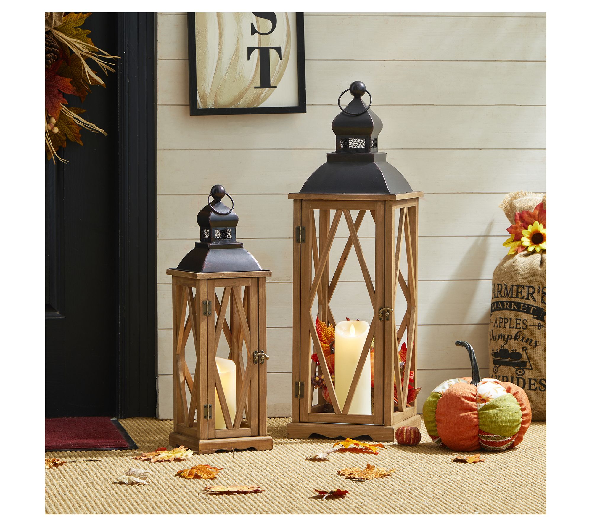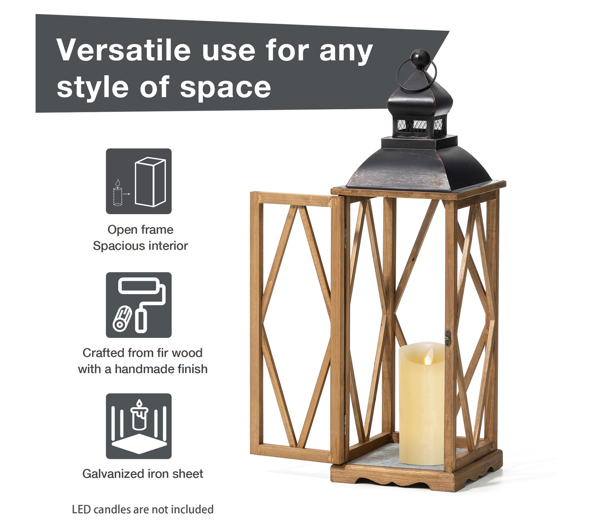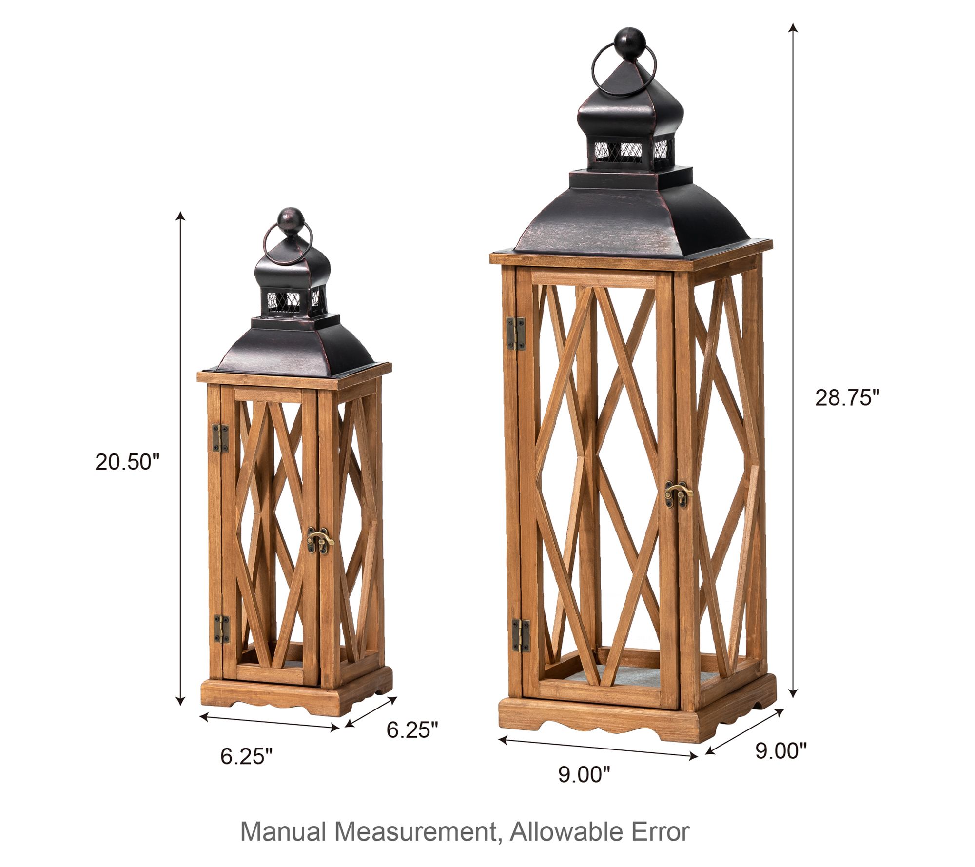 Enhance your home decor with these extra tall antiqued lanterns. Crafted from fir wood with a beautiful finish, these lanterns feature diamond-shaped mullions and a metal top, handle, and latch for a distinctive contrast. Perfect for rustic, industrial, or farmhouse spaces. From Glitzhome.