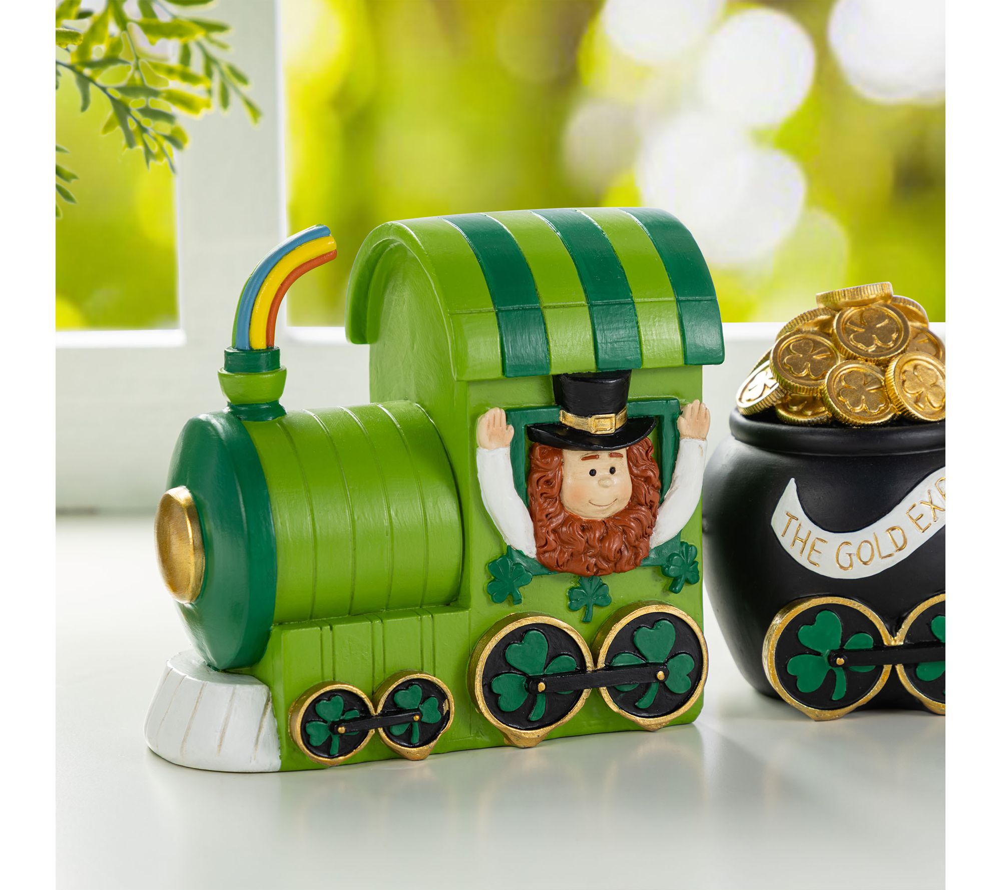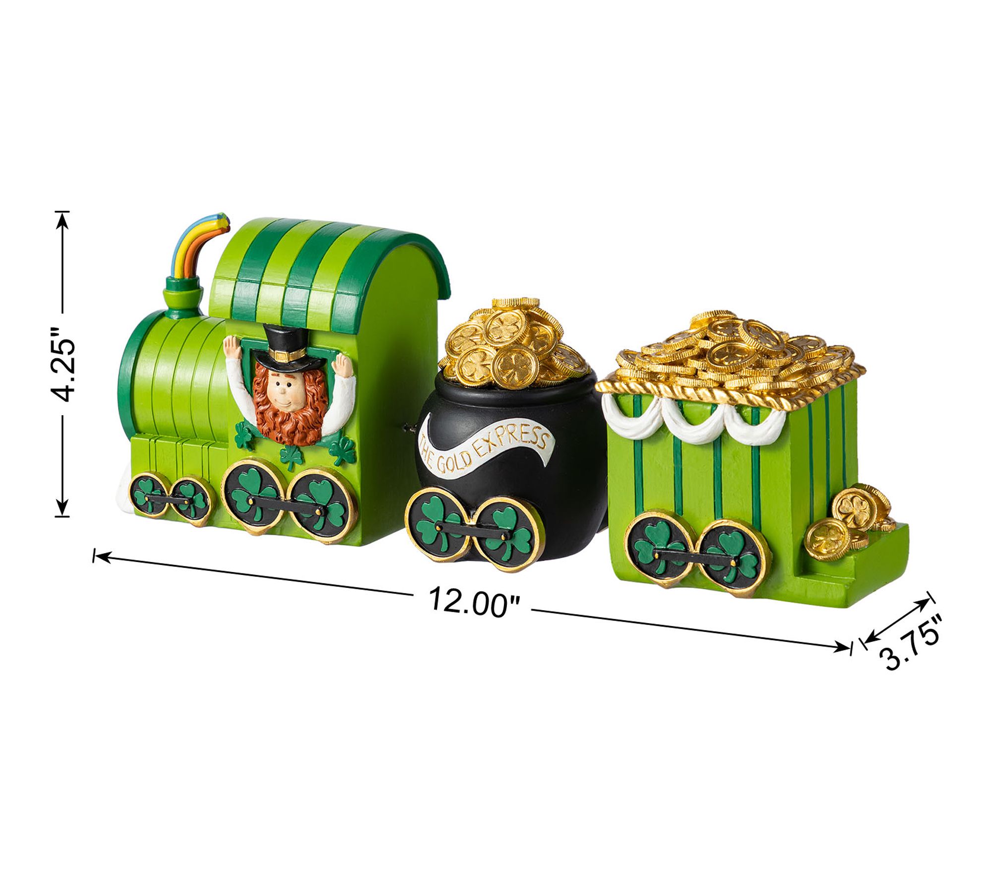 Bring festive cheer to your home with this whimsical resin leprechaun train table decor, featuring a bright green engine, a Gold Express pot of gold car, and a gold-filled car -- all ready to celebrate St. Patrick's Day in style. Perfect for brightening tabletops, mantels, or even narrow shelves, these playful accents add a dash of luck and charm to any space. From Glitzhome.