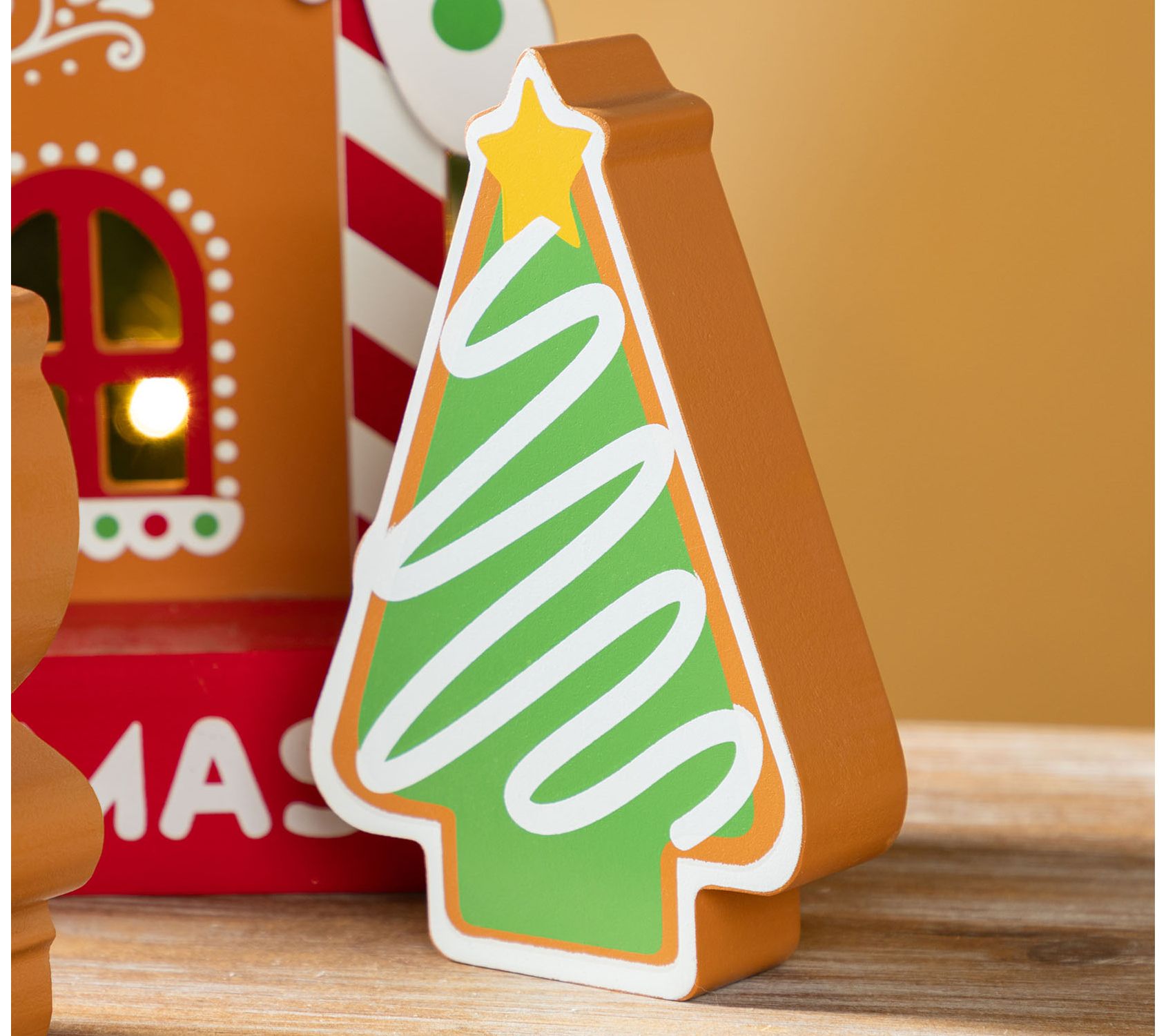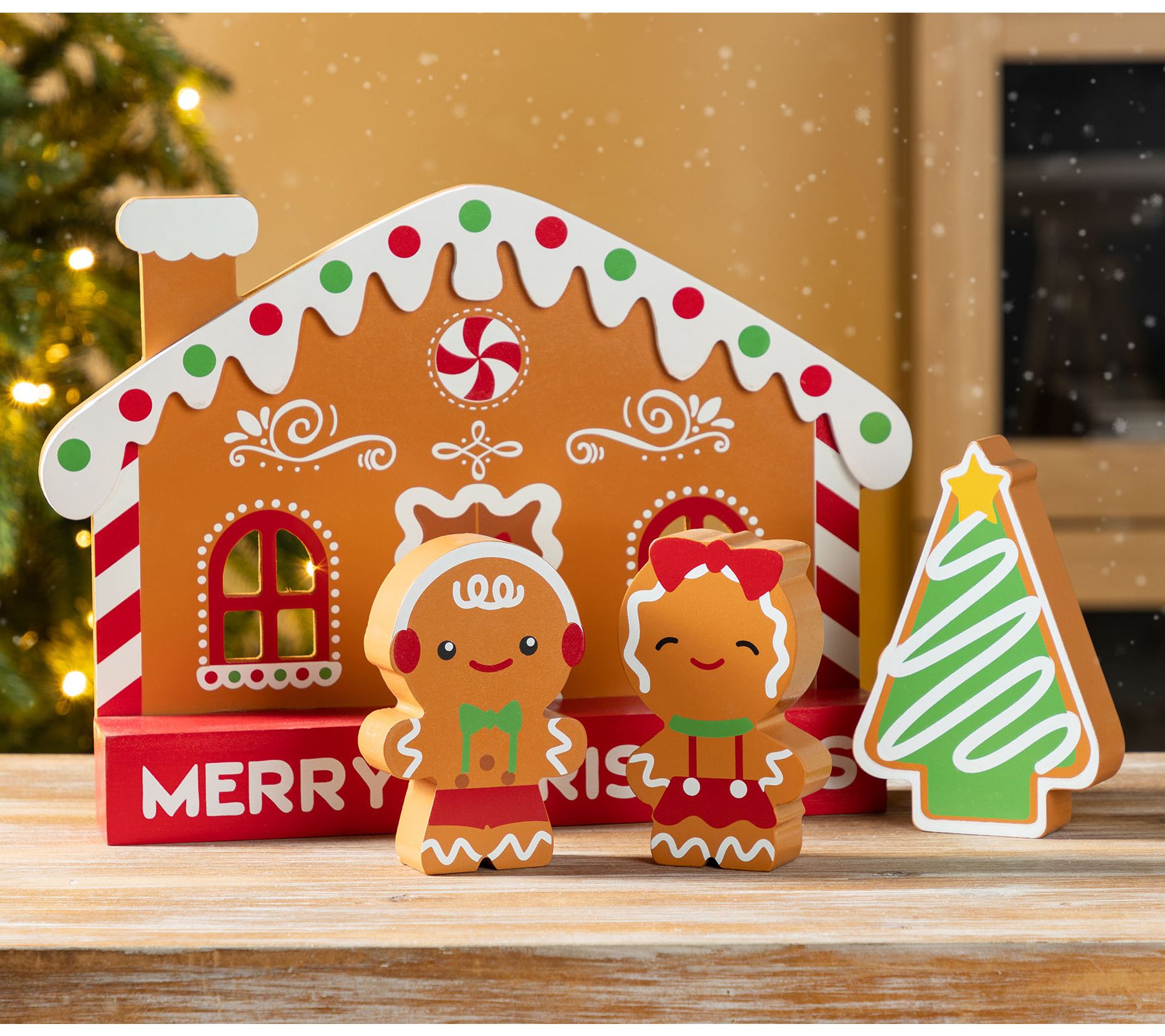 • Includes four pieces: two gingerbread figures, one gingerbread house, and one Christmas tree