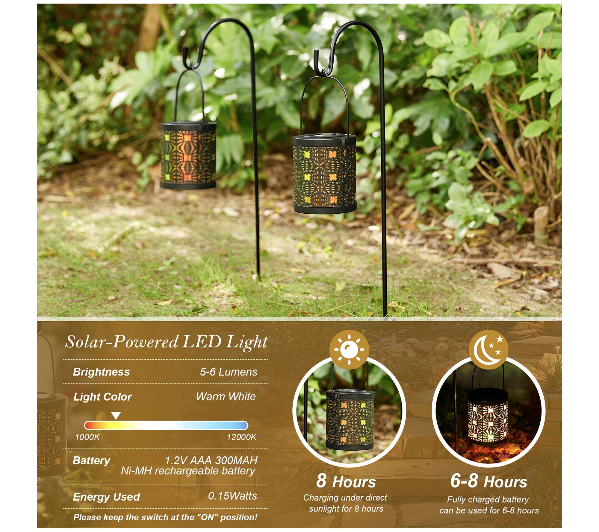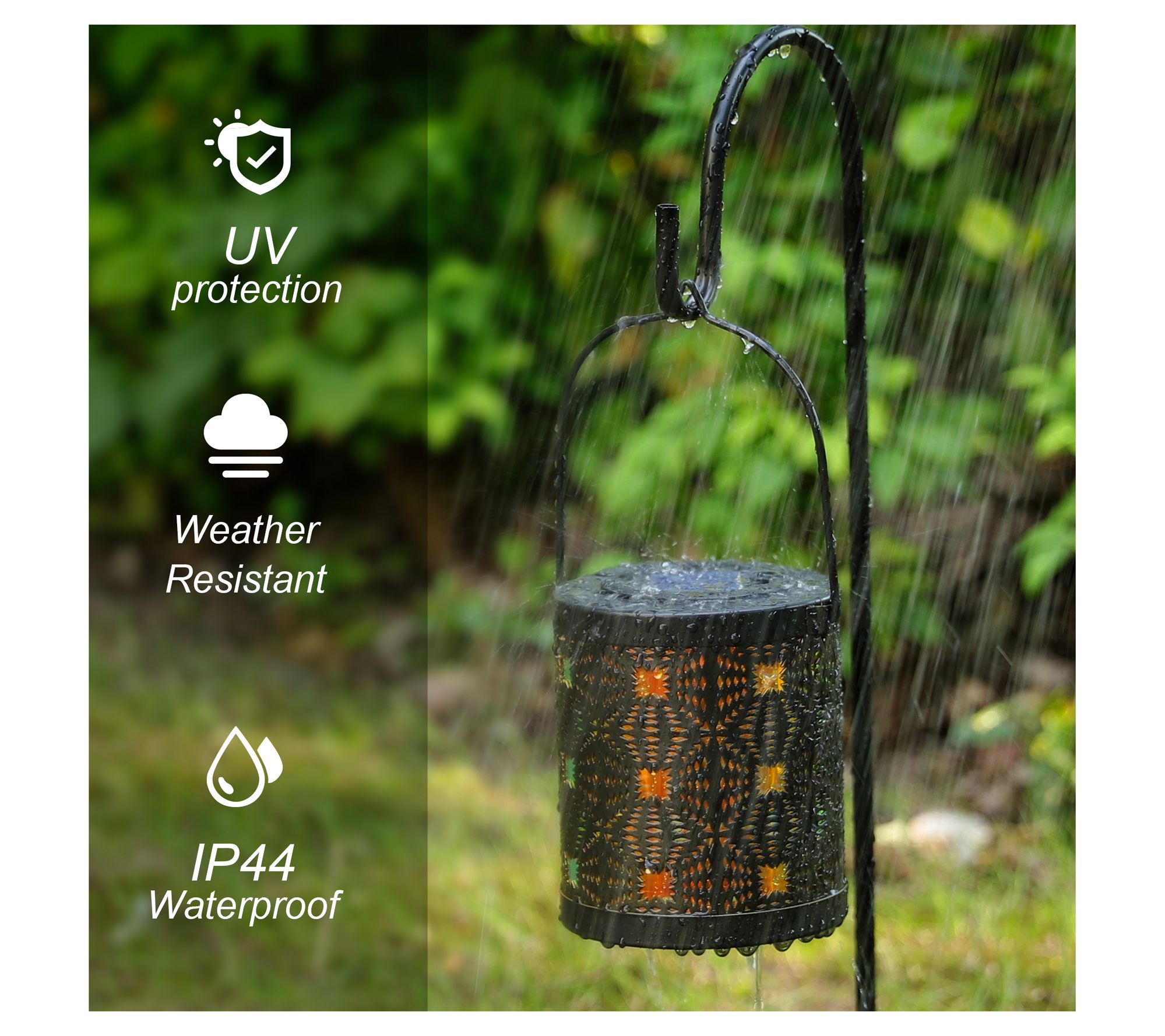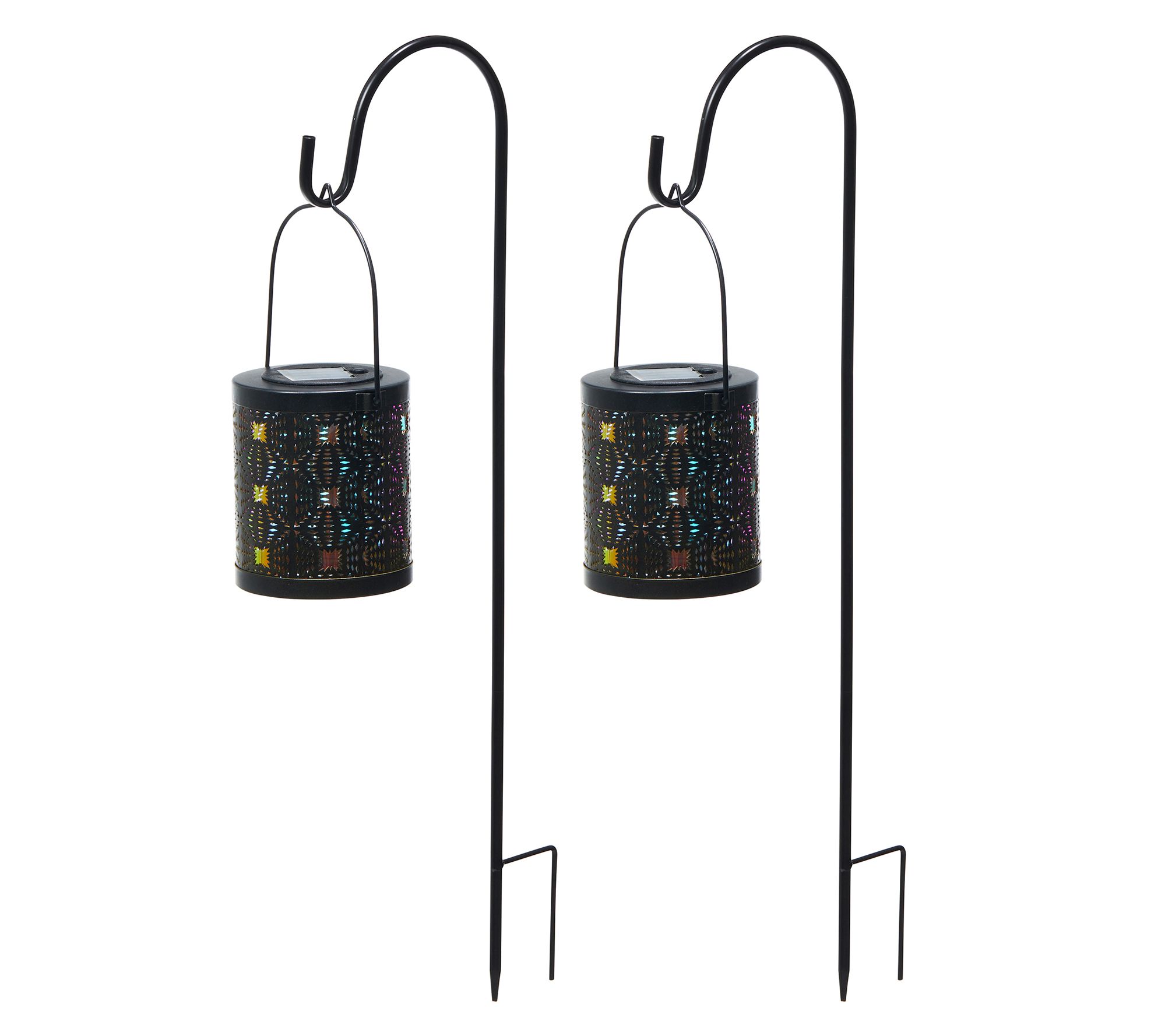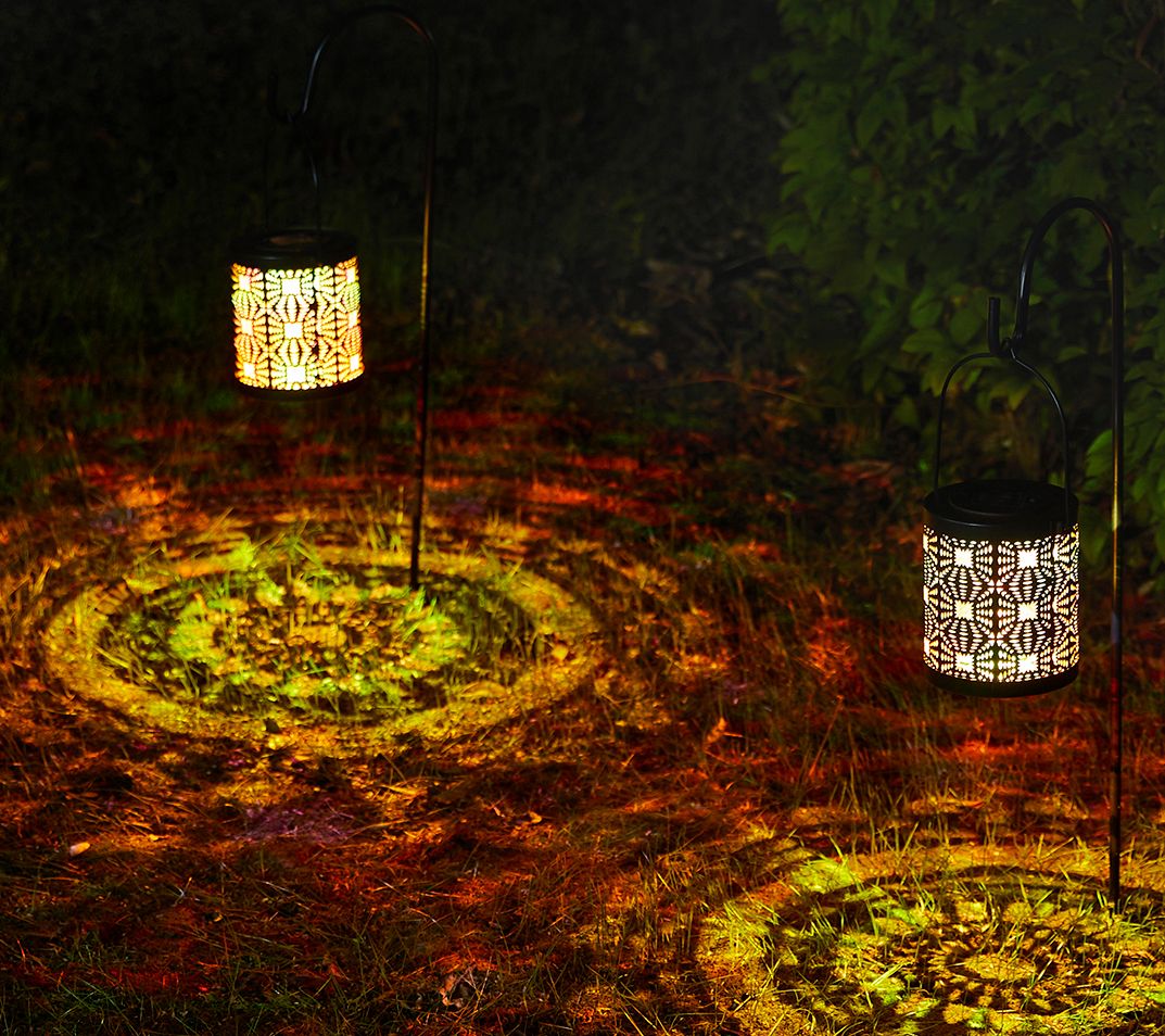 • Includes two solar-powered outdoor lanterns and metal hanger