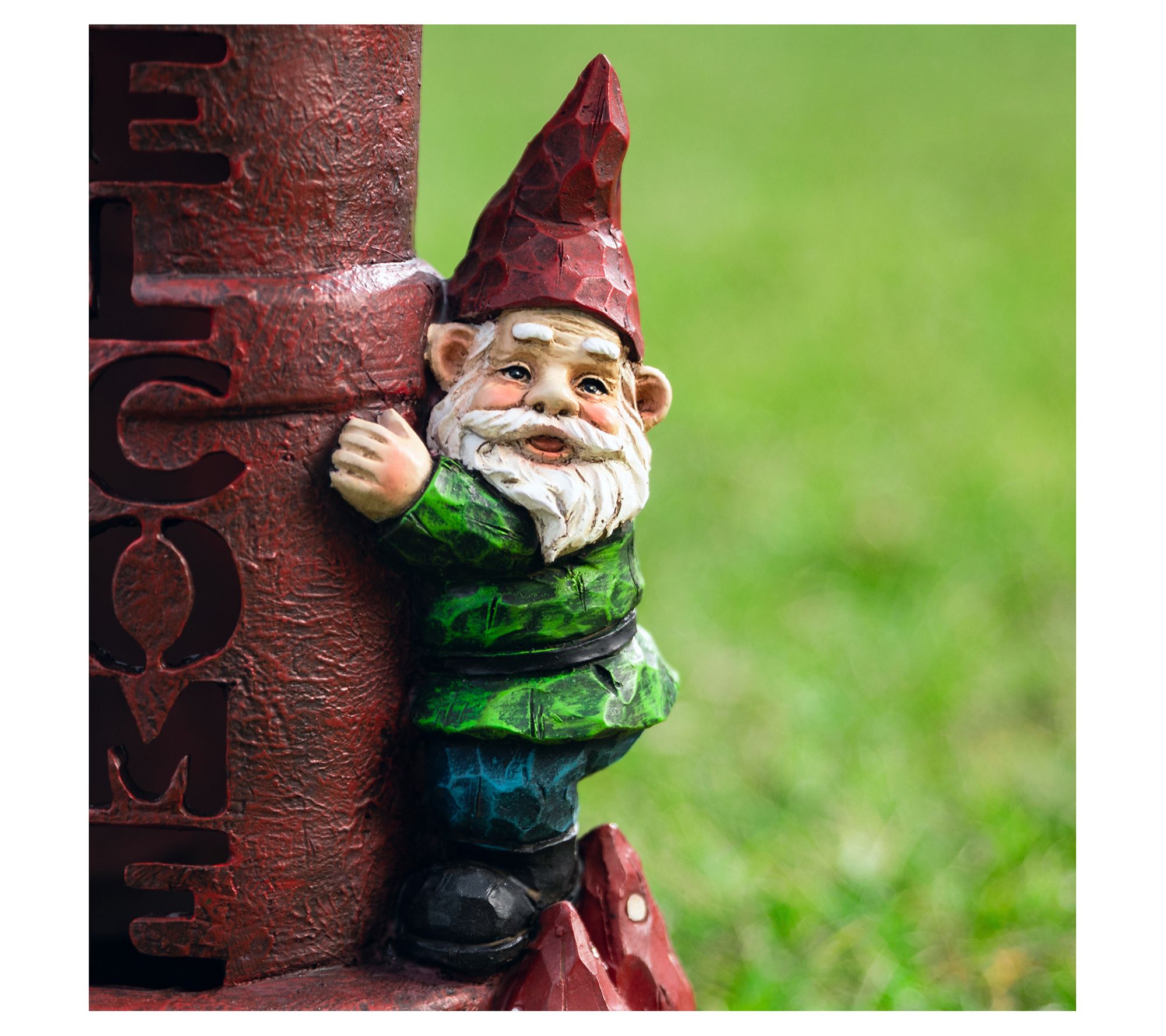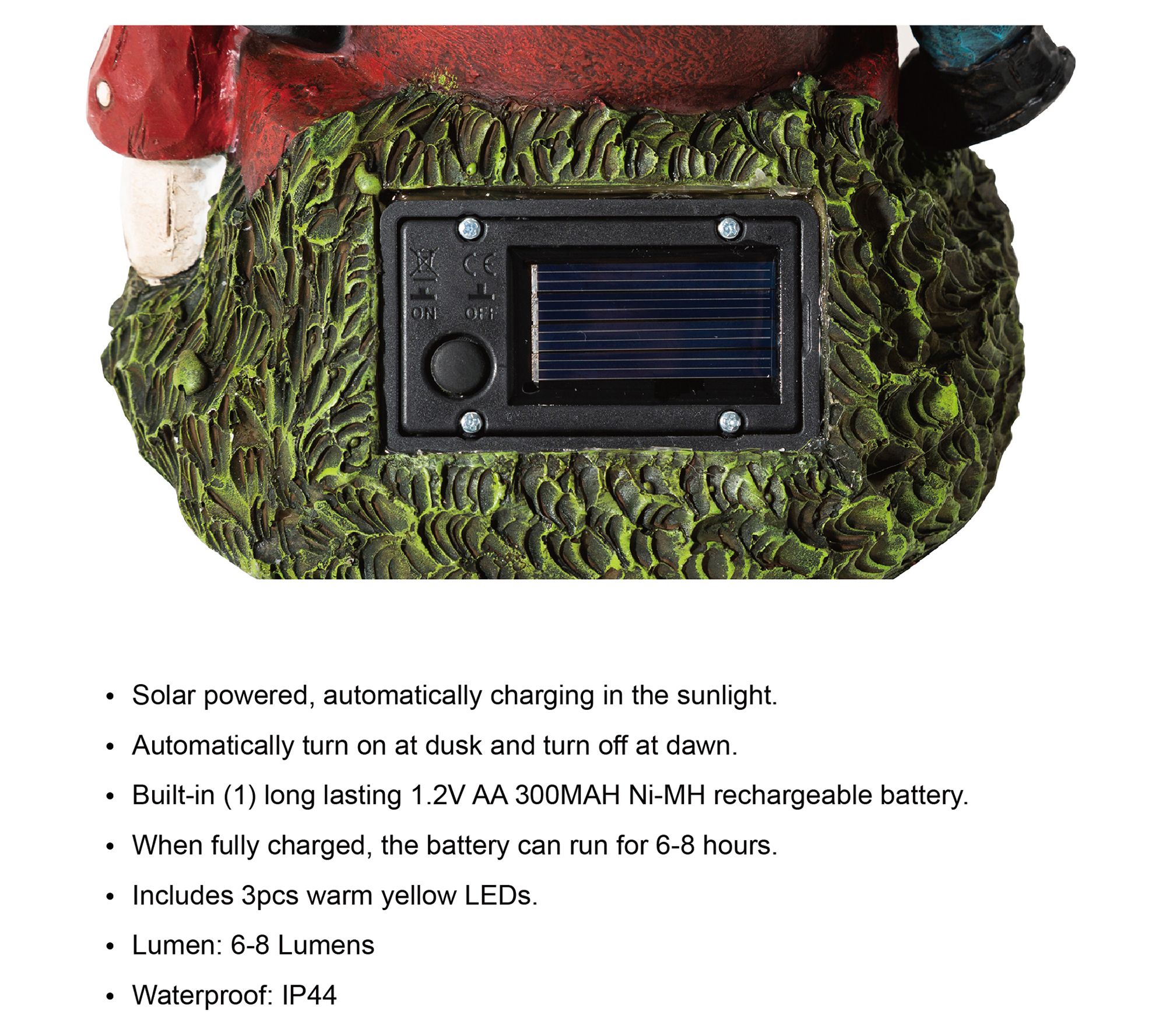 • Includes solar-powered gnome statue with LED light and rechargeable AA Ni-MH battery
