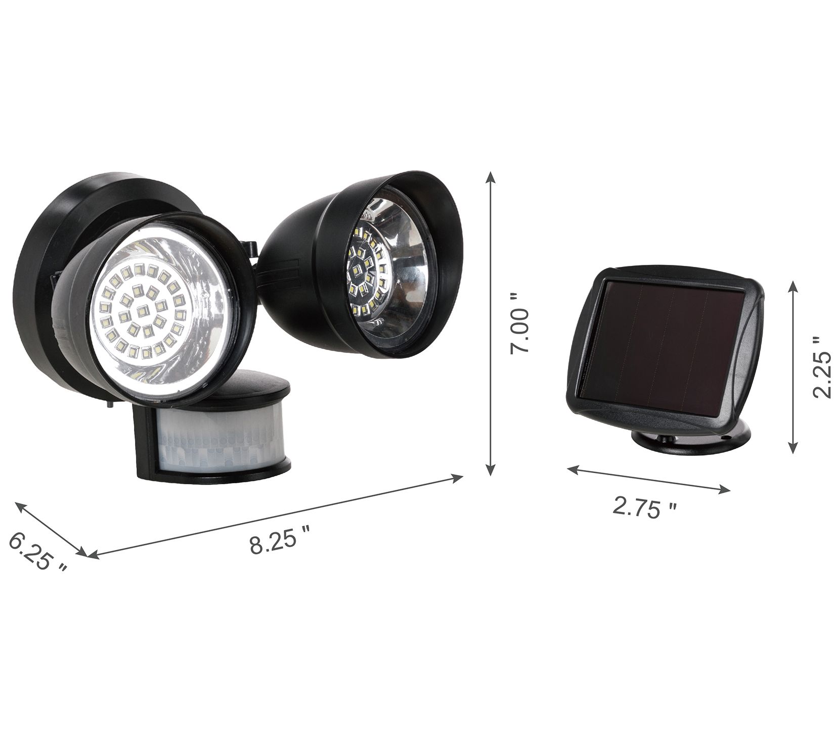 • Measurements: Light 8.25"L x 6.25"W x 7"H; Solar panel 2.75"L x 2.75"W x 2.25"H
