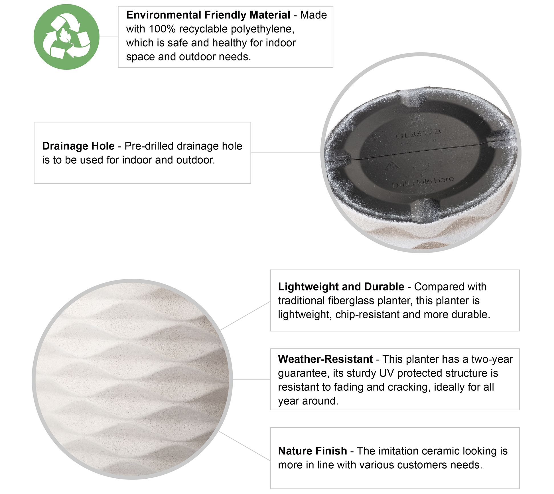 • Drainage holes to prevent overwatering