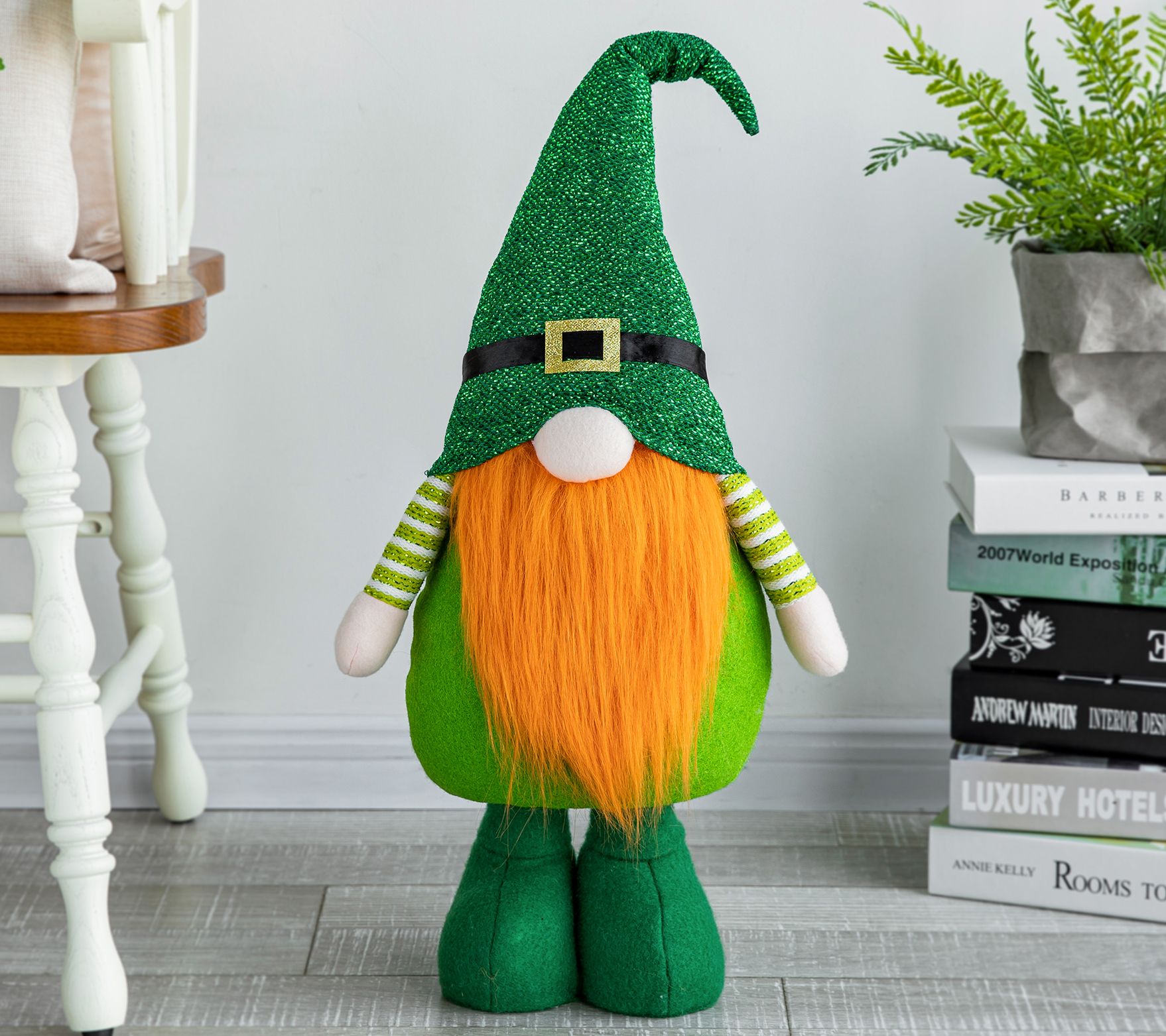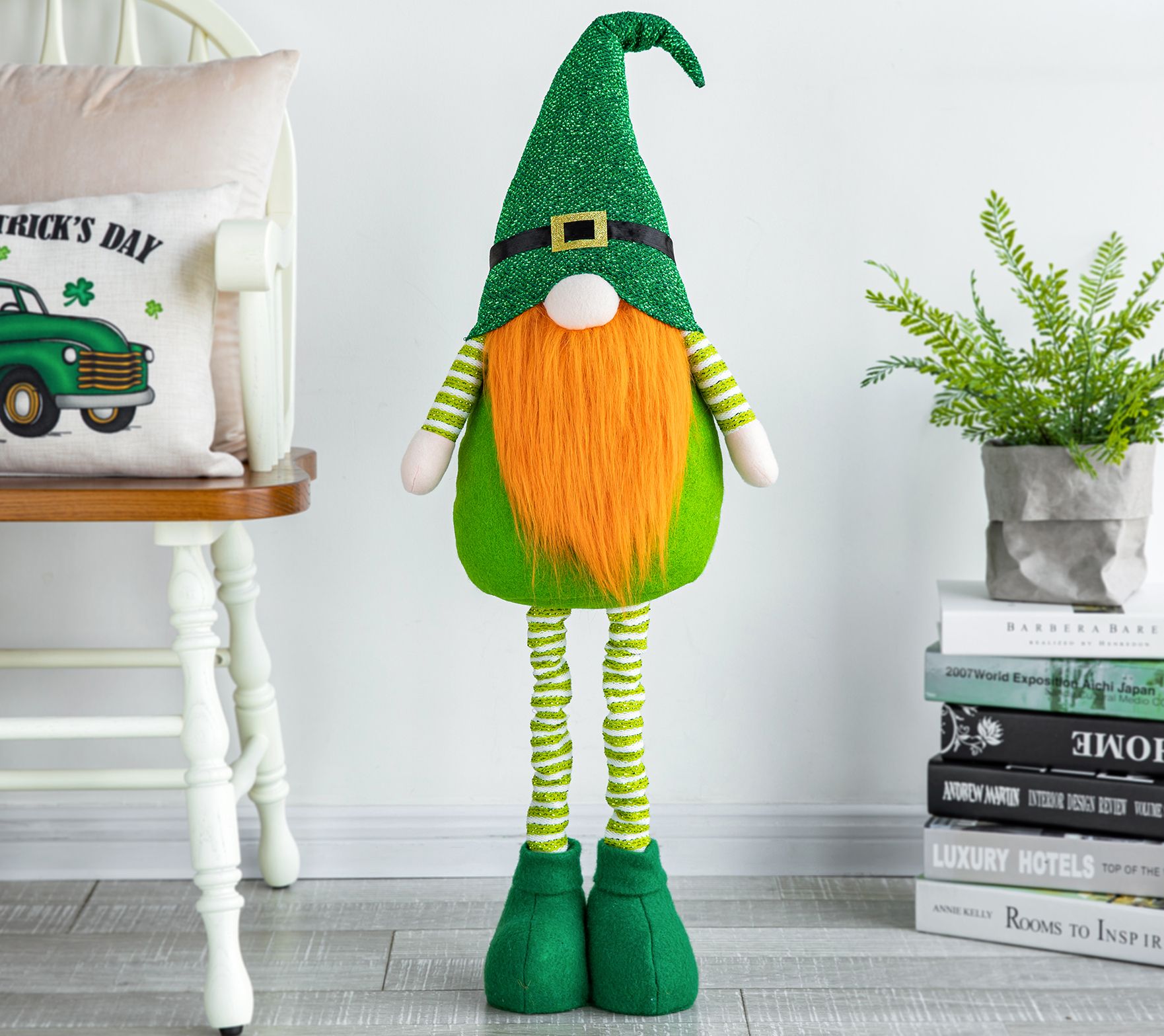 With his orange beard and bright green outfit, this festive little leprechaun gnome is ready to celebrate St. Patrick's Day in style, with telescoping legs that can be positioned from short to tall. From Glitzhome.
