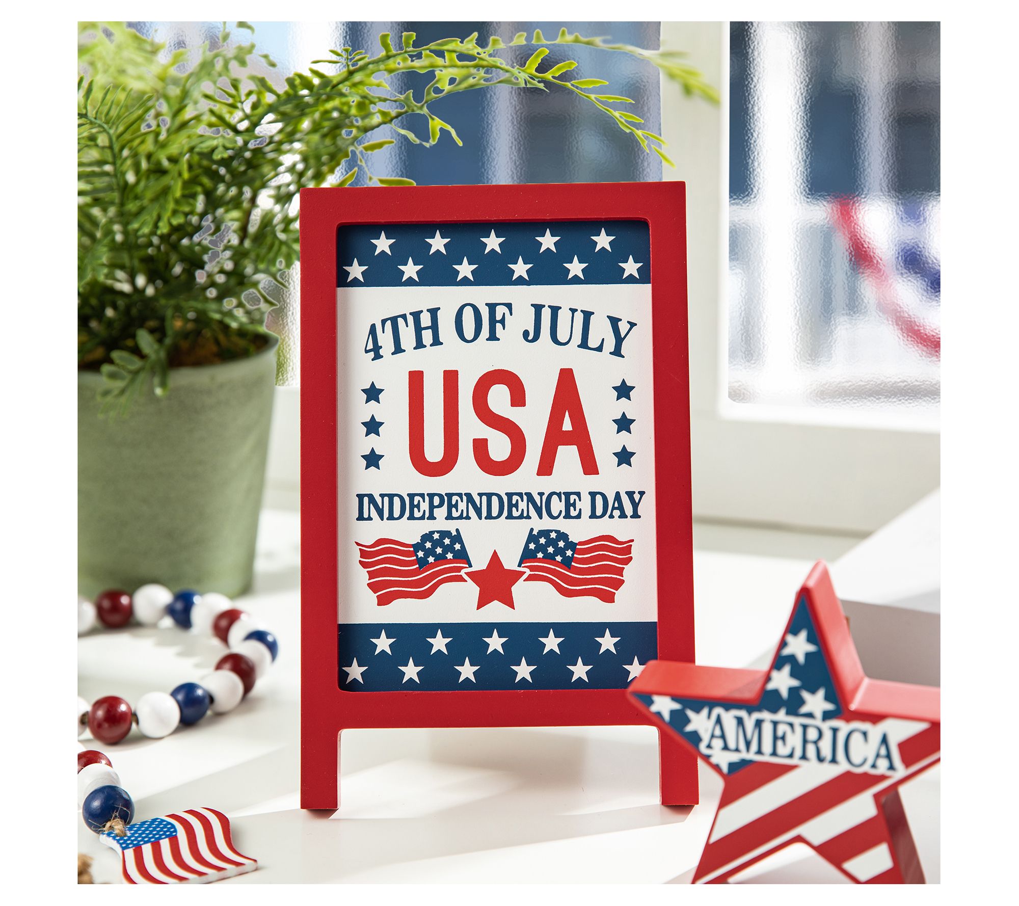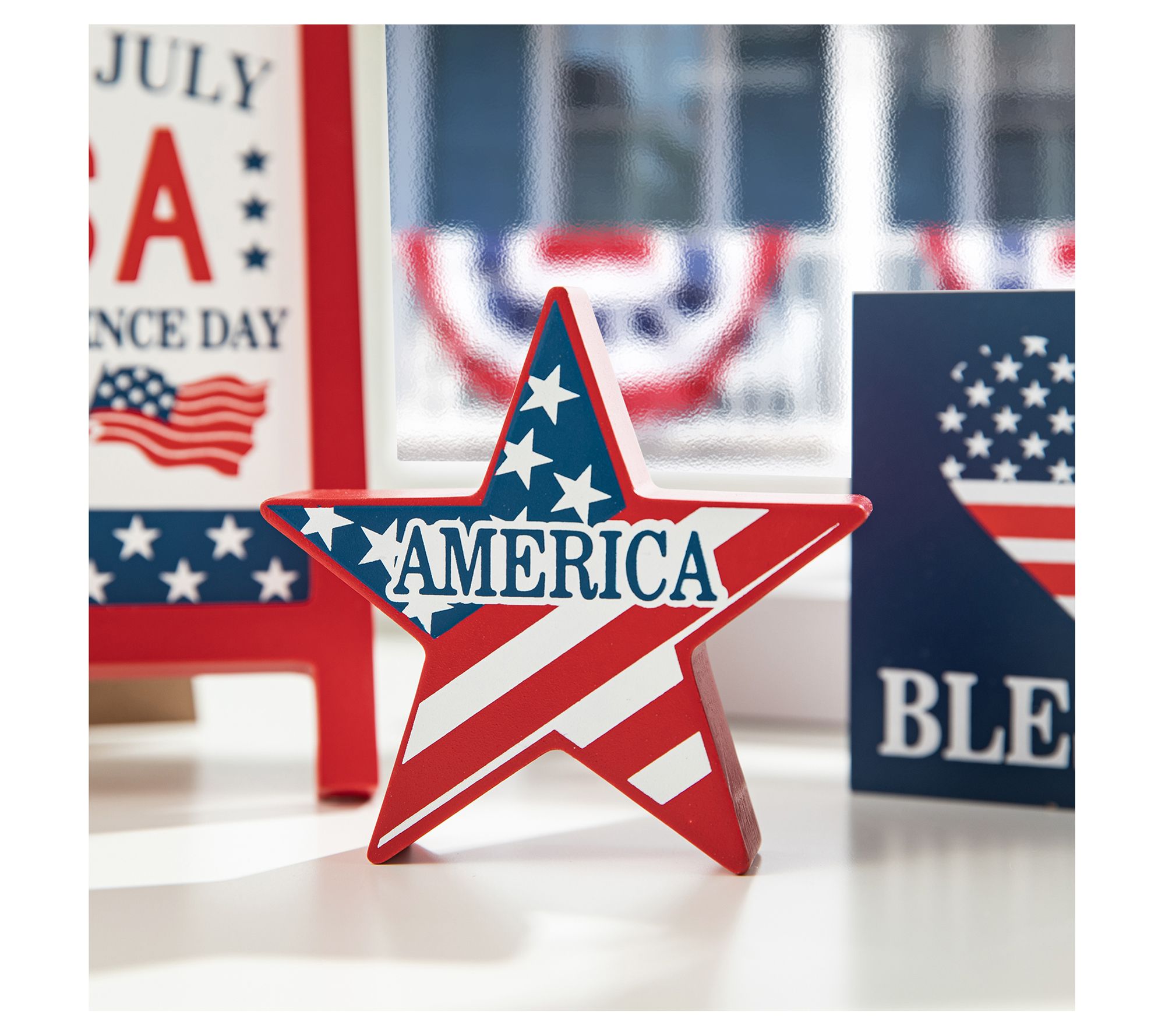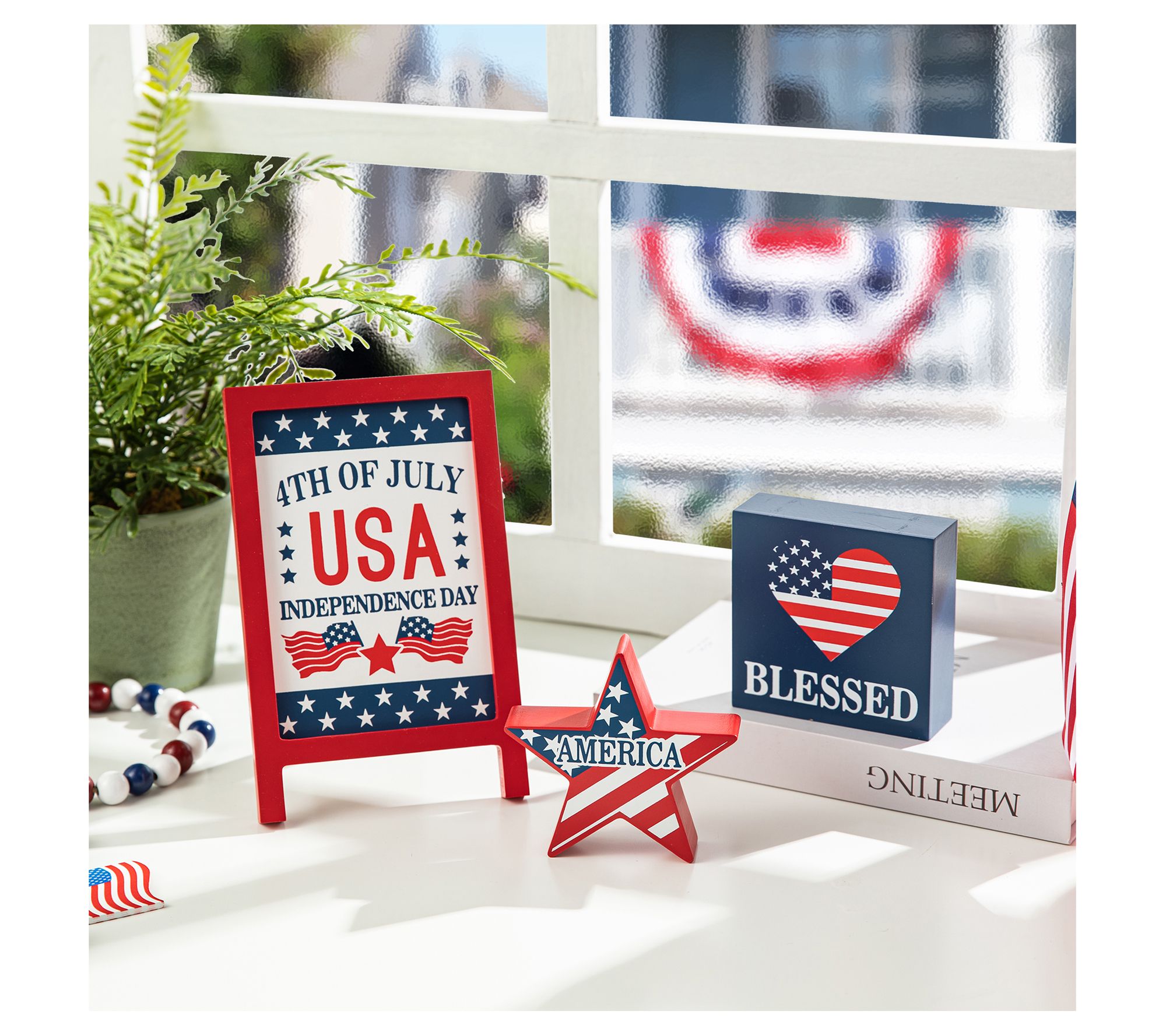 Celebrate Independence Day with a touch of charm using Glitzhome's set of three Patriotic Americana Wooden Block Table Signs. These delightful decorations are perfect for adding a festive spirit to your home, with each sign showcasing unique shapes and patriotic designs. Ideal for tabletop display, they effortlessly bring the spirit of the holiday to life. From Glitzhome.