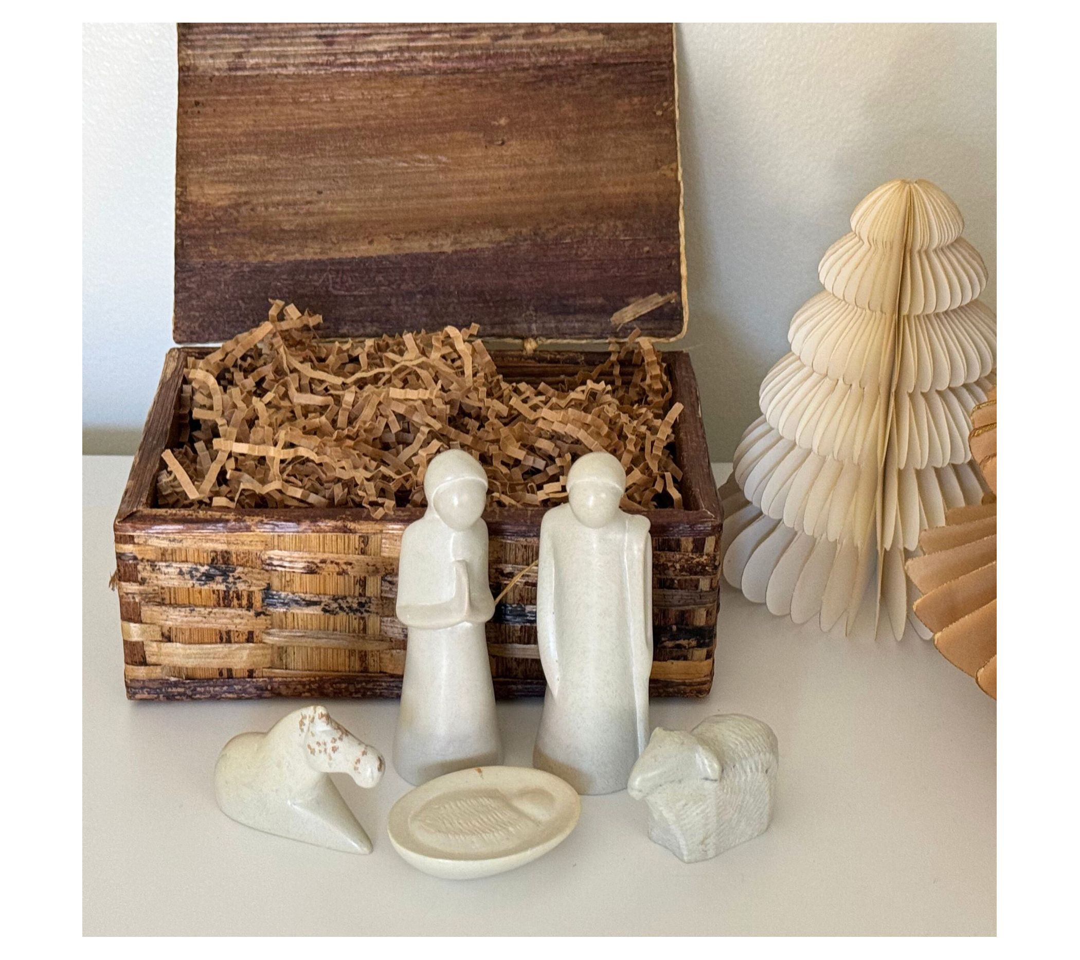 Embrace the spirit of the season with the Global Crafts 5-piece holy family soapstone nativity set. Each piece is meticulously carved from natural soapstone, showcasing the timeless Christmas story. The set comes in a charming banana fiber barn box, perfect for storage and display. From Global Crafts.