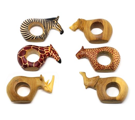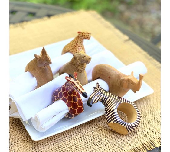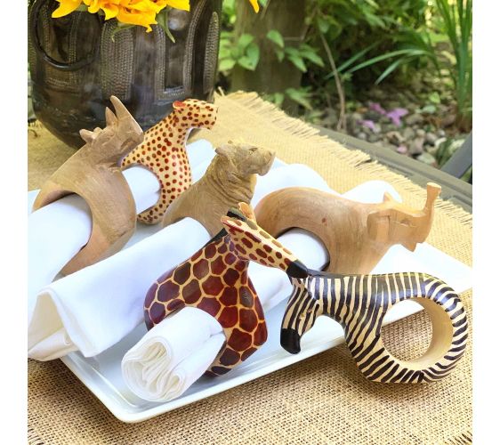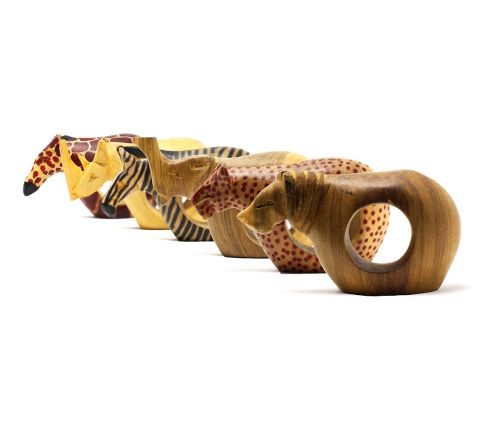 Add a touch of the wild to your dining table with the Global Crafts African carved mahogany animal napkin rings. This distinctive set includes six different safari animals, creating an instant conversation starter. From Global Crafts.