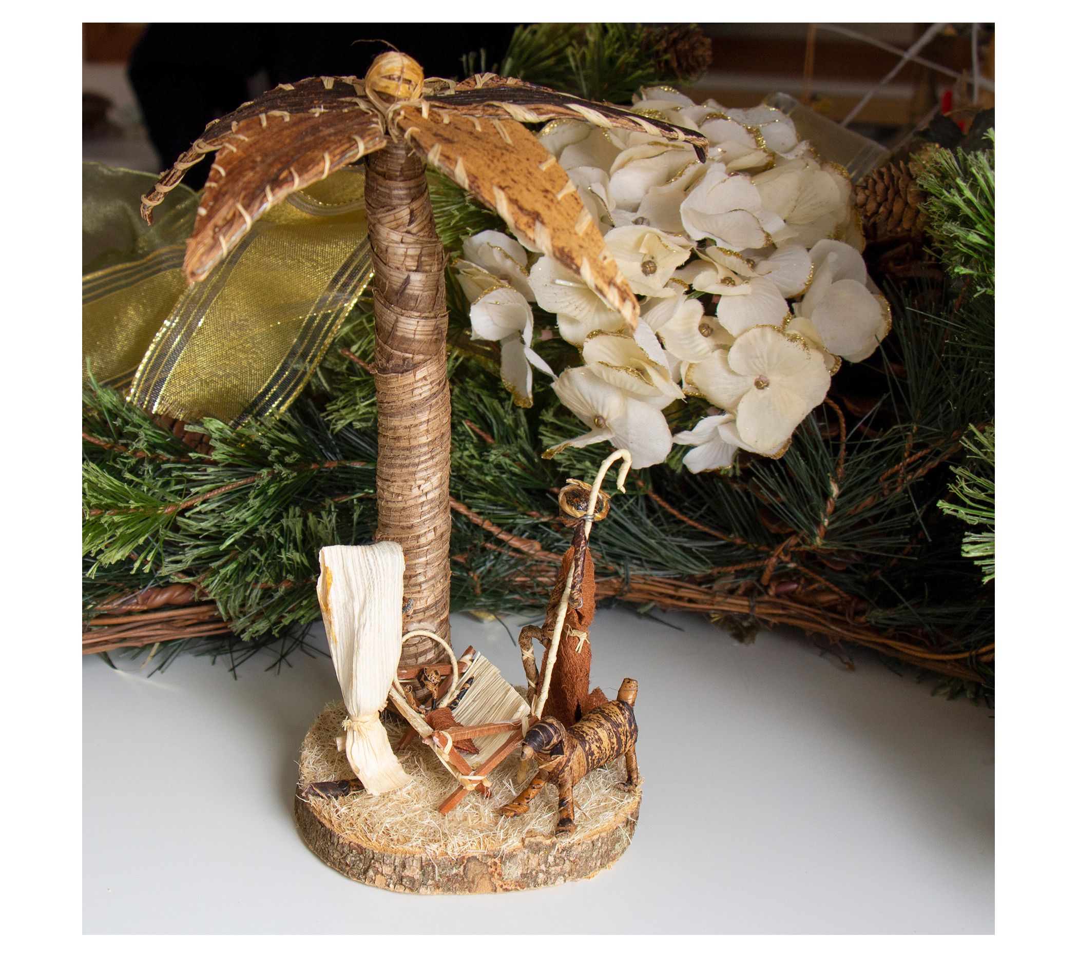 Add a touch of tradition to your holiday decor with the Global Crafts banana fiber palm tree nativity tabletop scene. Crafted from banana leaves, this unique piece showcases the Holy Family under the protective leaves of a palm tree. The tortoise shell finish adds a rustic charm to your home. From Global Crafts.