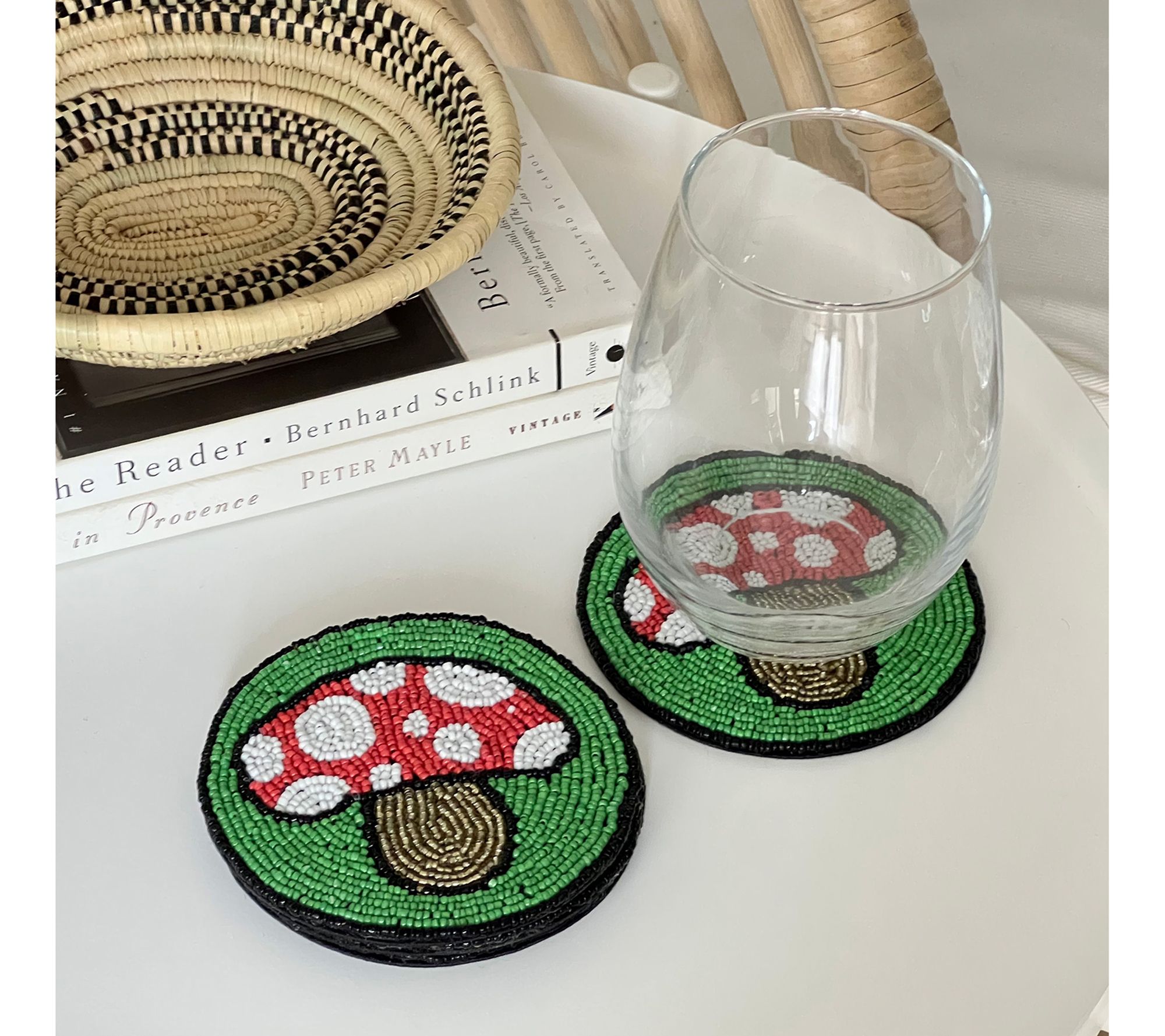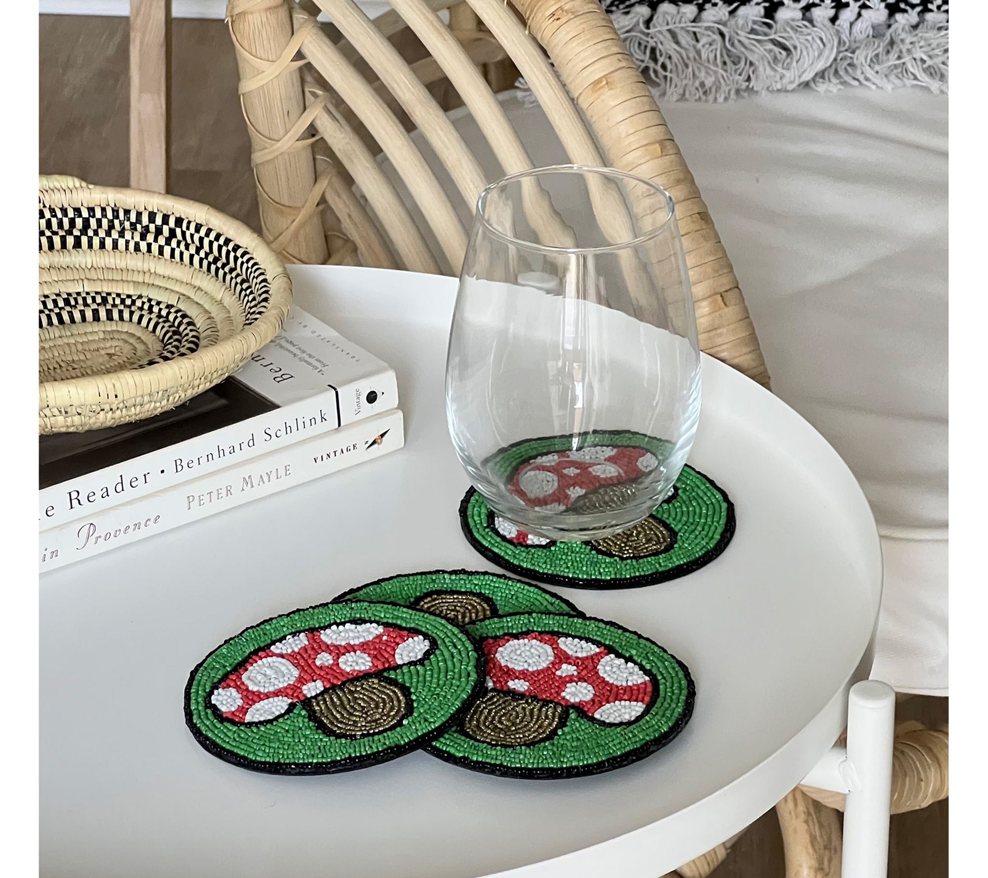 Add a touch of charm to your tabletop with Global Crafts hand embroidered glass bead coasters. Ideal for brightening up your coffee table or making a statement at the bar, each coaster showcases intricate mushroom designs painstakingly assembled by village artisans in India. From Global Crafts.