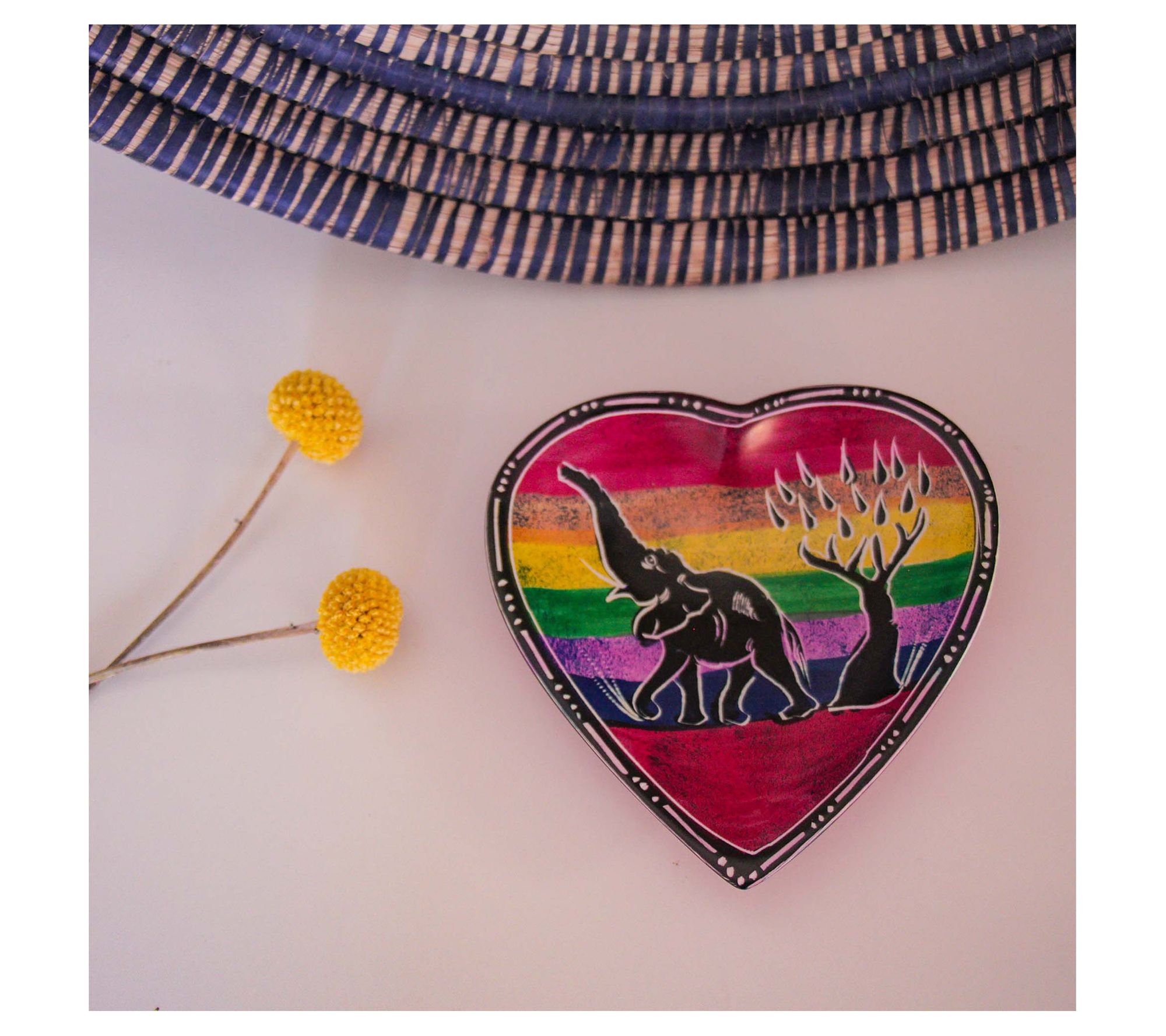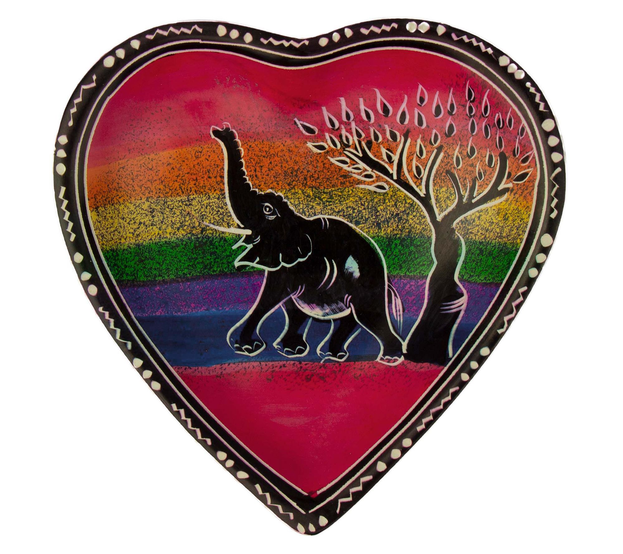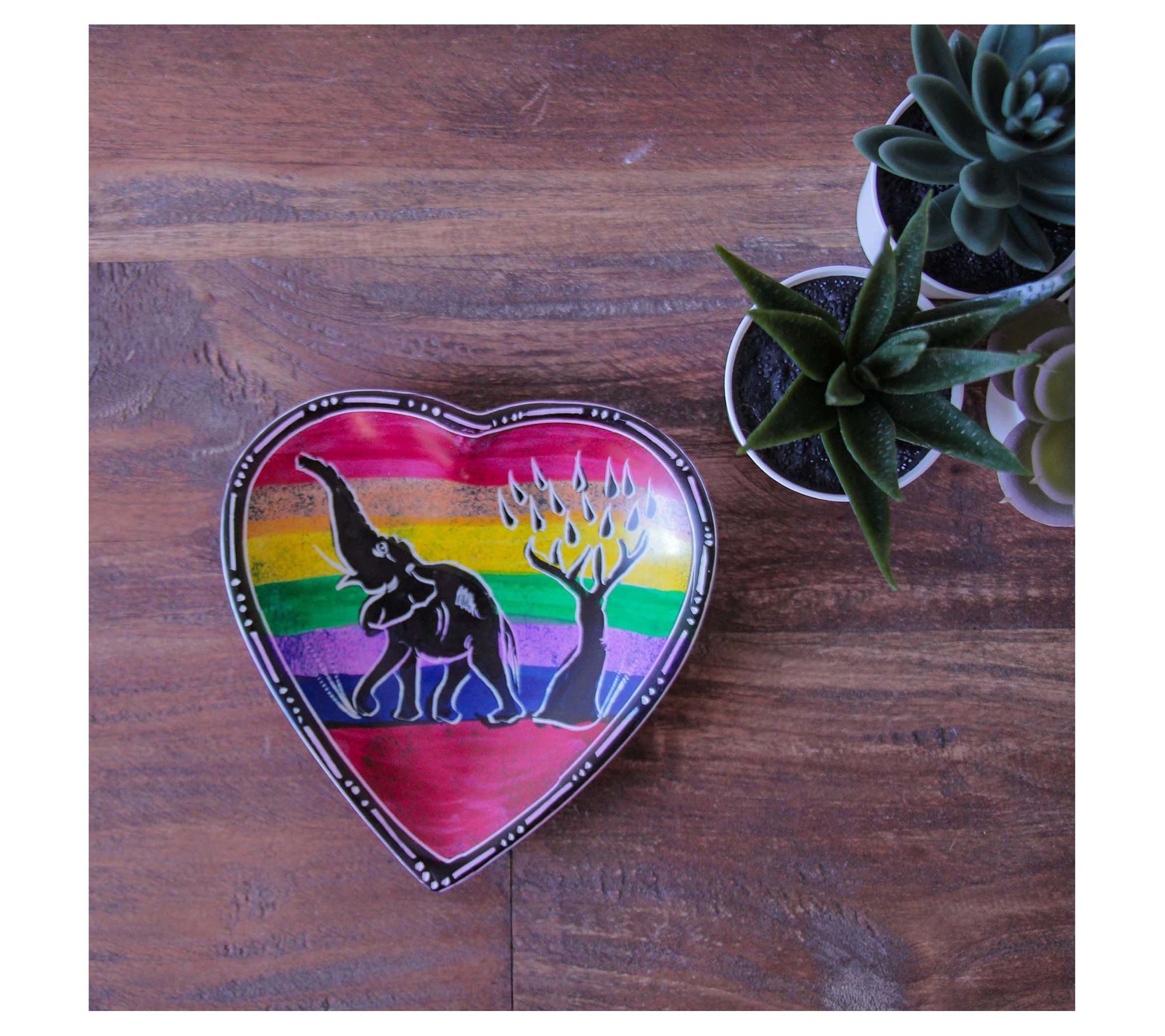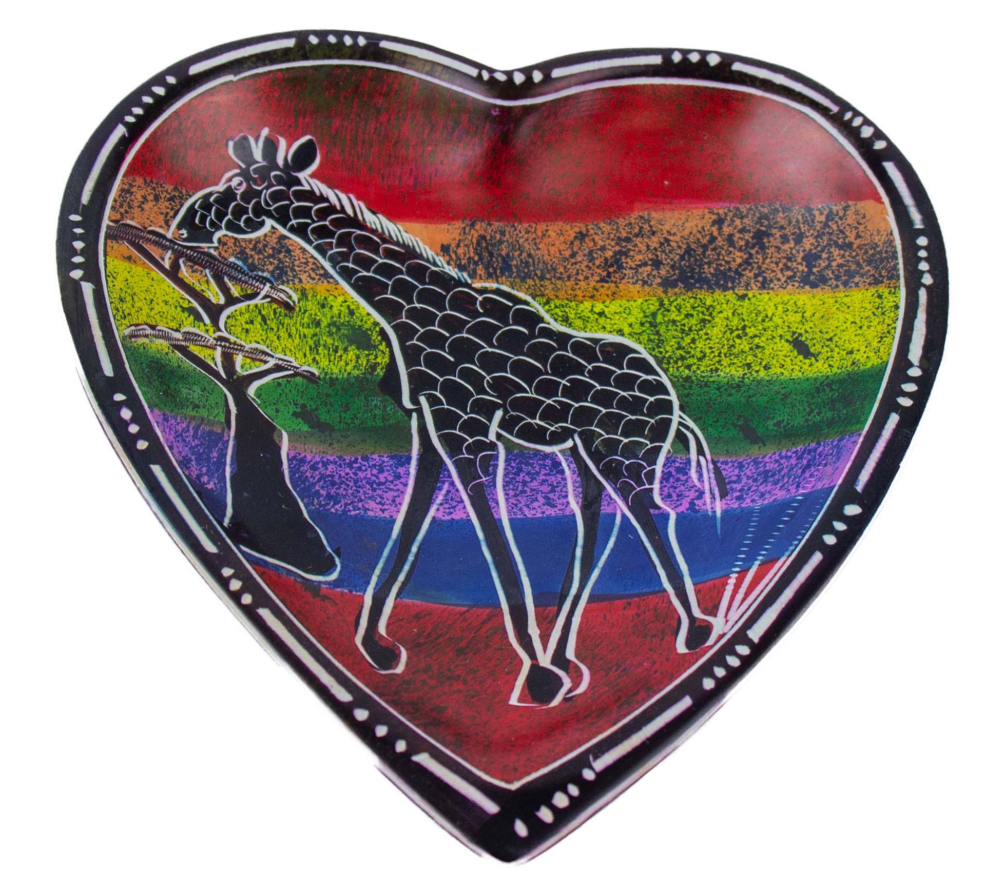 Brighten up your space with these vibrant soapstone heart trinket dishes. Each dish showcases cultural vibrance with captivating depictions of the Maasai Mara's elephant and giraffe. From Global Crafts.