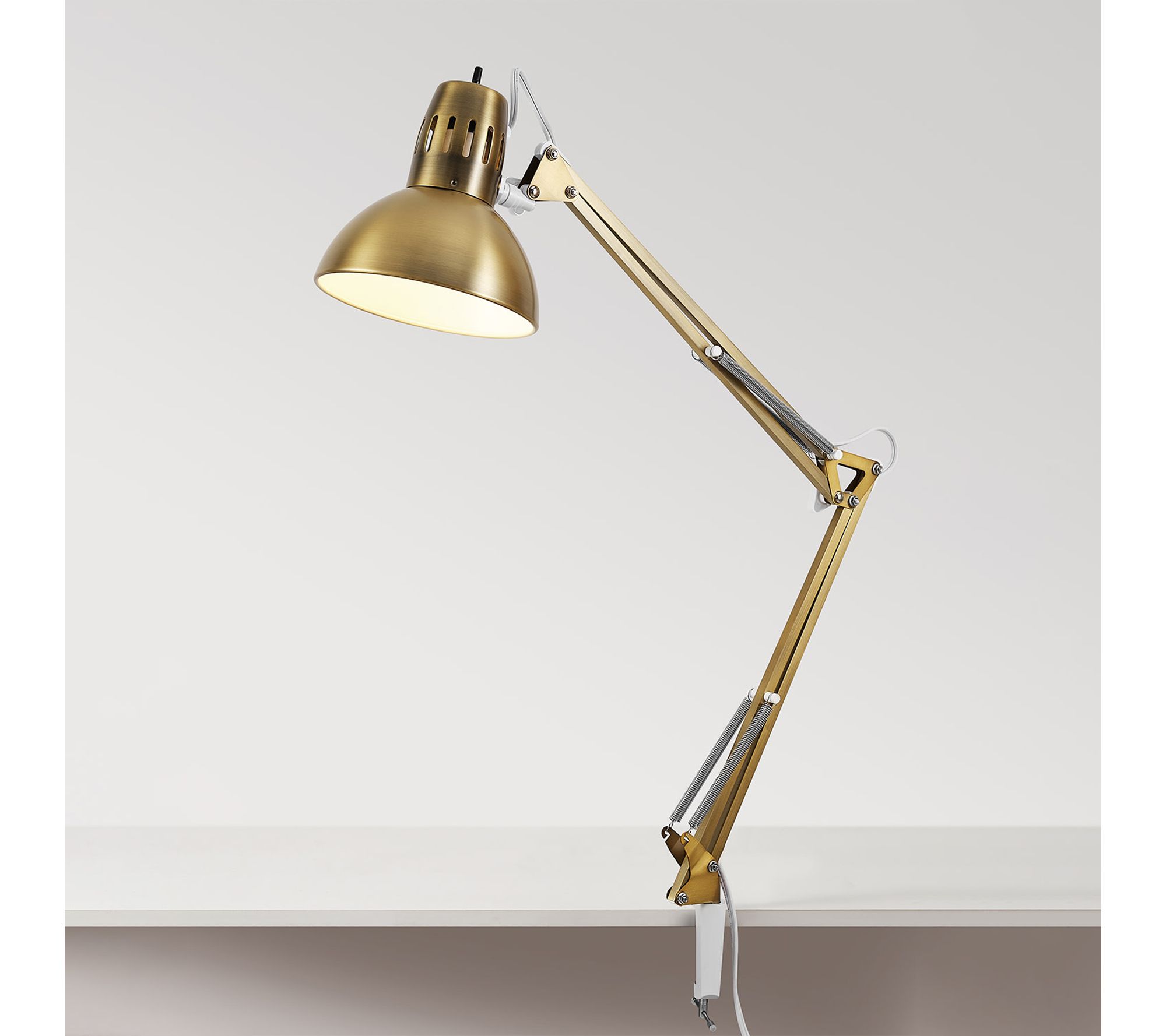 Brighten up your workspace with this multi-joint desk lamp, designed to deliver focused illumination exactly where you need it. The adjustable spring-loaded arm and sturdy clamp base make it easy to secure to any study table or workstation, while the sleek matte brass finish adds a stylish touch to your home office. From Globe Electric.