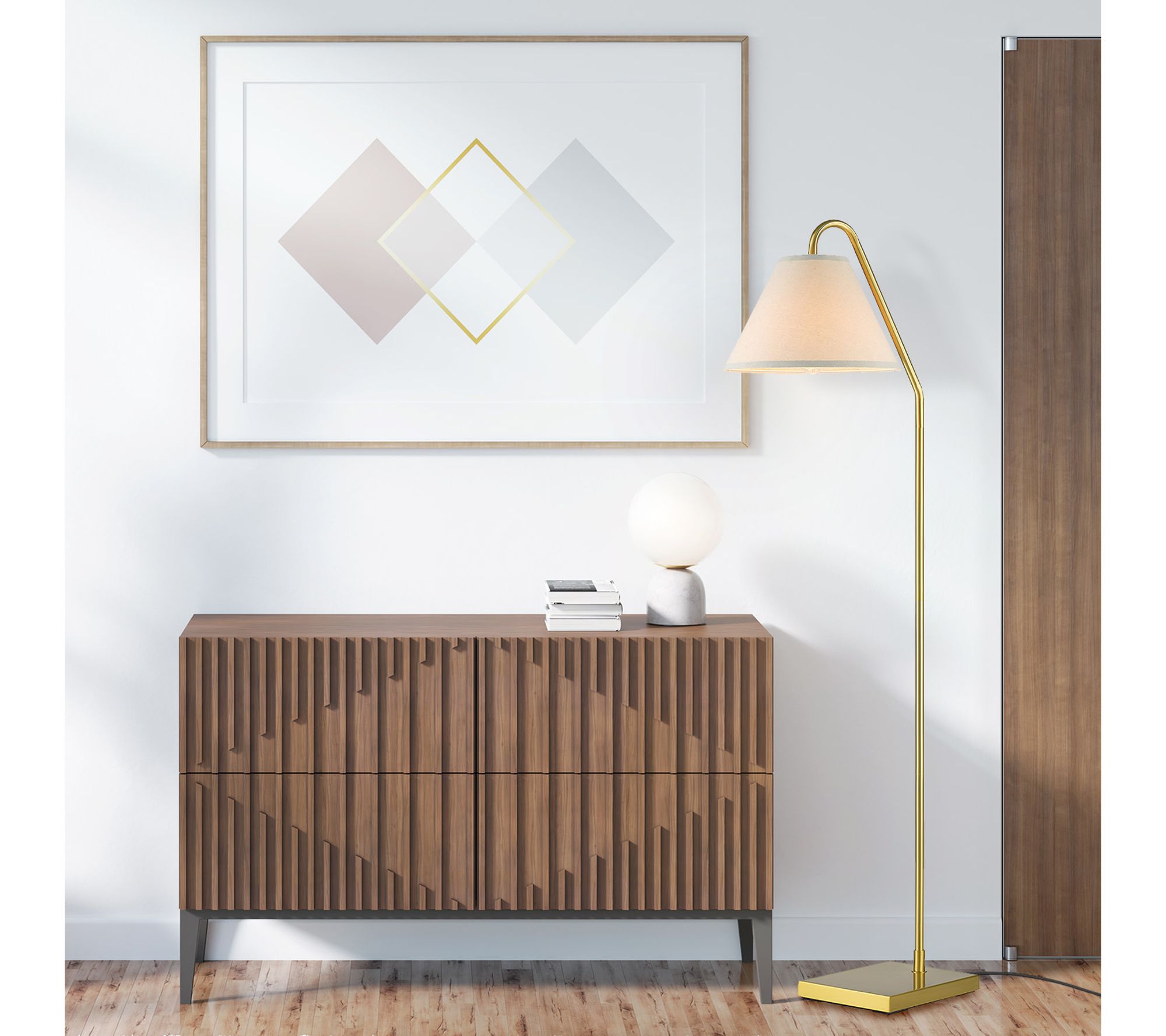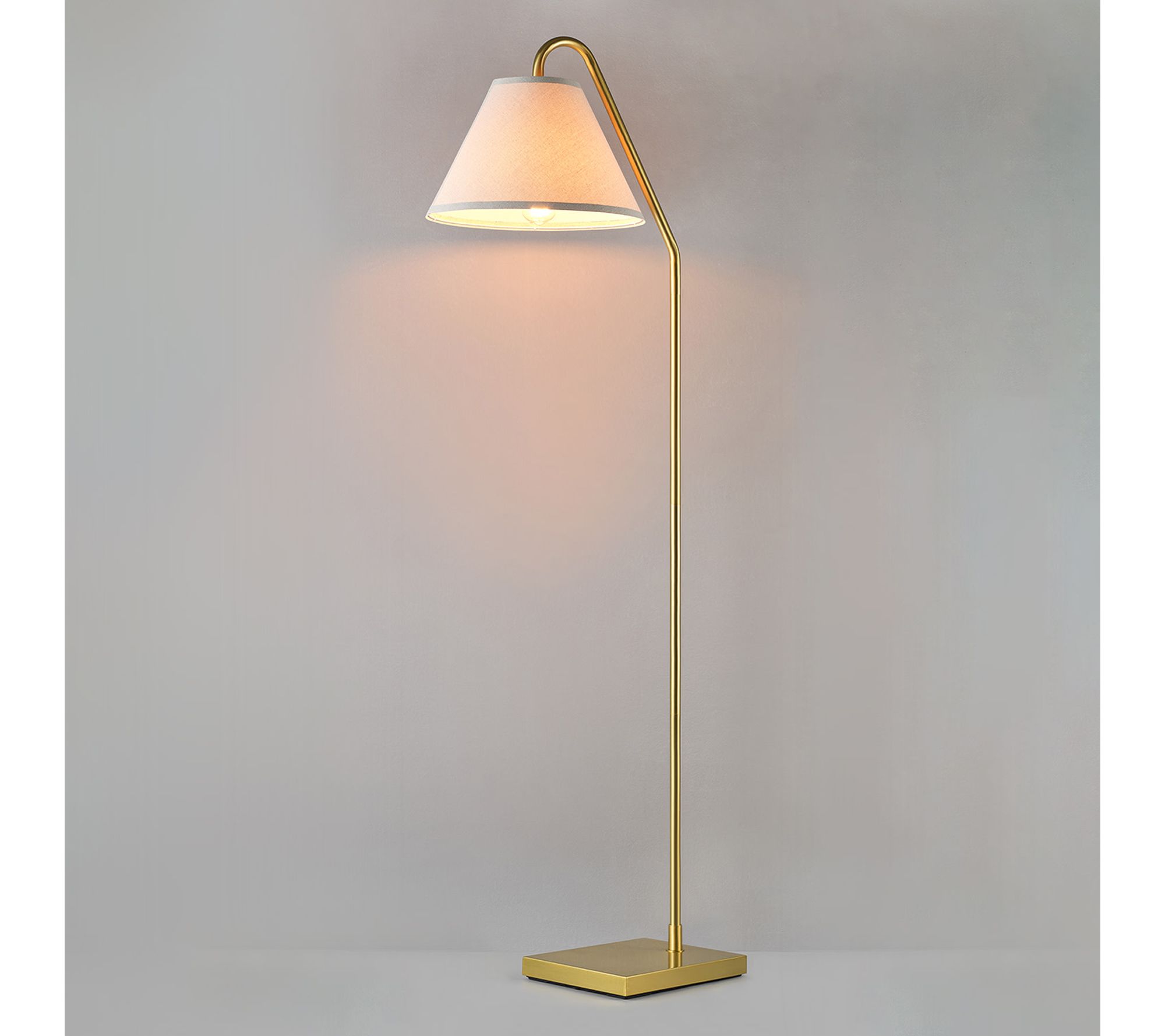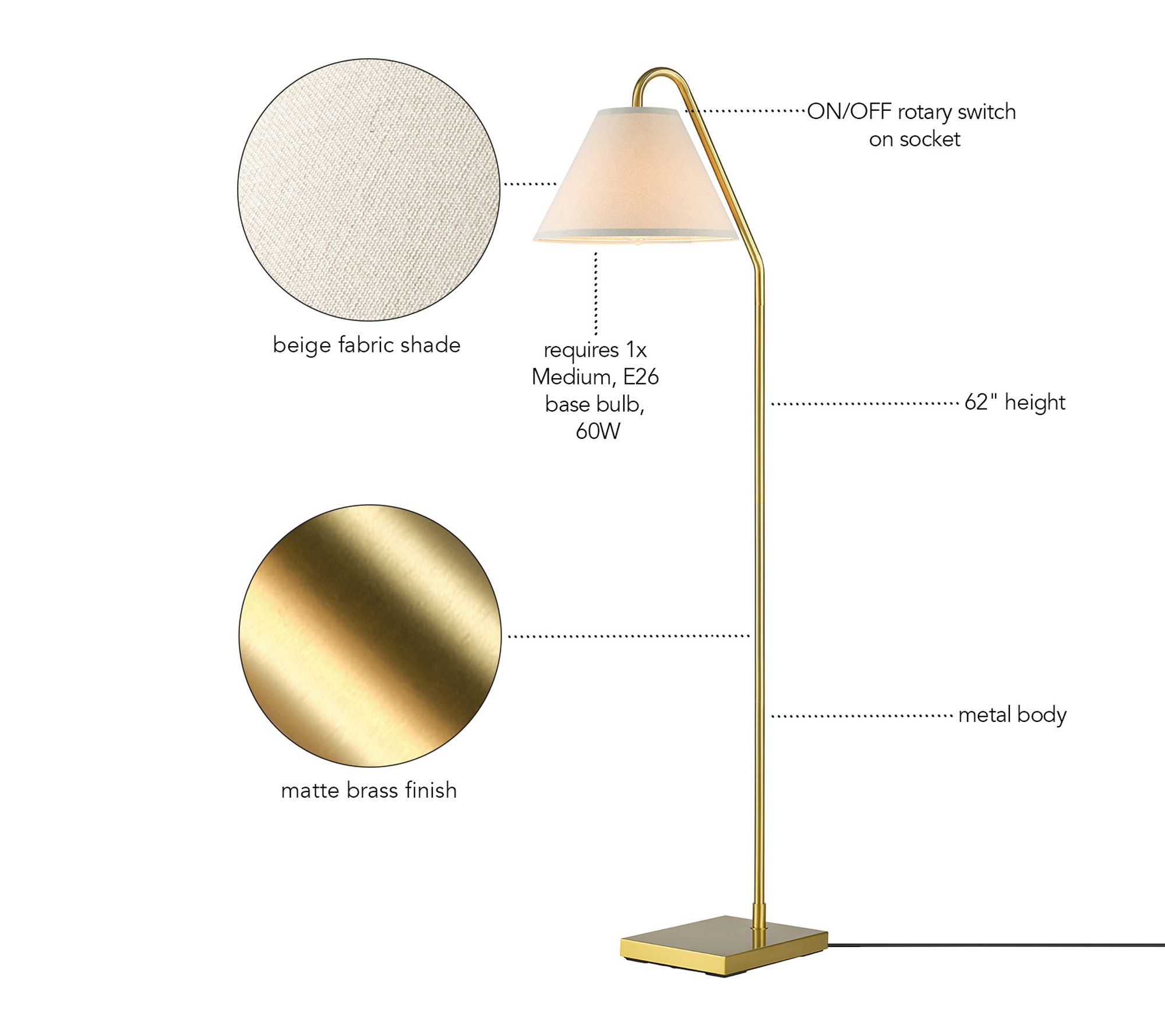 Bring inviting warmth and modern style to your living room with this 62" matte brass floor lamp. The elegant brass finish and beige fabric shade blend seamlessly into any decor, creating a soft, cozy ambiance whether you're reading, unwinding after work, or entertaining friends. Its tall silhouette nestles perfectly beside a sofa or accent chair, making it a standout addition to any room. From Globe Electric.