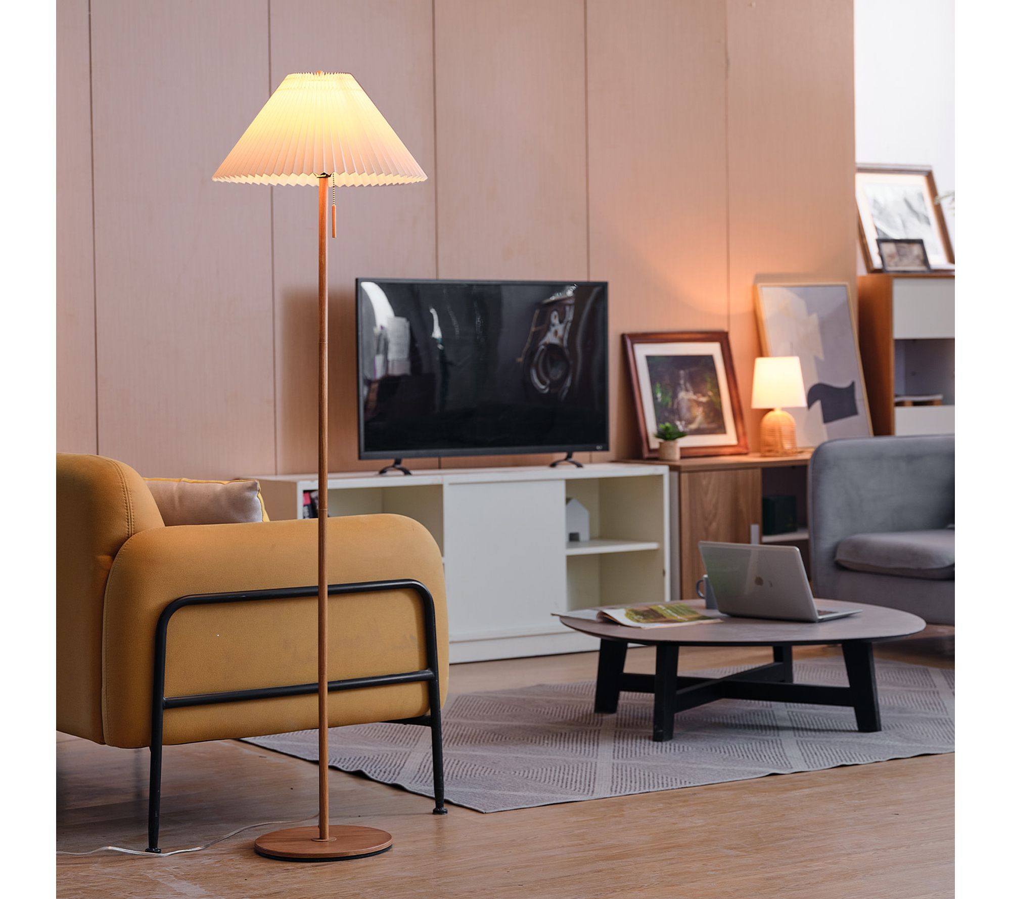 Enjoy a cozy evening reading or relaxing in your favorite chair while warm light from this floor lamp fills the room. A wood-toned finish and pleated fabric shade blend bohemian style with soft, modern ambiance -- ideal for living rooms, bedrooms, or any spot where you want character and comfort. From Globe Electric.