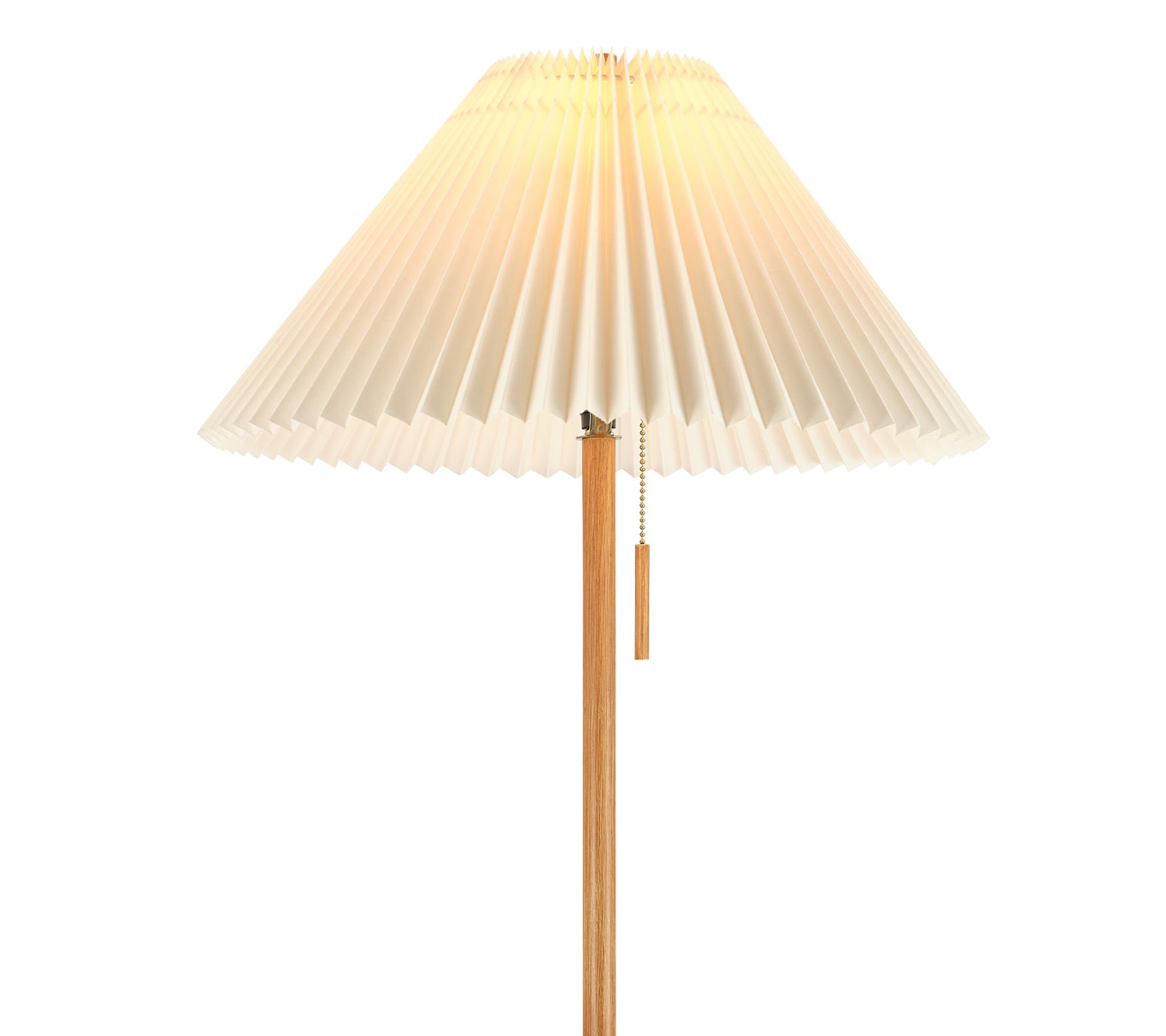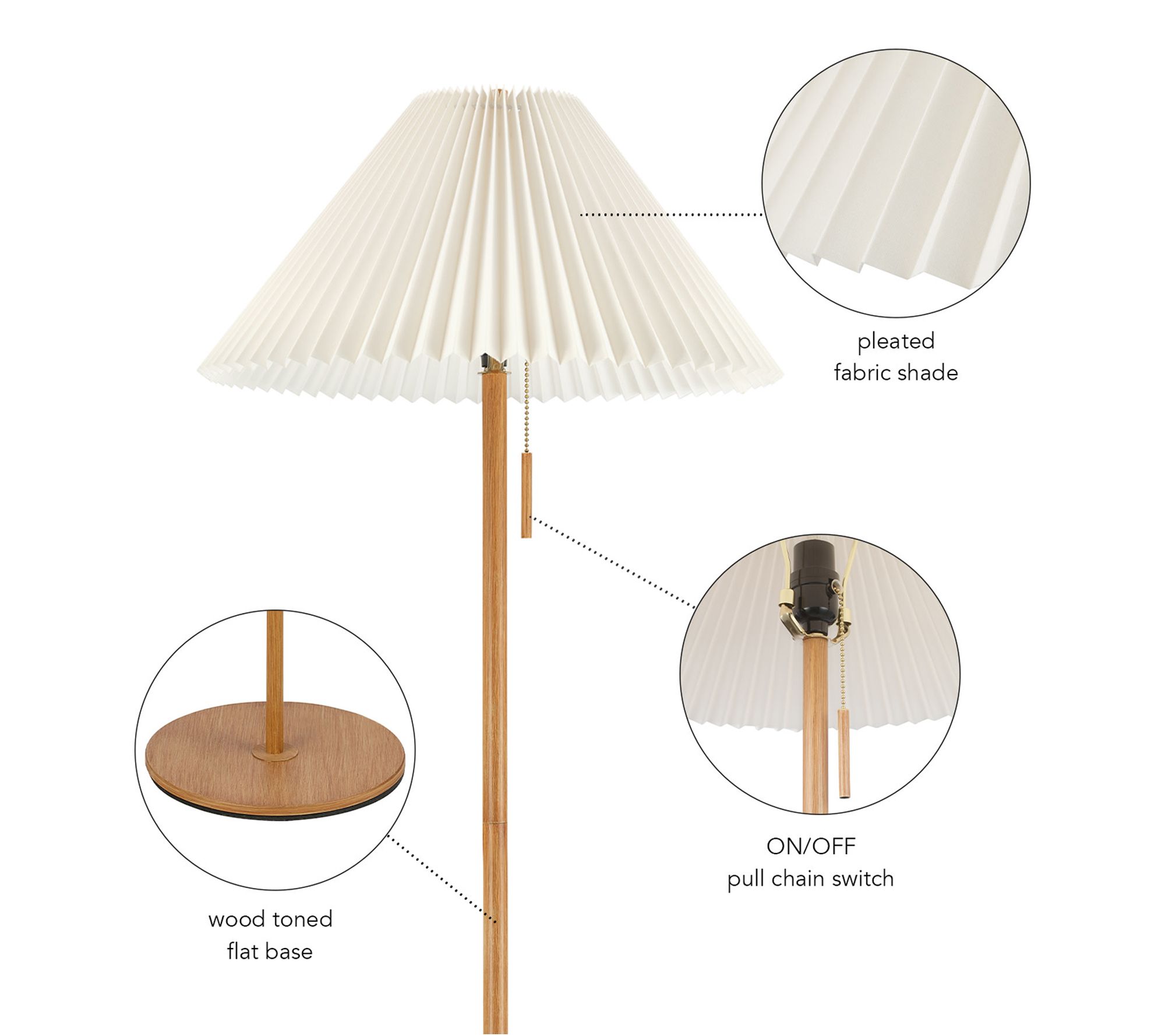 • Wood-toned finish with pleated fabric shade