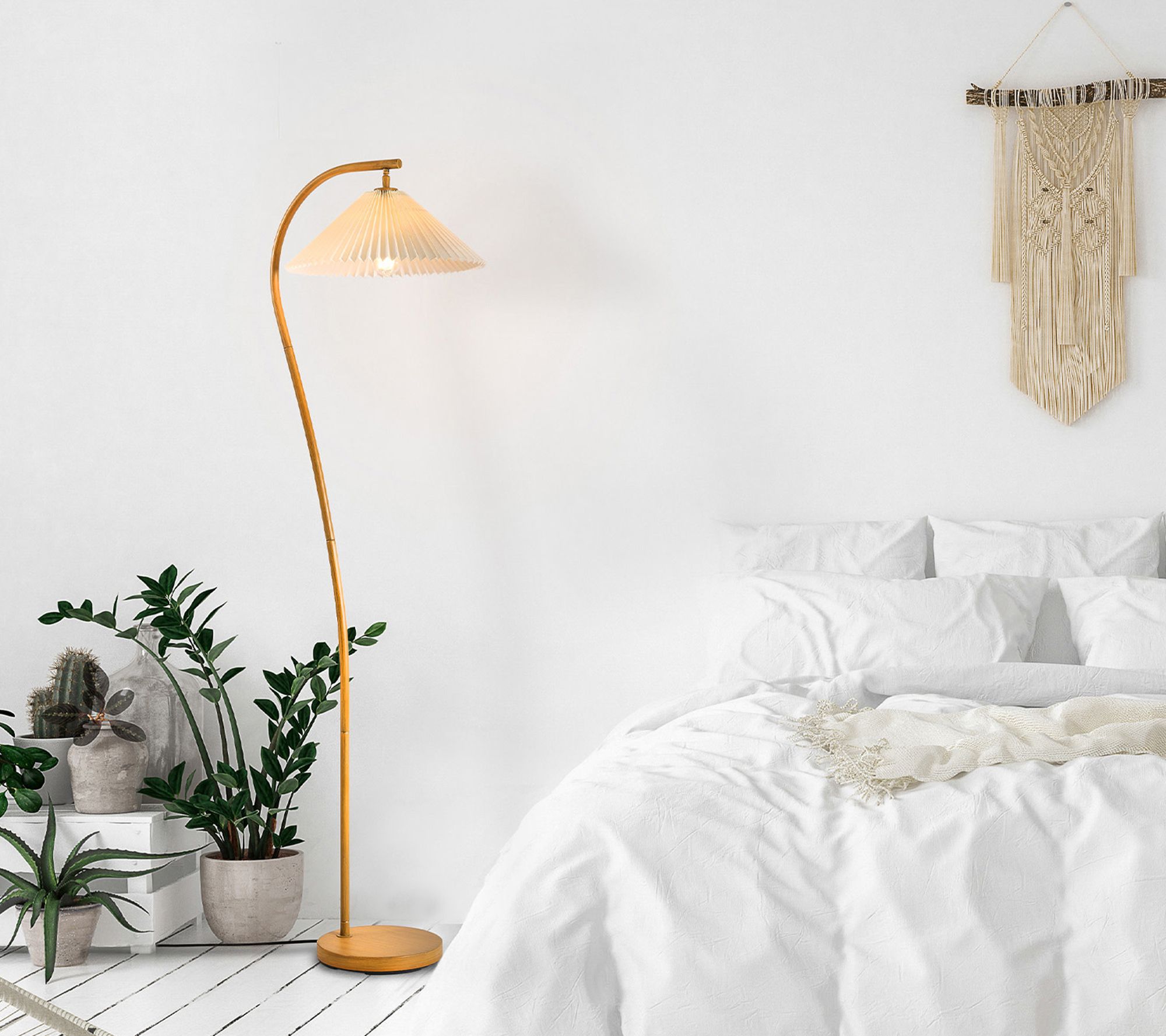 • Wood toned finish with a white fabric shade and bohemian design
