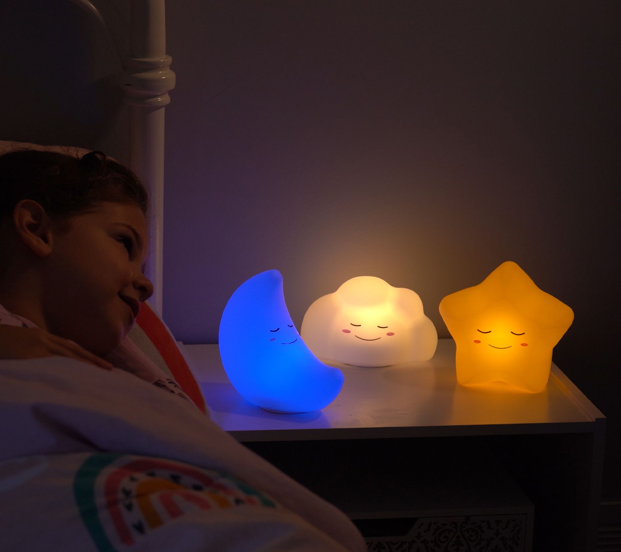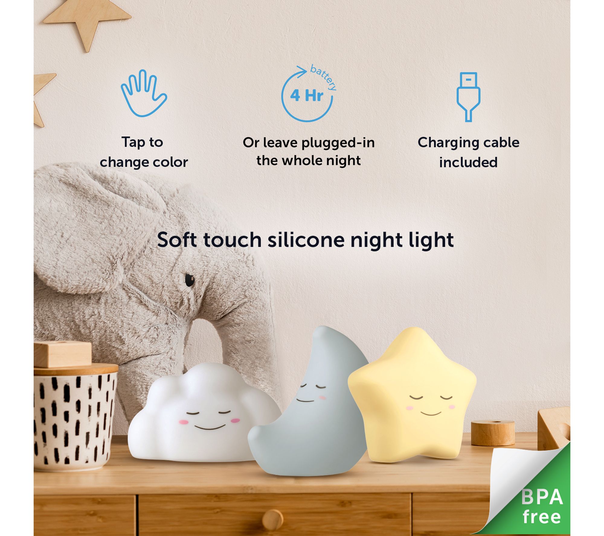 • Includes moon night light, star night light, cloud night light, and charging cable