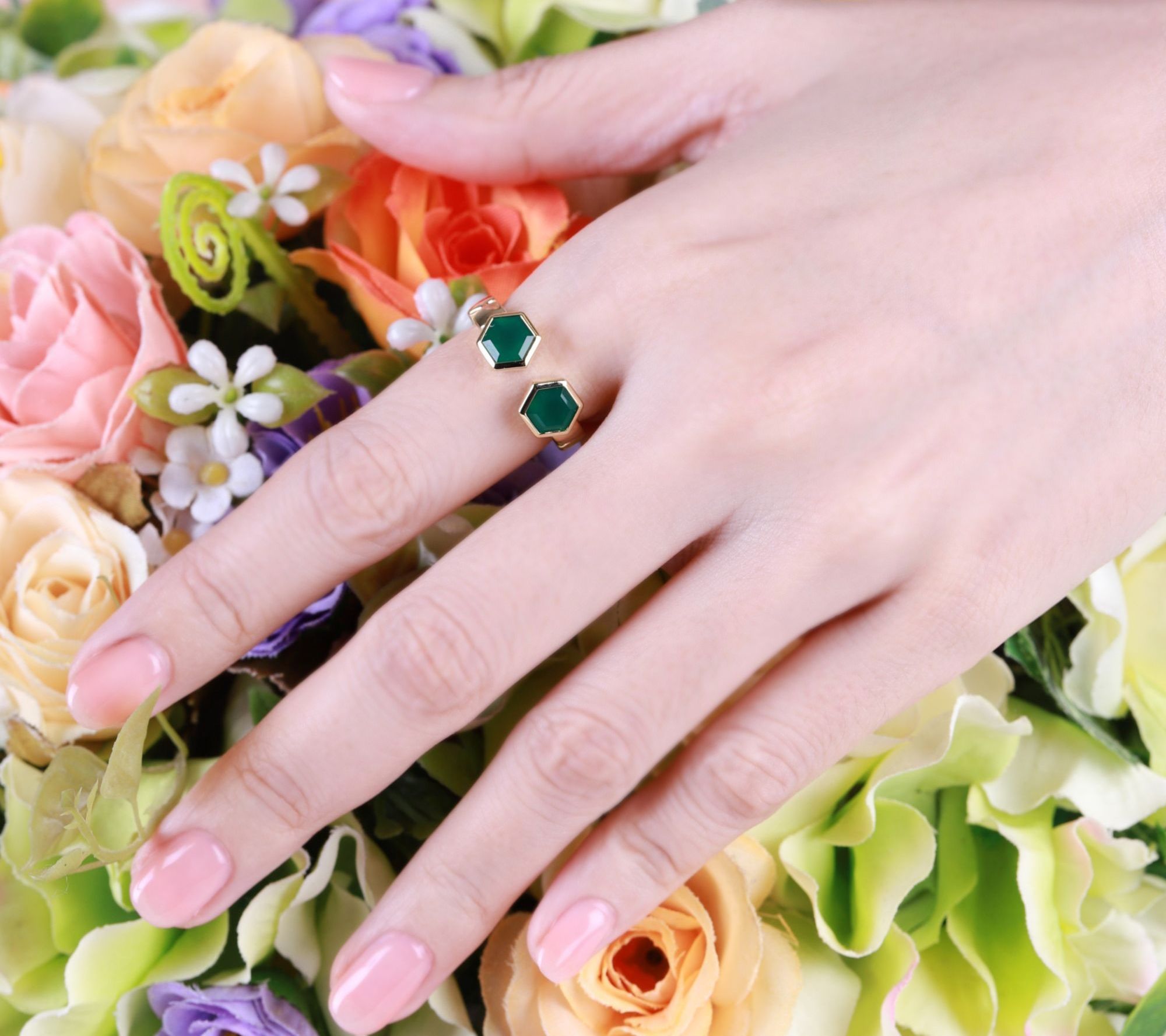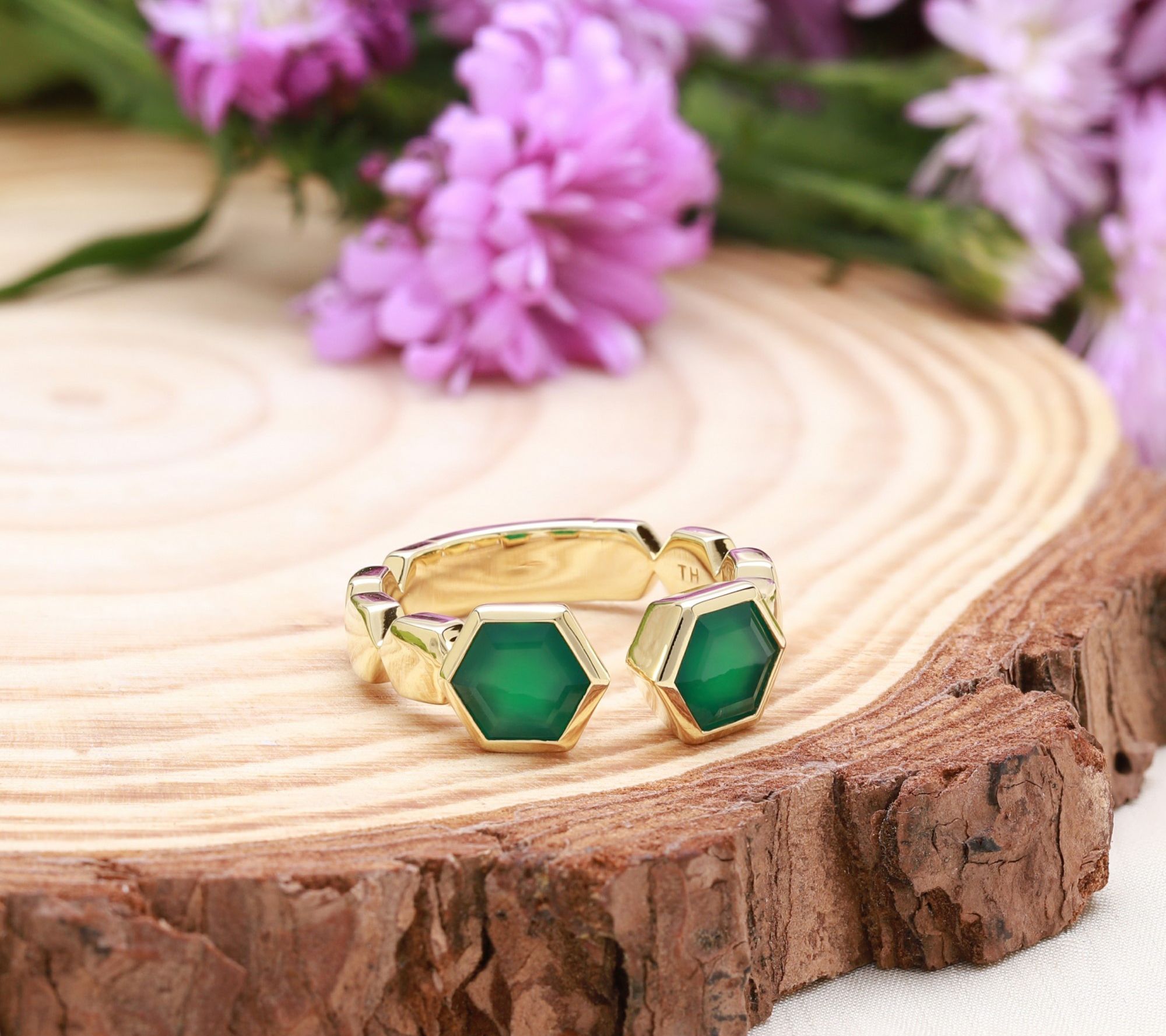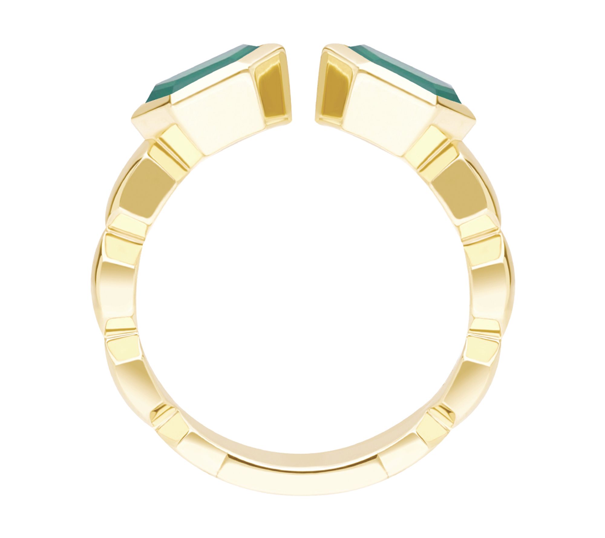 • Cuff ring with two bezel-set, hexagon-cut green chalcedony stones