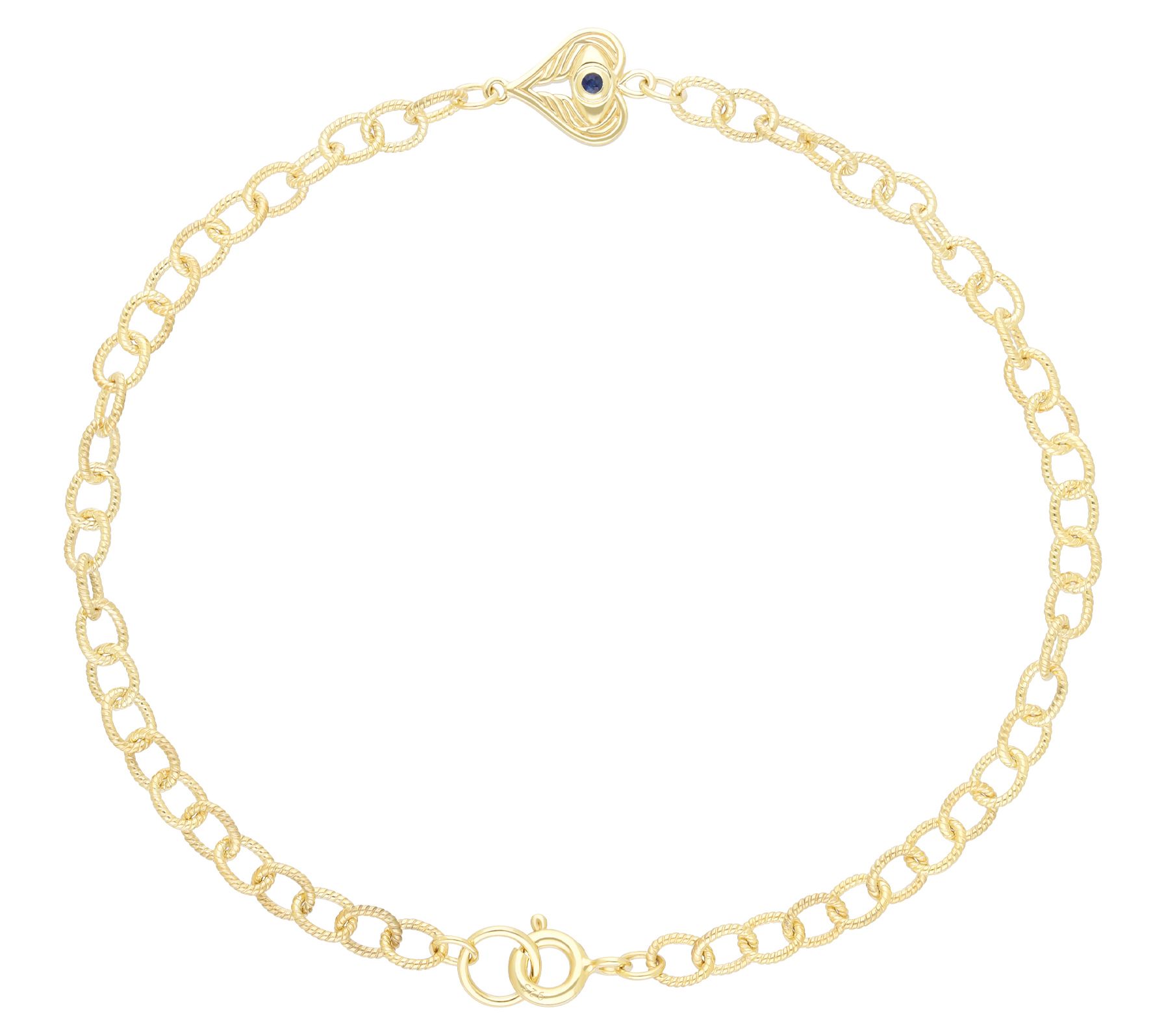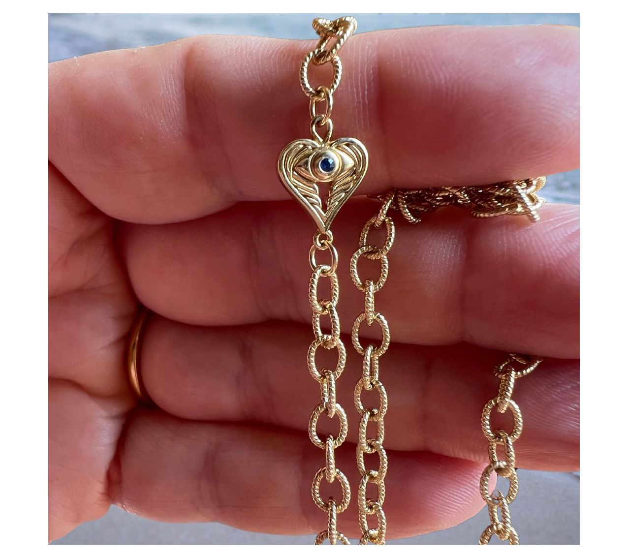 Oval link chain; angel wing and angel-eye heart charm with bezel-set blue sapphire