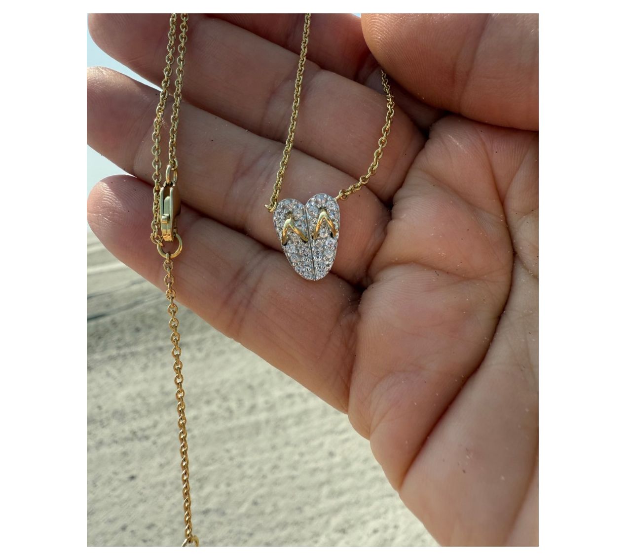 Designed with two connecting flip flops to form a heart; filled with pave-set white topaz stones and wishbone thongs; cable chain