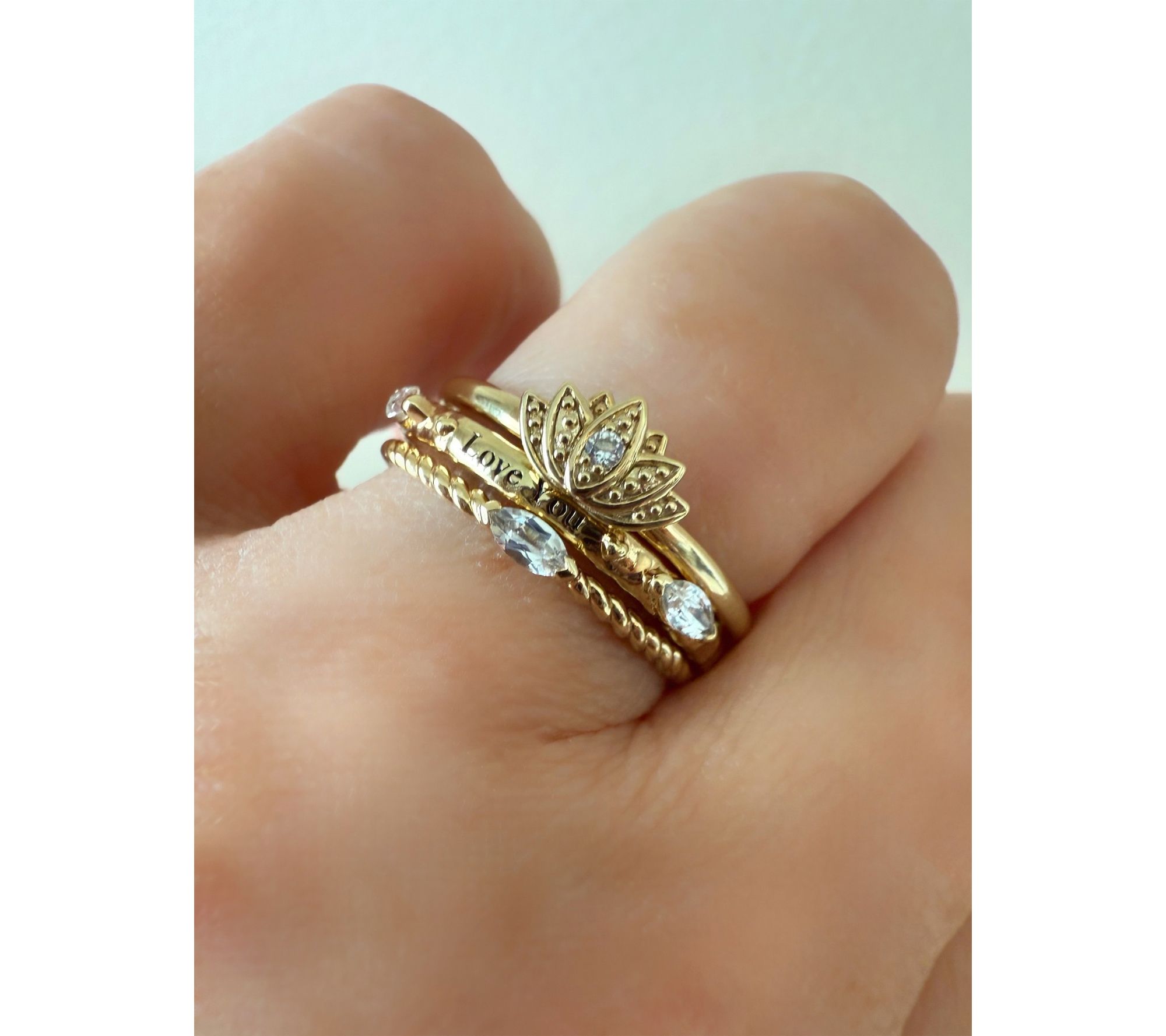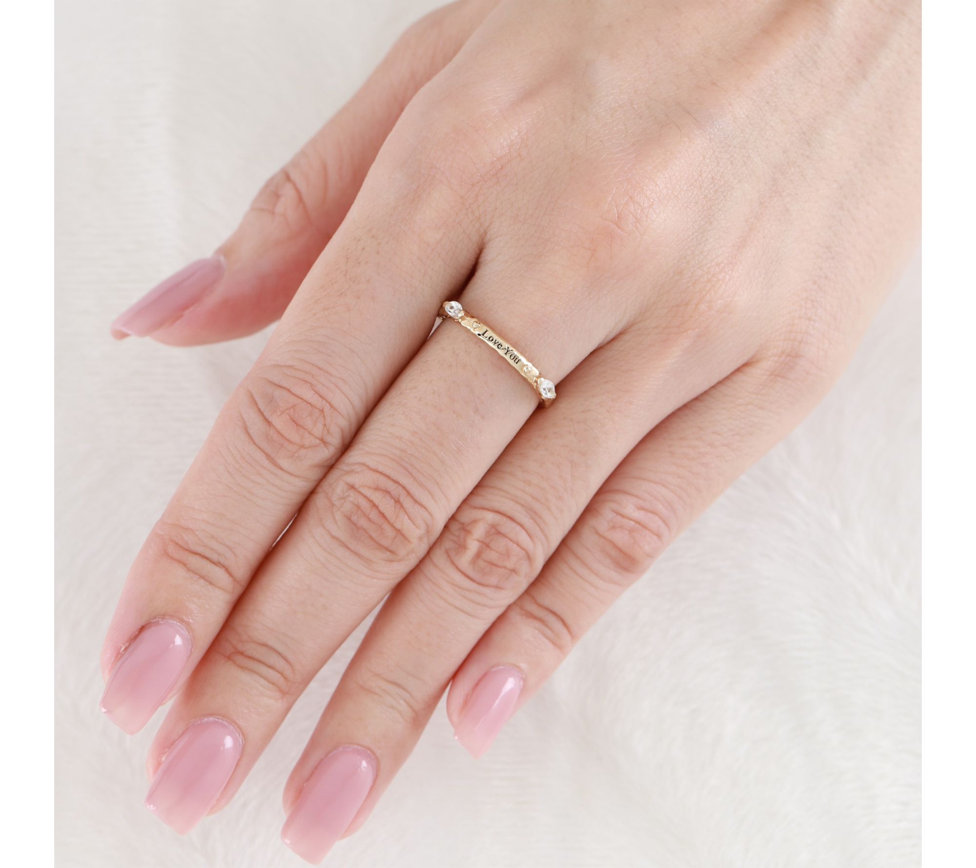 "Love You" inscription; stackable design; polished finish