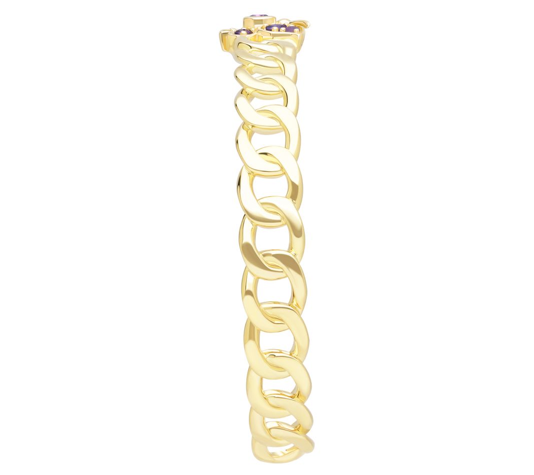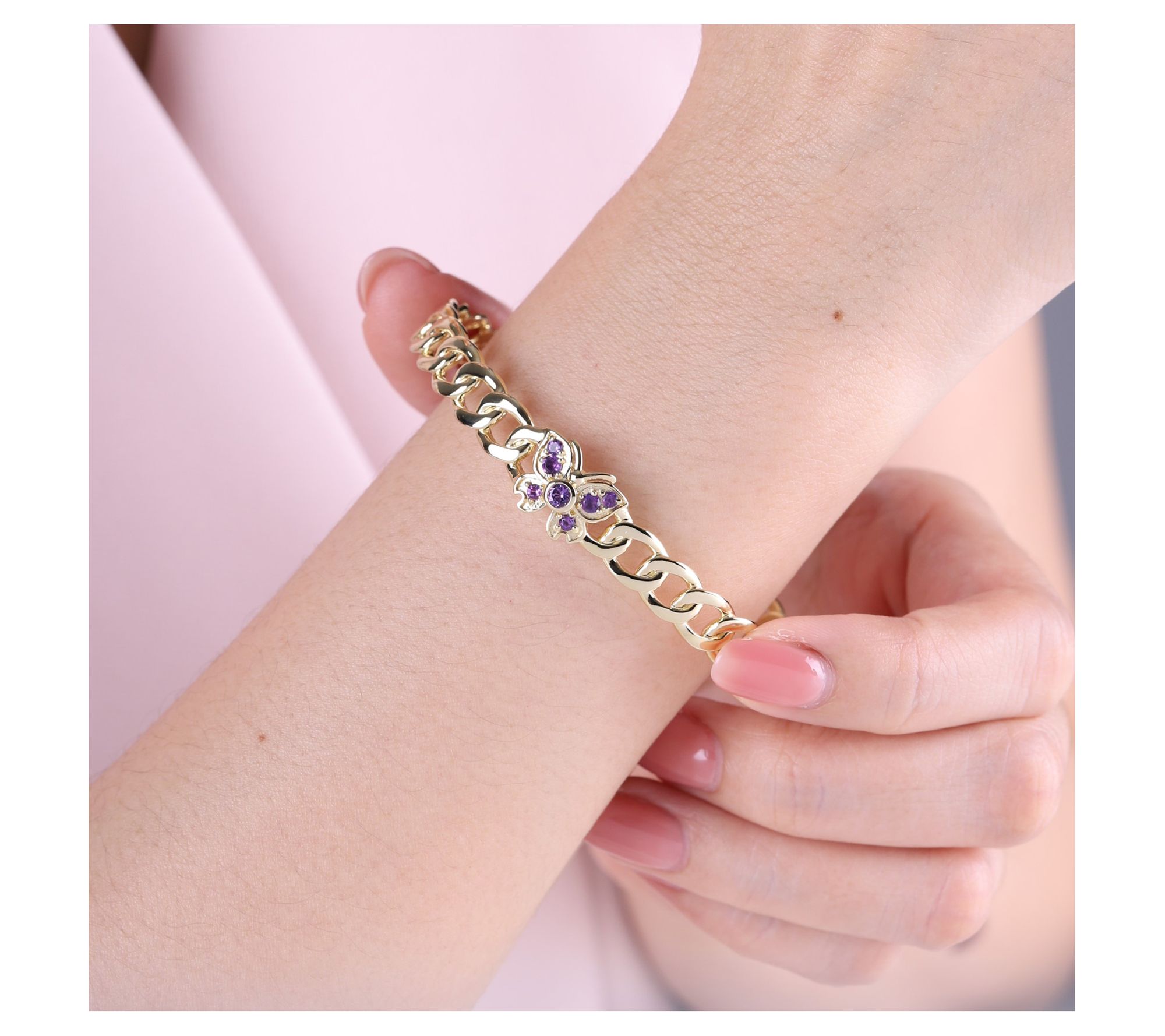• Round-cut amethyst stones; bezel and pave settings; open frozen link cuff; butterfly motif