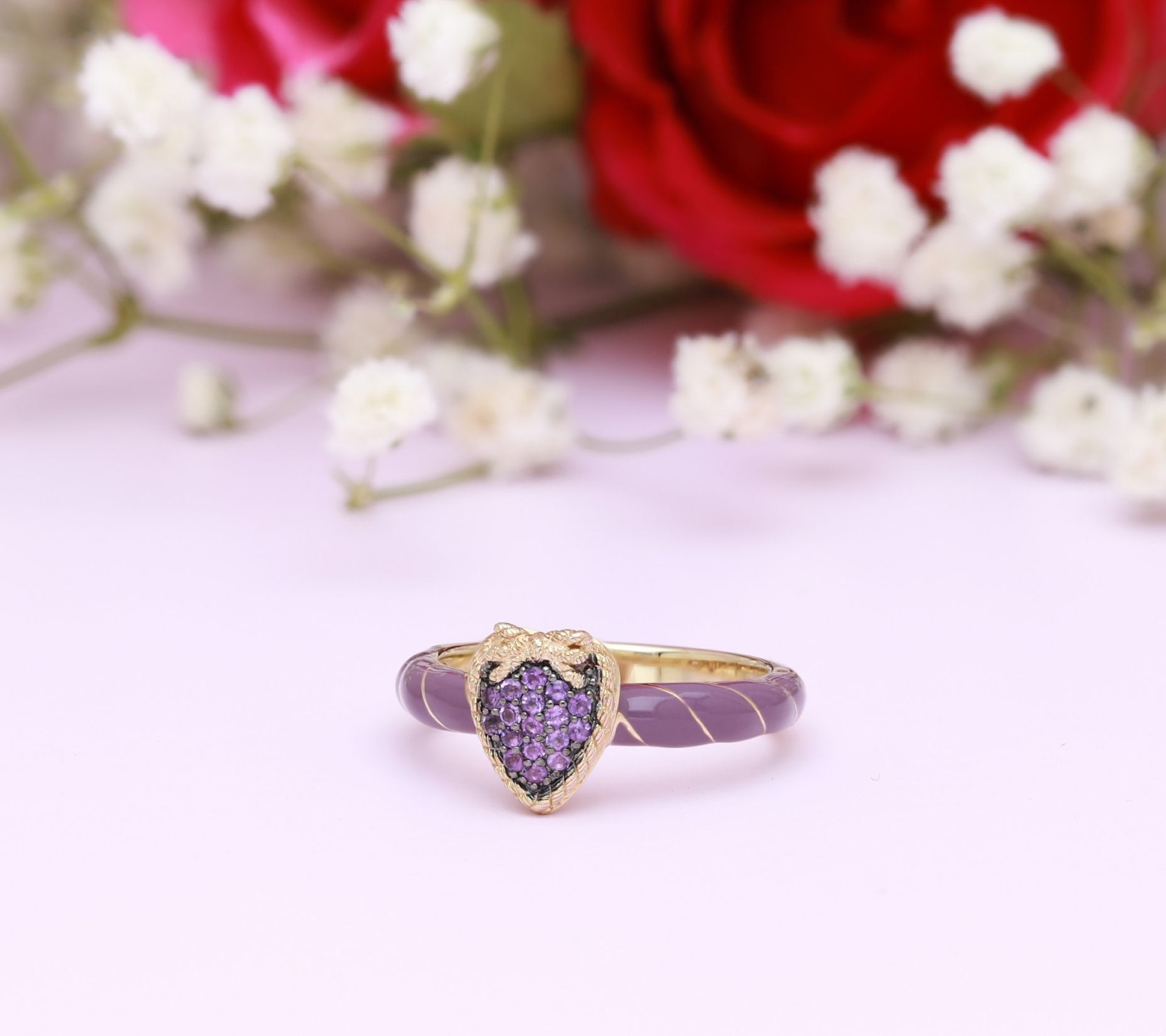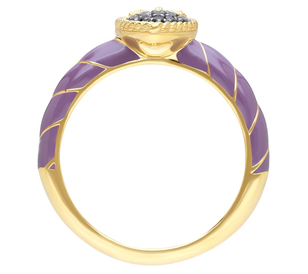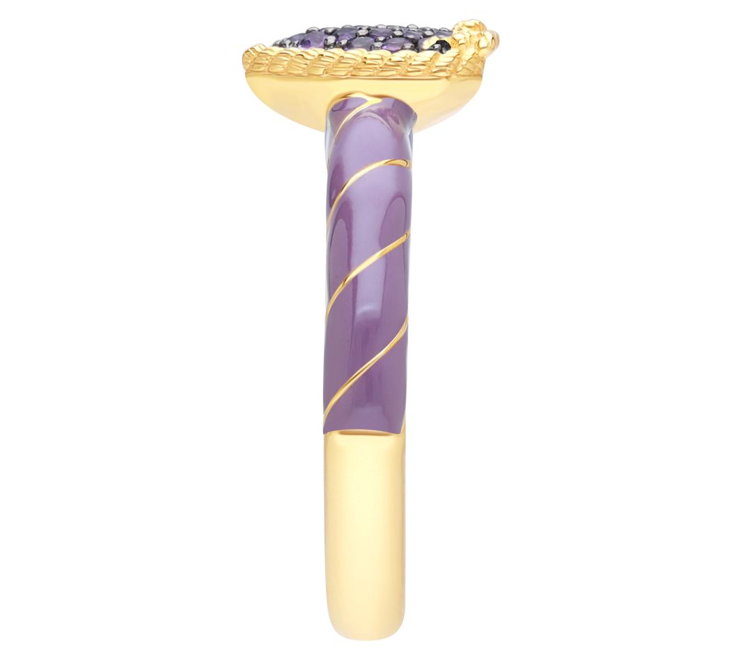 Pave amethyst stones in heart shape with twisted rope frame and bow; purple enamel and 14K gold-clad wraps around shank