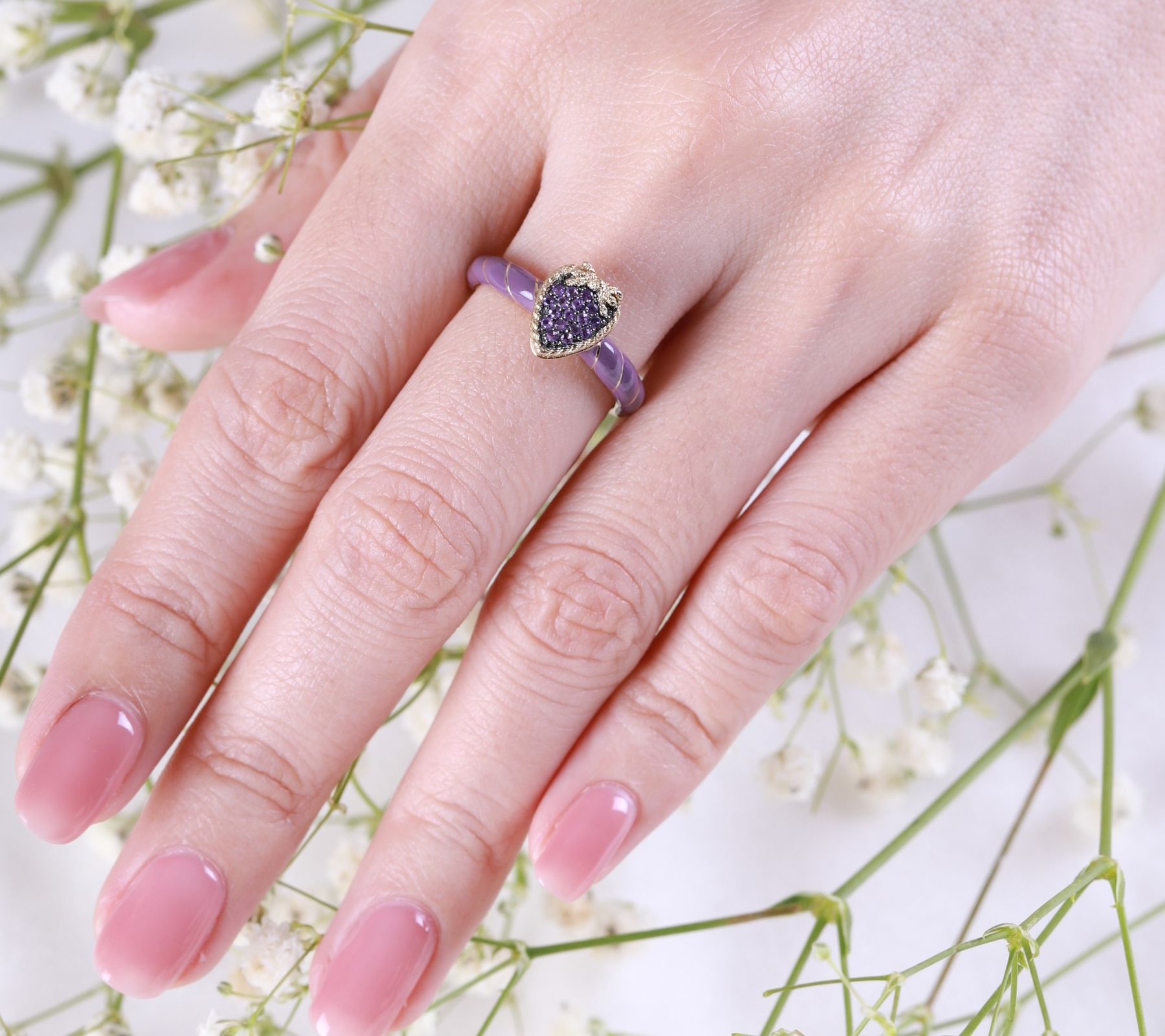Celebrate unbreakable bonds with this enchanting love knot ring. The intricate design, adorned with pave-set amethyst stones and accented by pastel purple enamel, symbolizes eternal love and connection. From the heart to the hand, this ring is a testament to cherished relationships and everlasting affection. From Goddaughters.