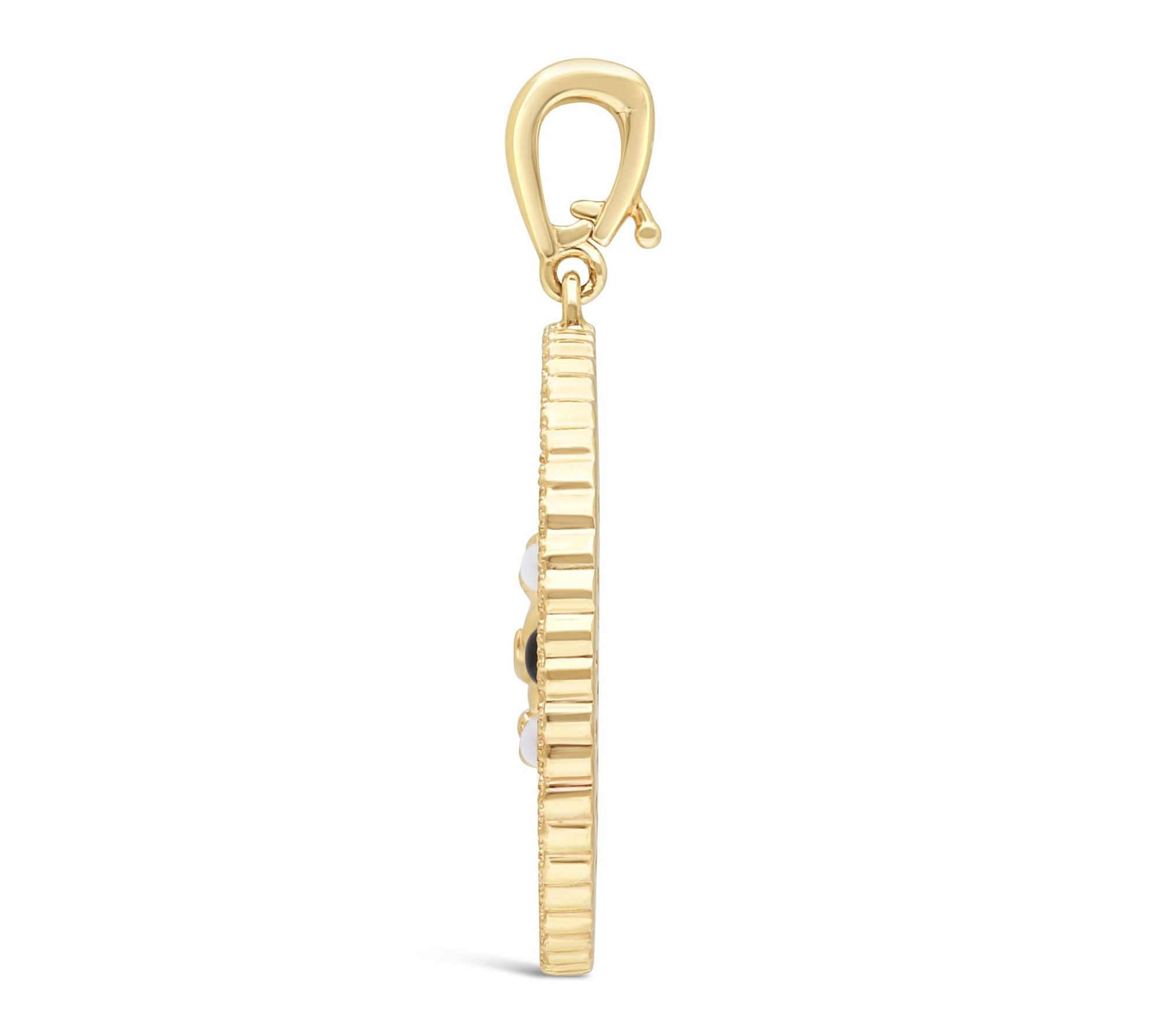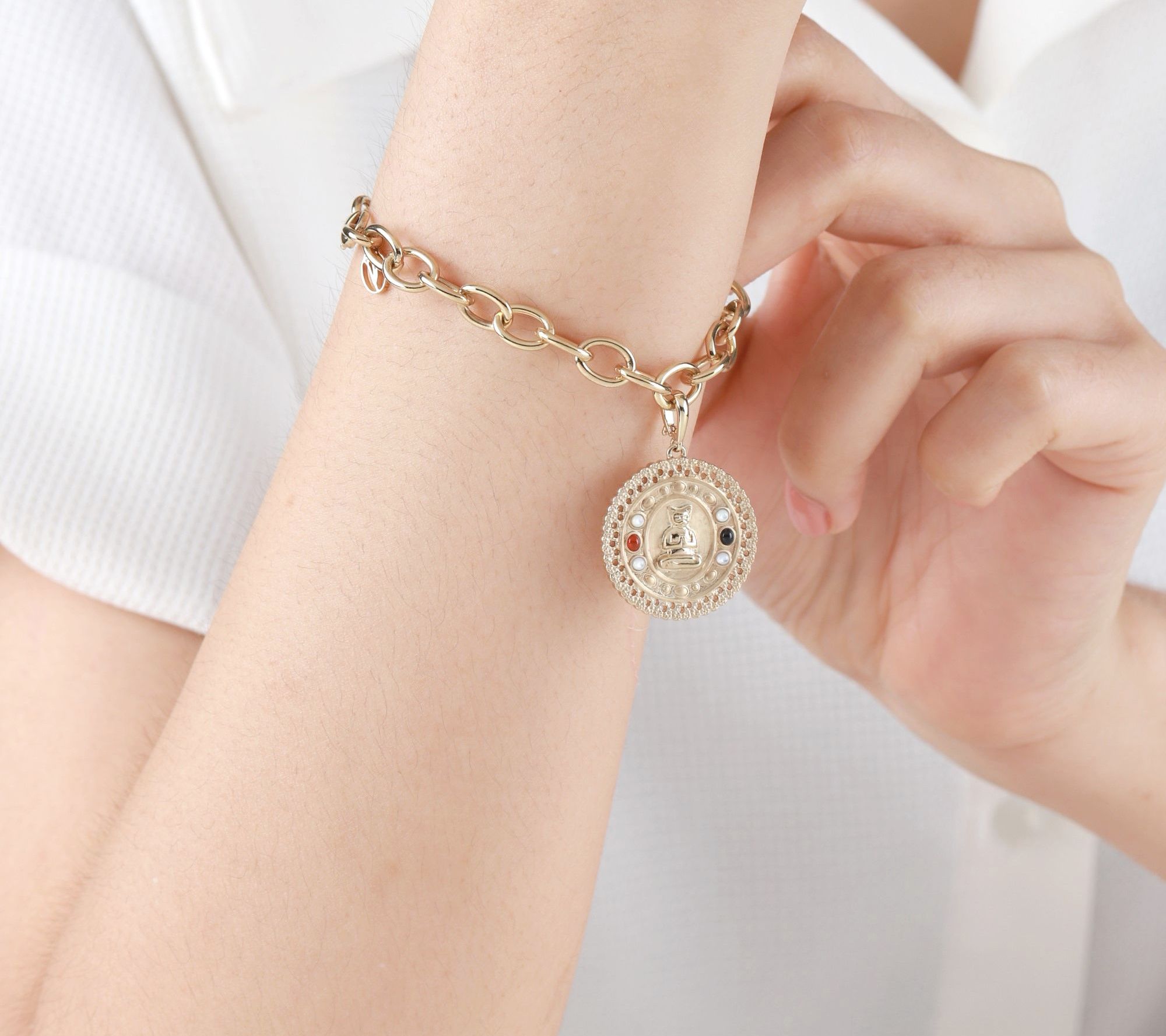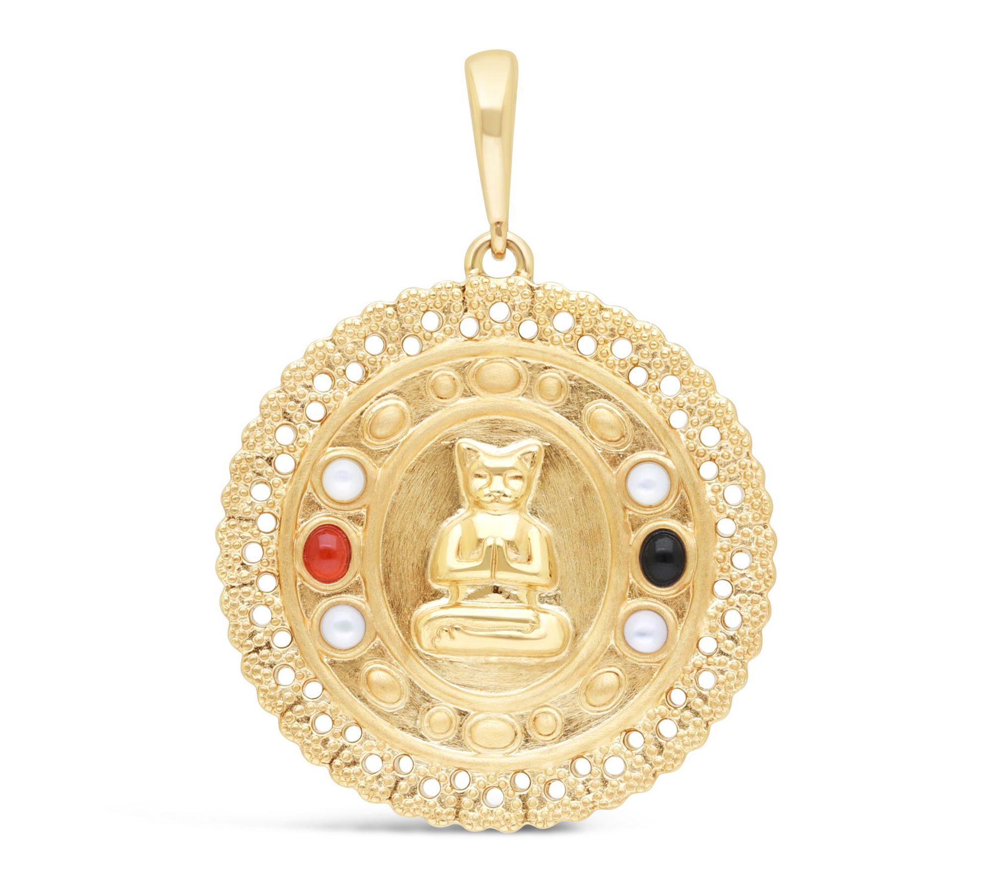 Embrace the tranquil energy of your feline companion with this 14K gold-clad gemstone enhancer pendant, featuring a Zen cat medallion inlaid with carnelian, onyx, and mother of pearl. Whether gifted to a cherished goddaughter or worn as your personal reminder of composure and connection, this piece radiates calm and playful confidence every day. From Goddaughters.