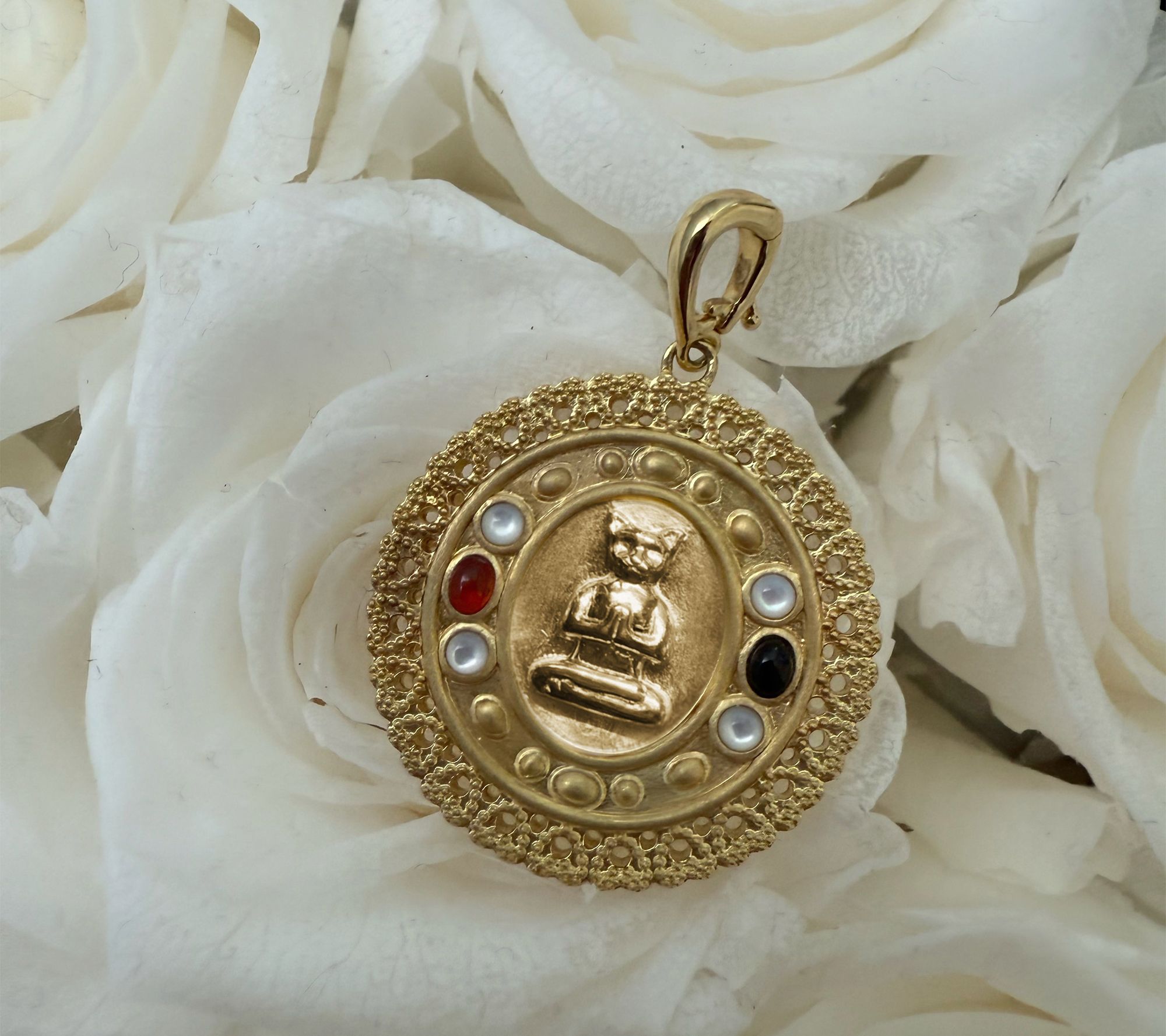 Design details: Zen cat medallion; inlaid with oval and round carnelian, onyx, mother of pearl; polished finish