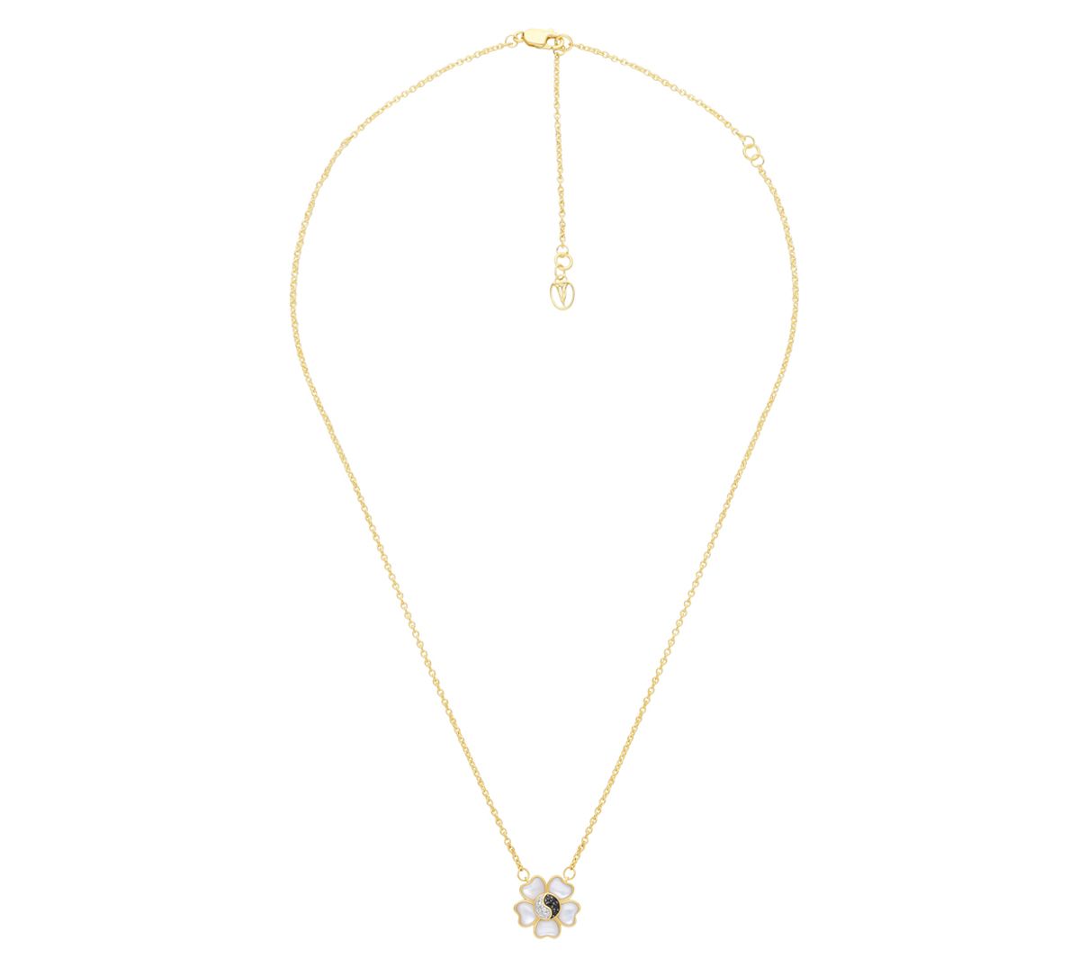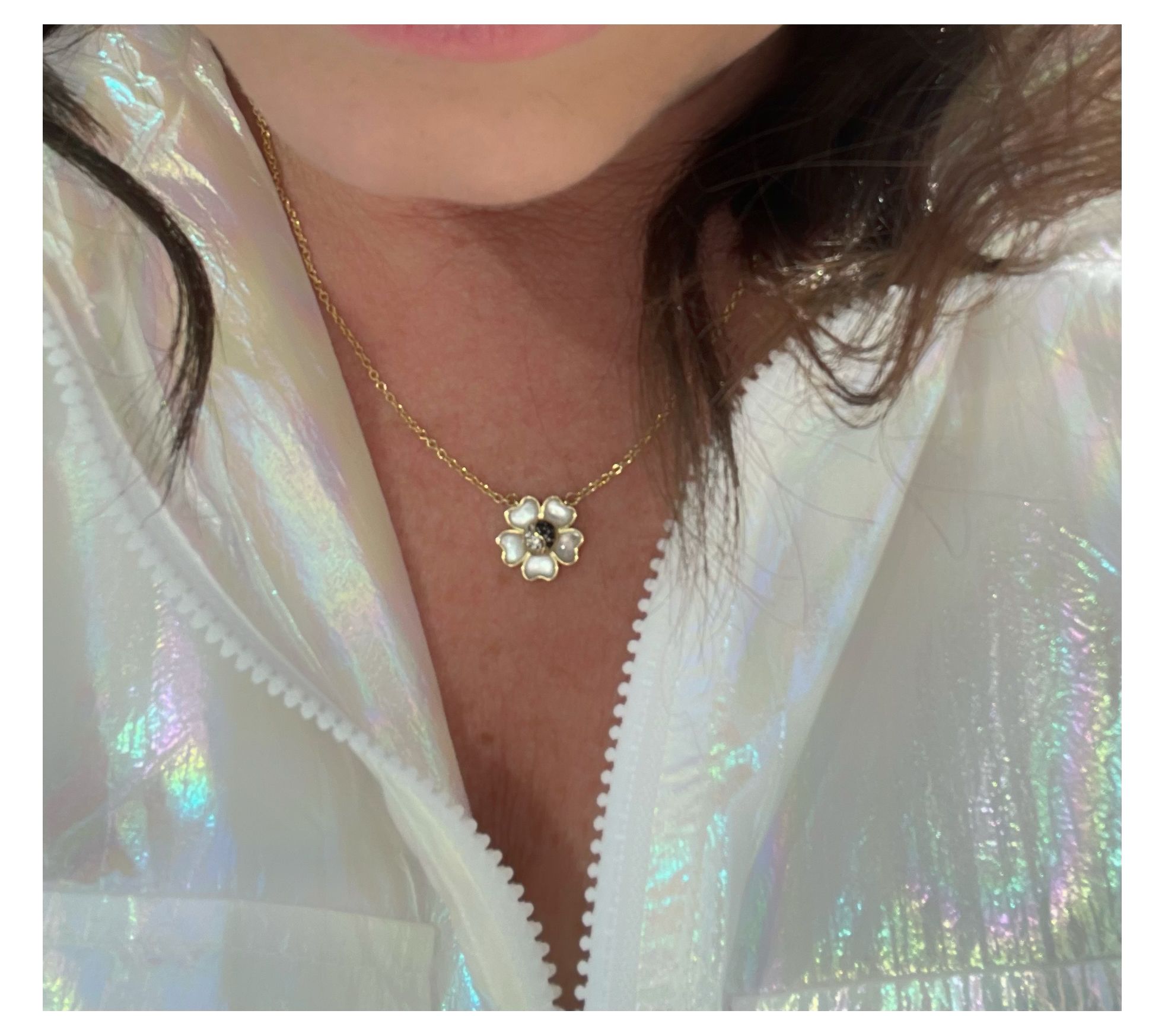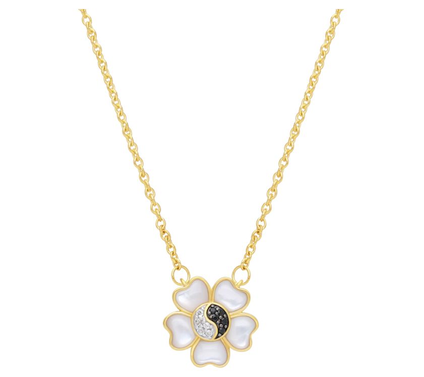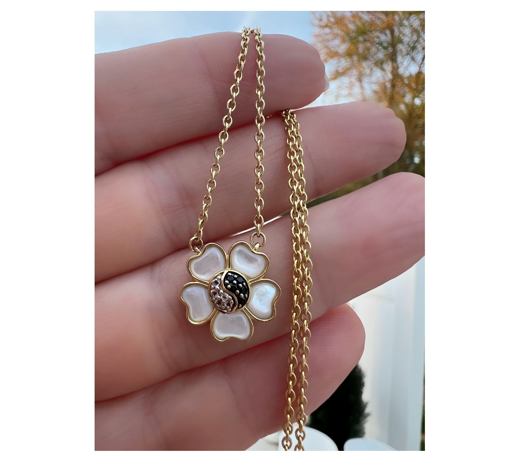- White mother-of-pearl flower petals; center yin yang in pave-set white topaz and black spinel