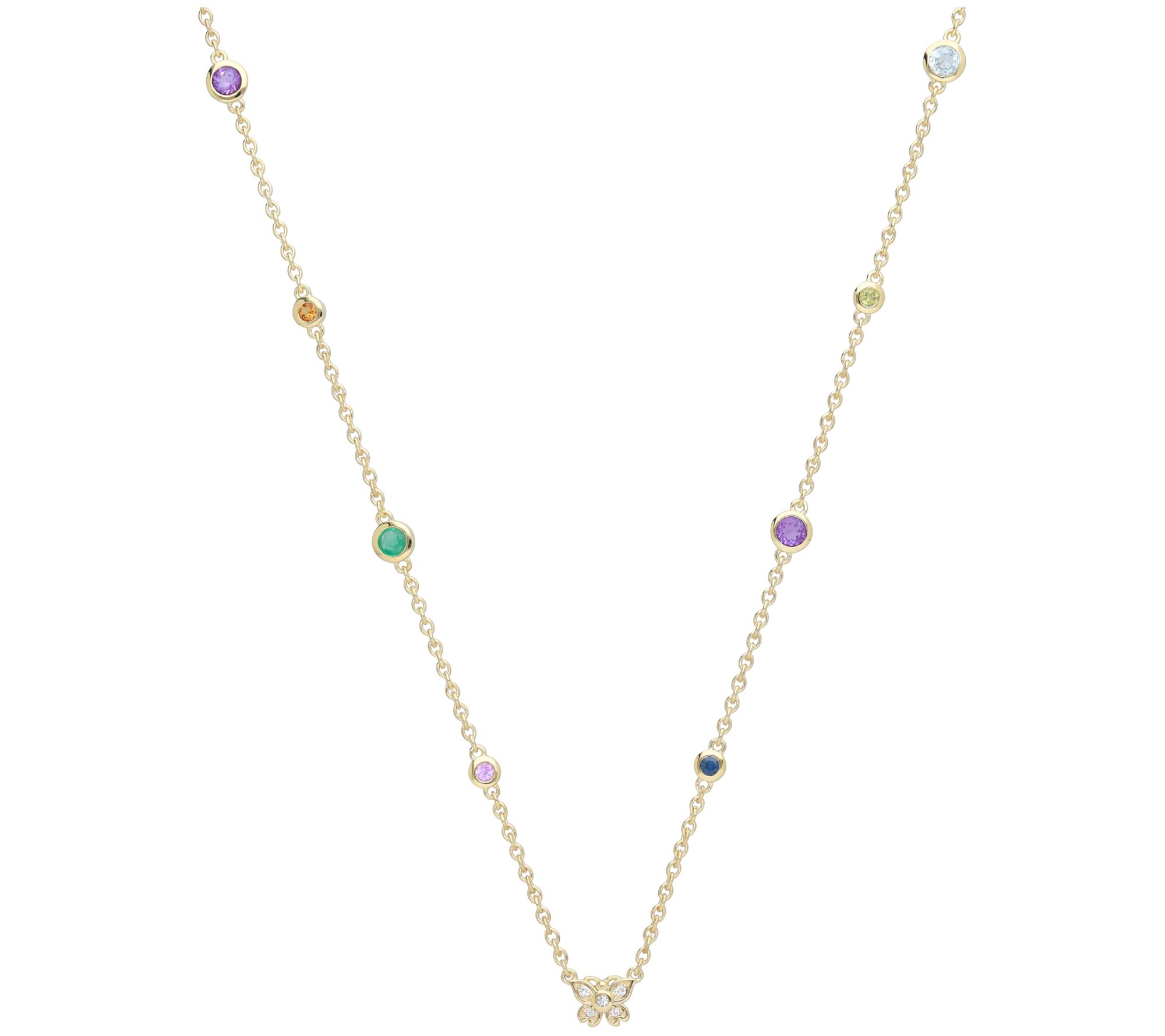 What a delightful way to refresh your look! This charming necklace is accented with colorful gemstone stations while a sparkling white topaz-studded butterfly sits daintily in the center. From Goddaughters.