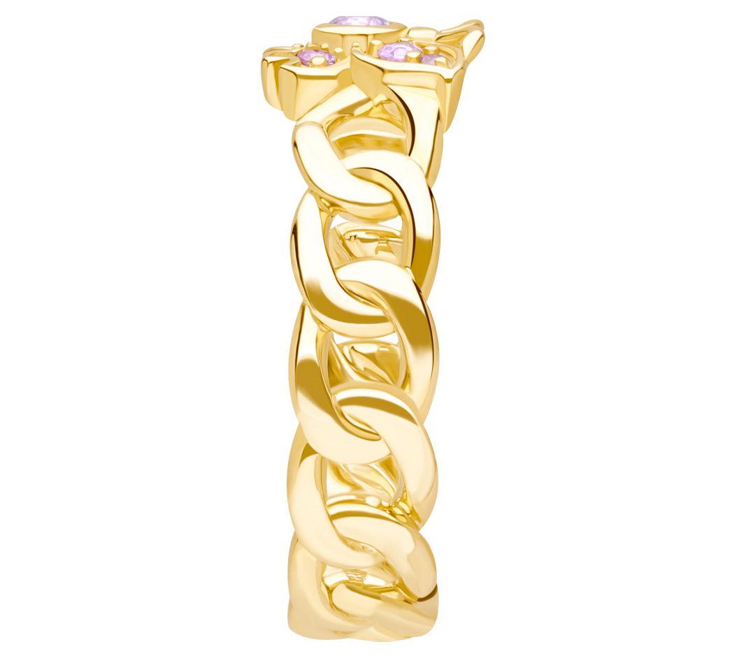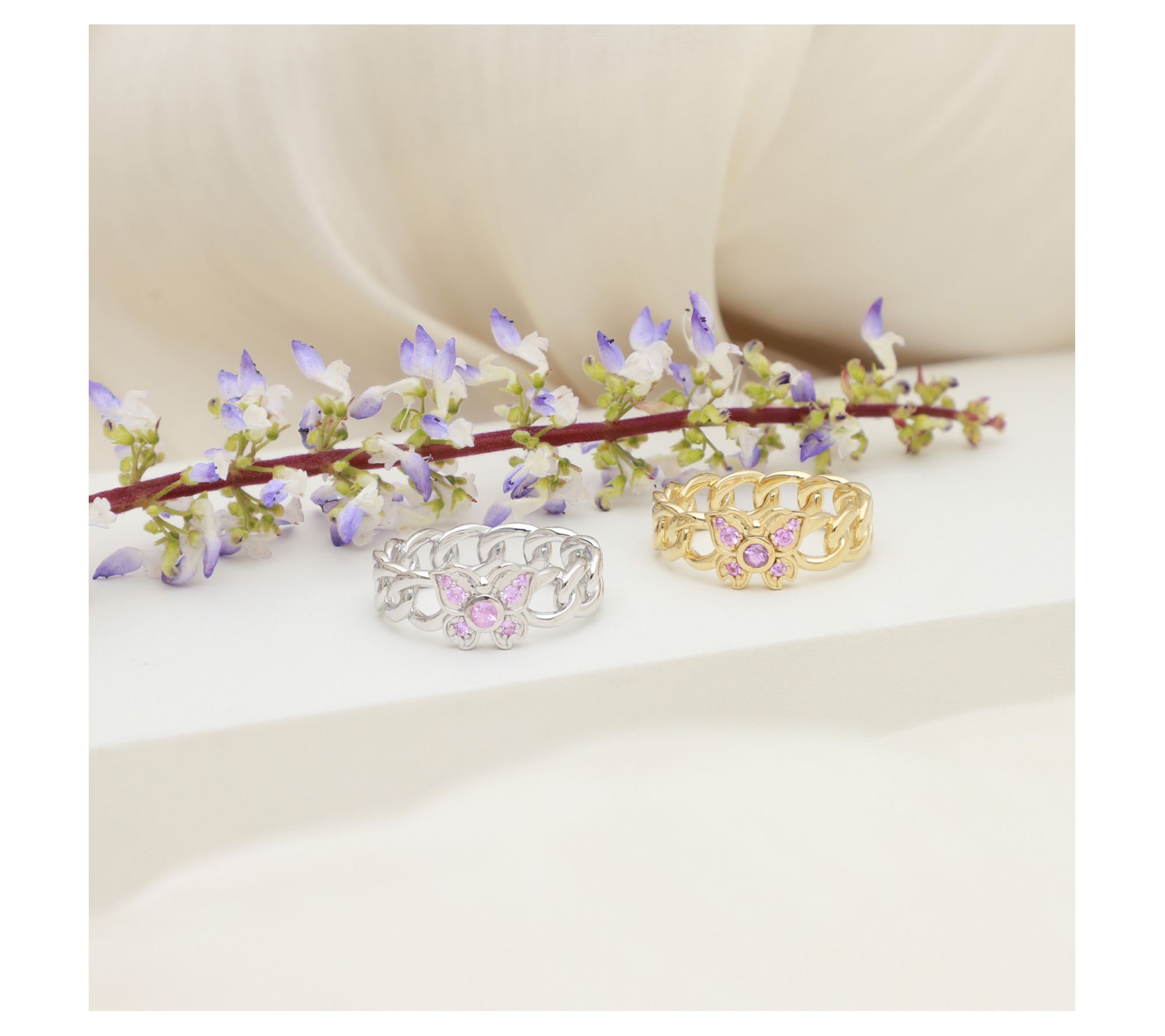 Cherish your goddaughter with this enchanting butterfly ring, adorned with pink sapphire gemstones in a delicate butterfly design, complemented by a frozen chunky link band. From Goddaughters.