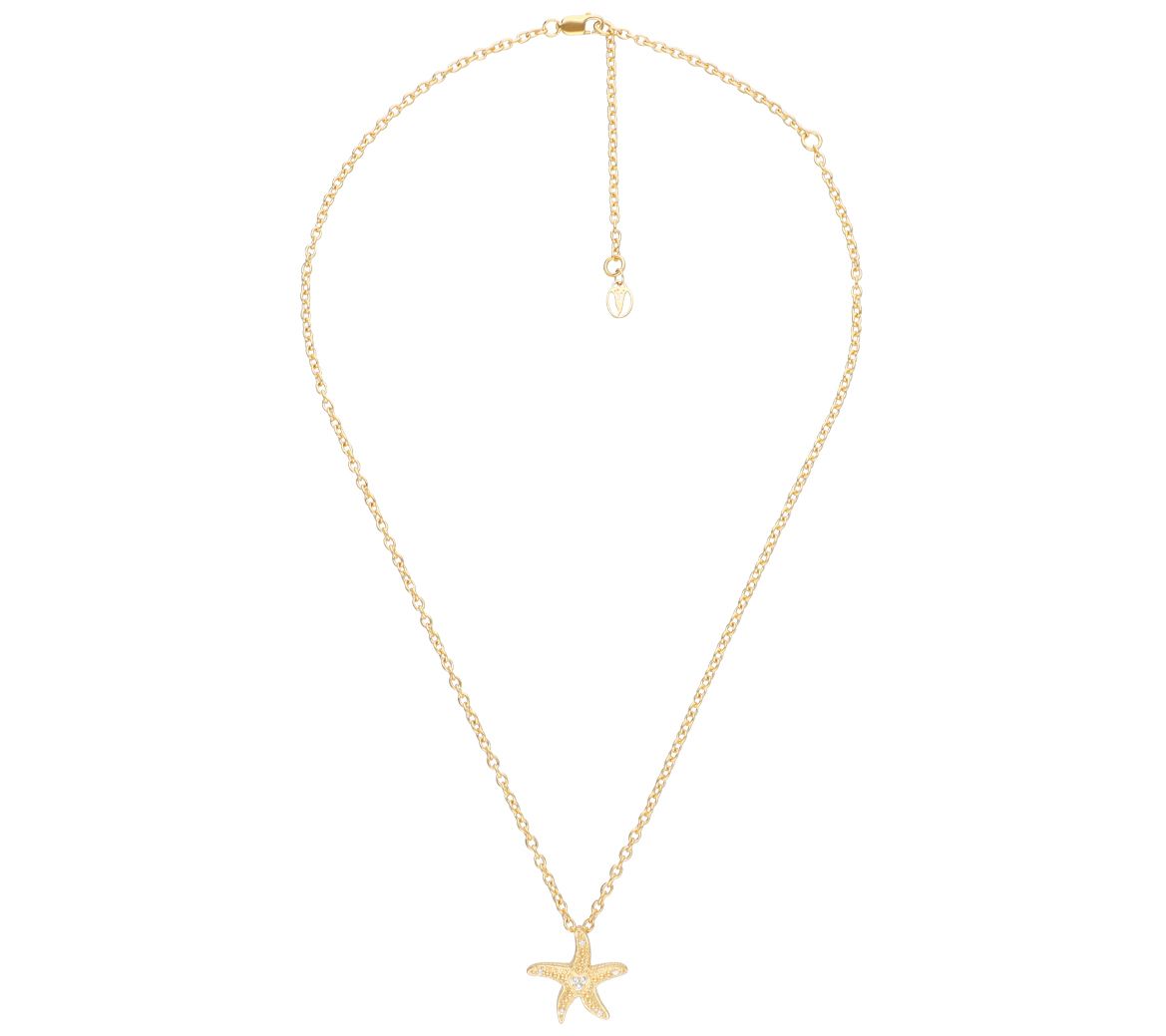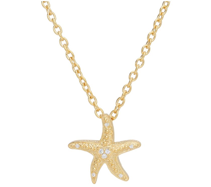 Goddaughters Sterling Silver 14K Yellow Gold Clad Starfish Necklace.Starfish has a small heart in center with White Sapphire stones insideheart. White Sapphire stones on each arm.;Necklace & Pouch;Necklace &Pouch;Necklace & Pouch