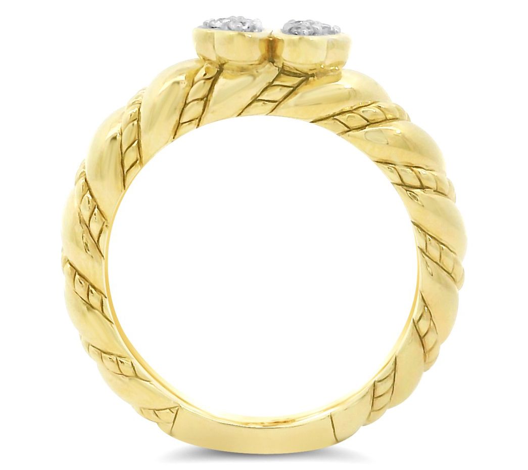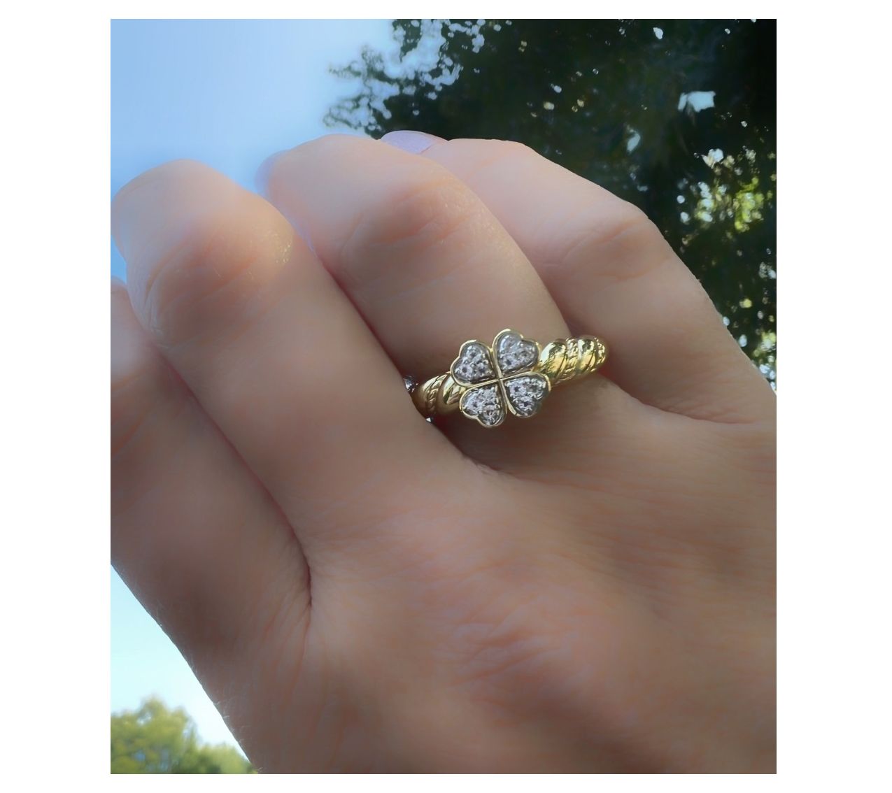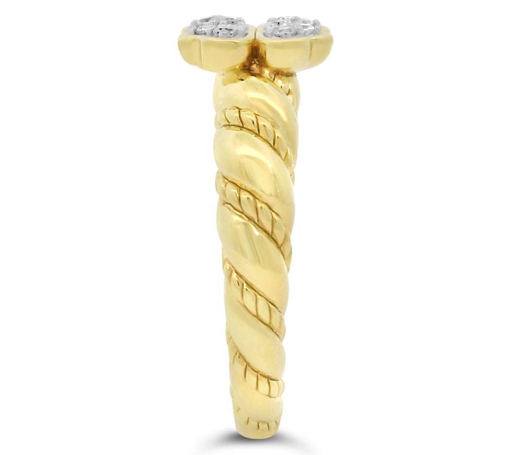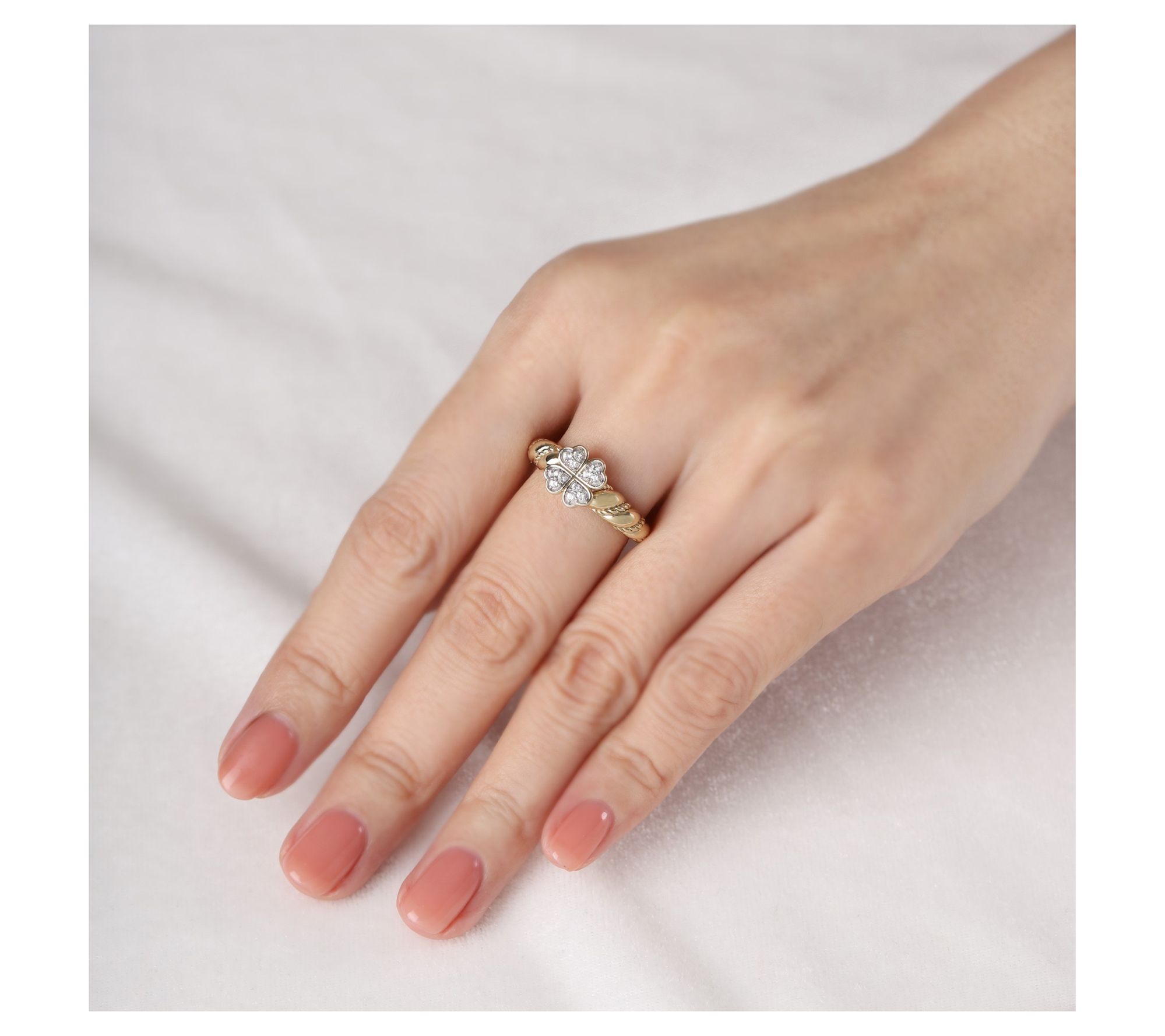 Four heart shapes combine to fashion a clover; round, pave-set white topaz gemstones; twisted design on band; polished finish