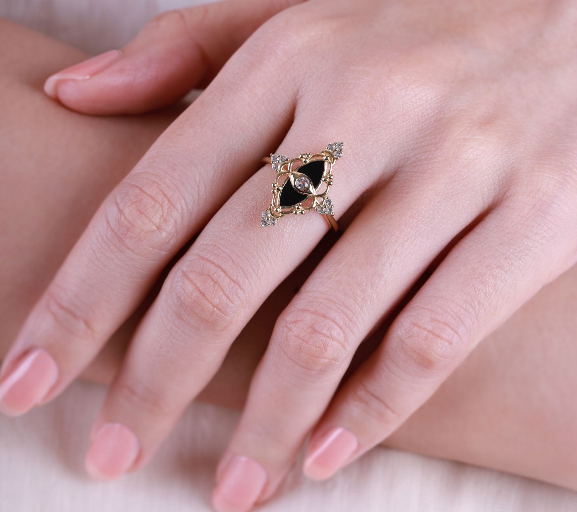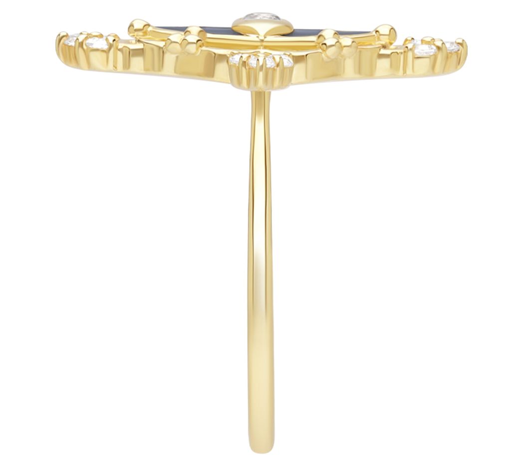 • Design details: Open scalloped frame around black enamel; bezel-set white topaz stone in center; three round, pav-set stones at four corners