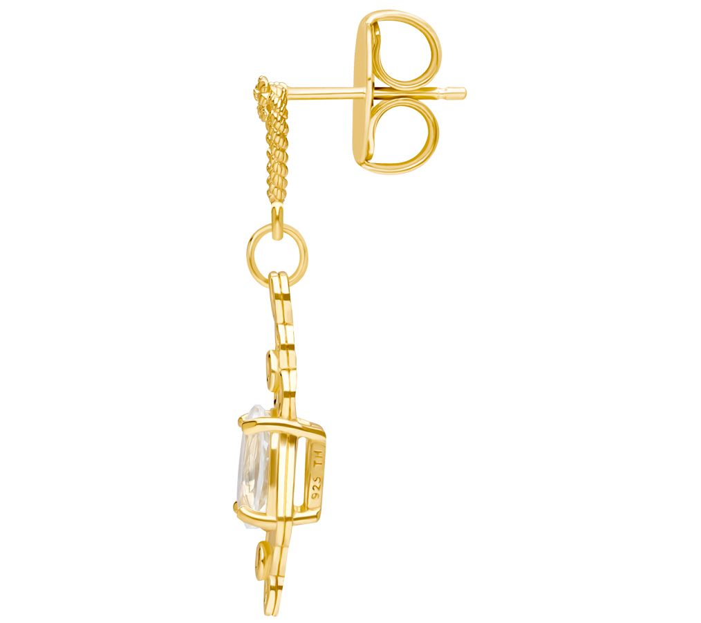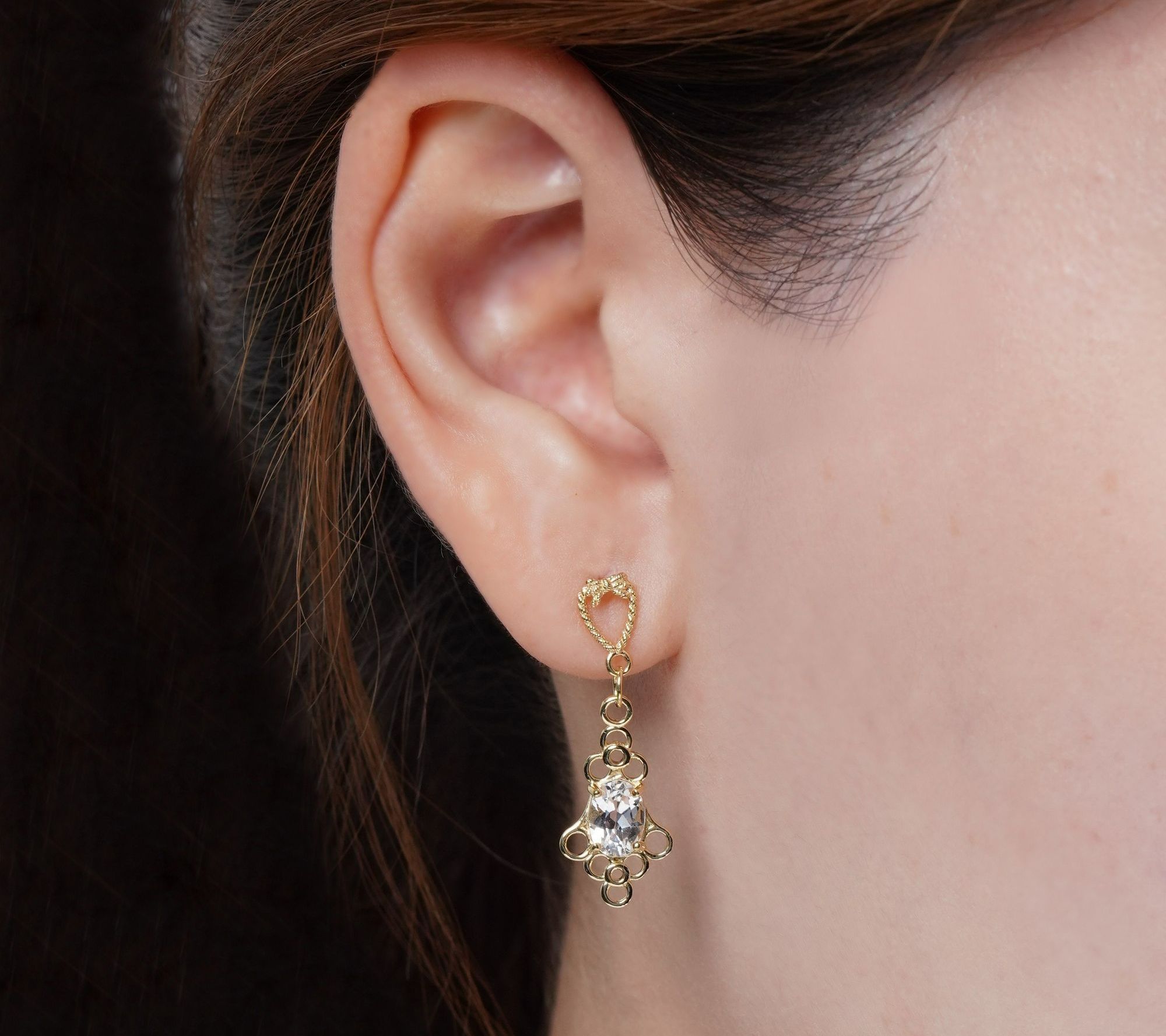 Open-circle chandelier design with prong-set oval-cut white topaz stone hanging from love knot heart at top