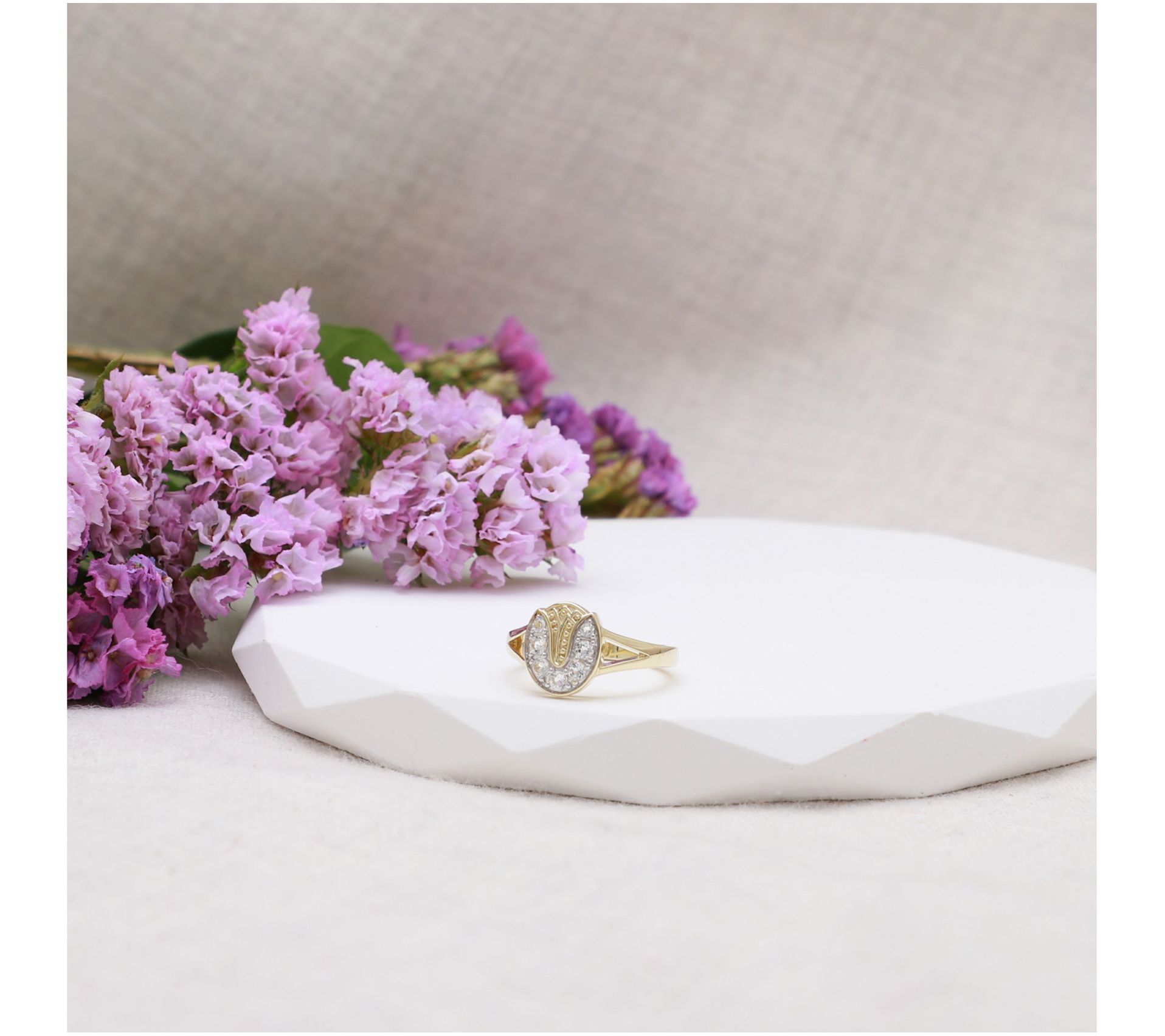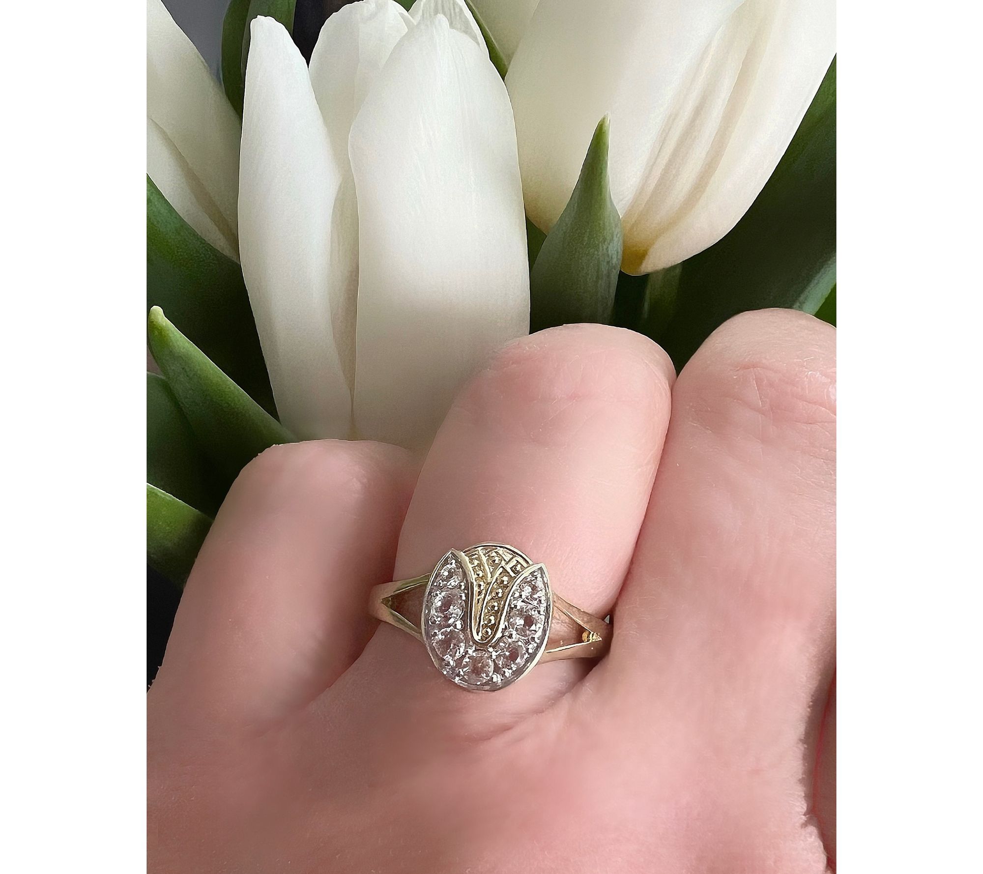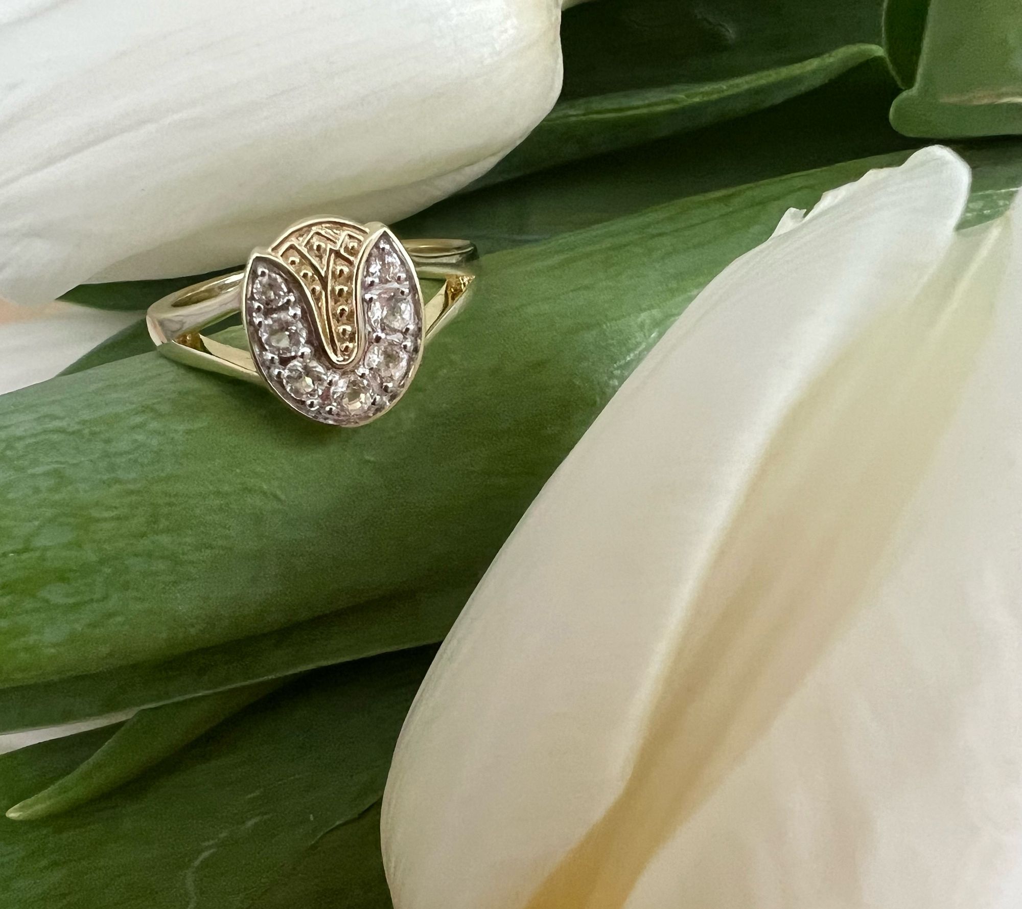 Celebrate resilience and beauty with the Tulip Ring, a symbol of strength and grace. This exquisite piece features a pave-set white topaz in a tulip design, crafted from 14K gold-clad sterling silver, making it a meaningful gift that shines with determination. From Goddaughters.